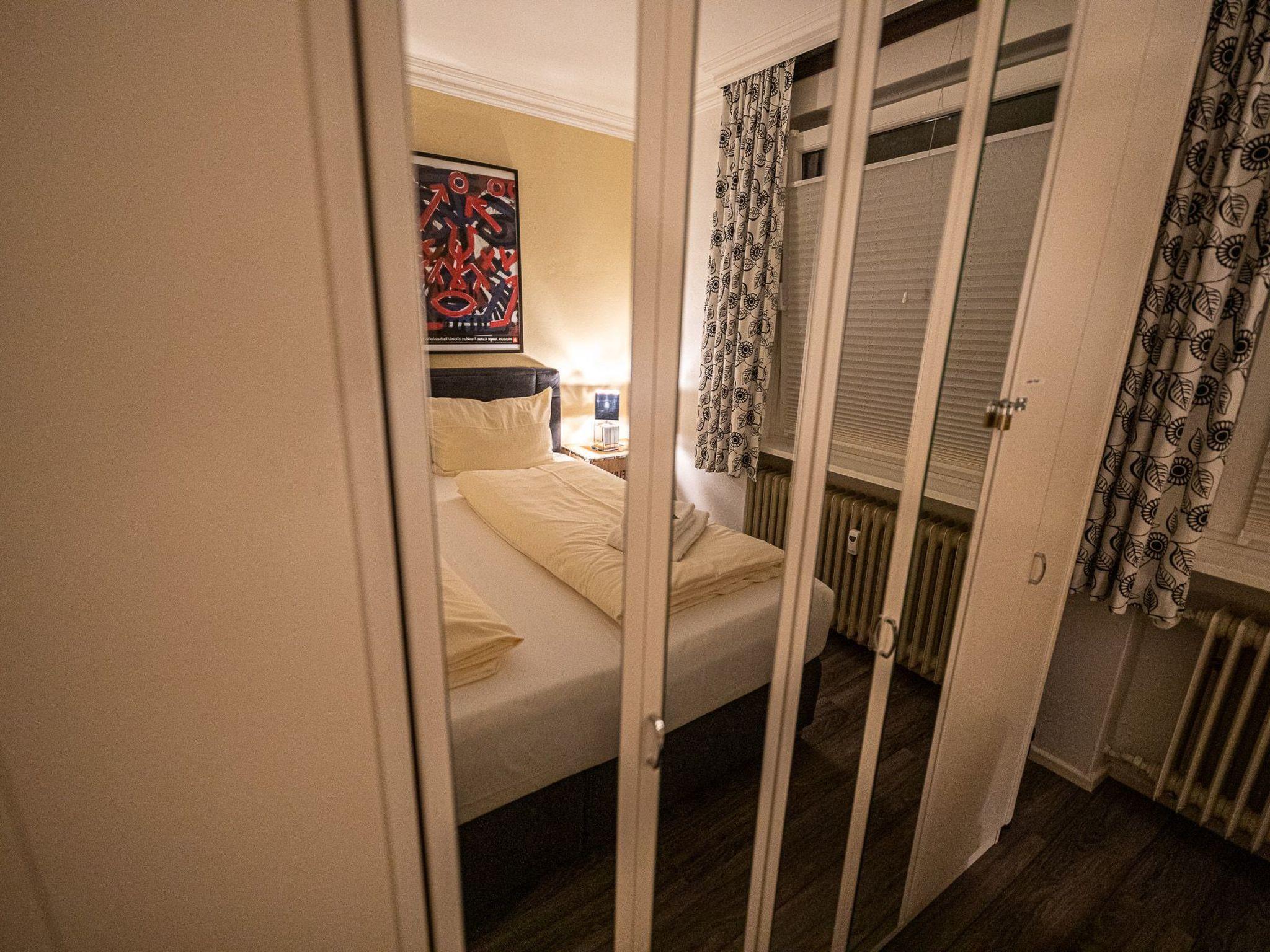 In the bedroom you will find a cosy large box-spring bed, 180 x 200, and a large wardrobe with mirrored doors.