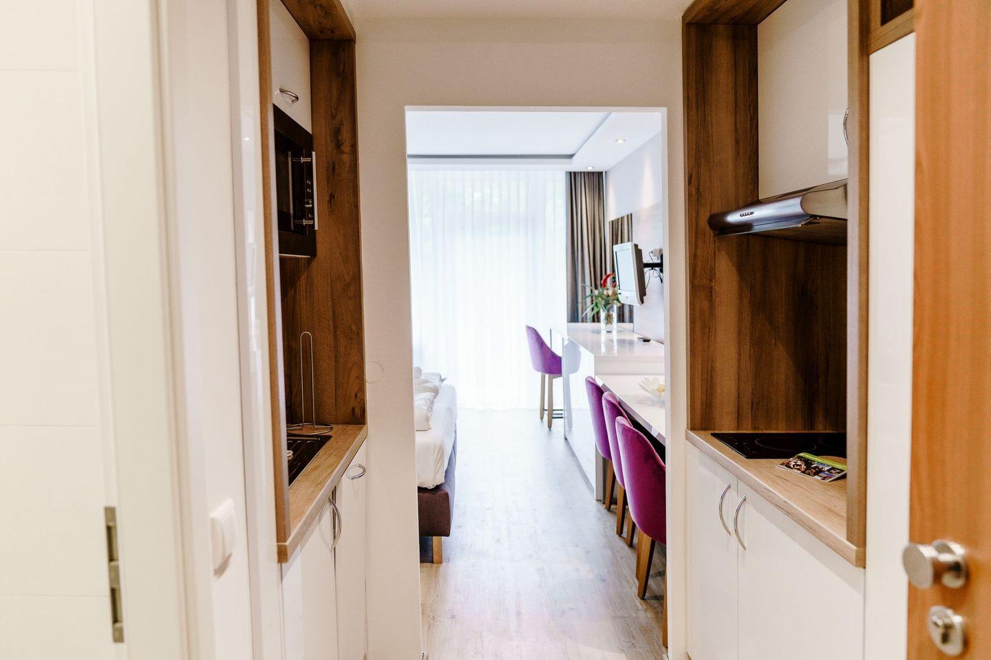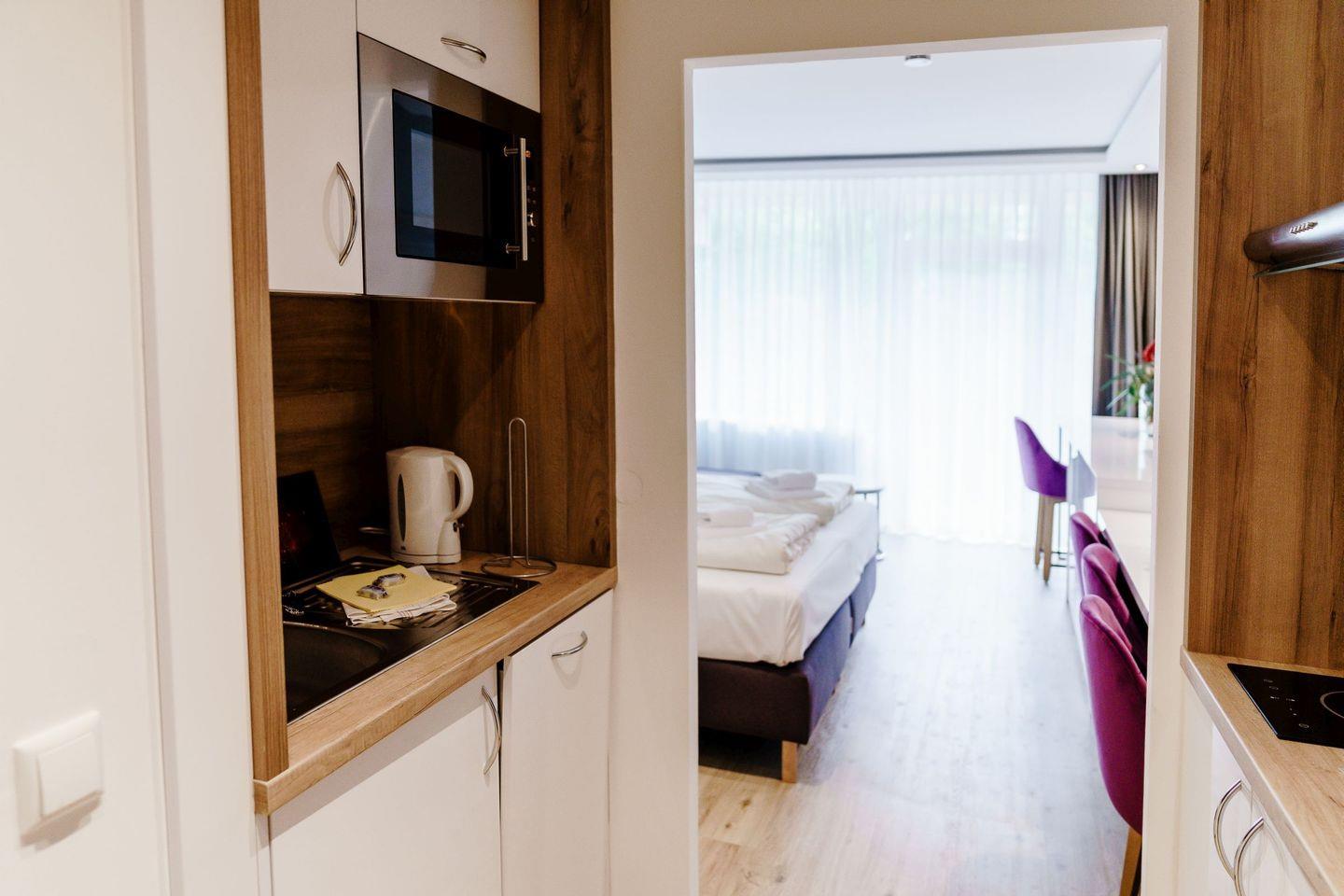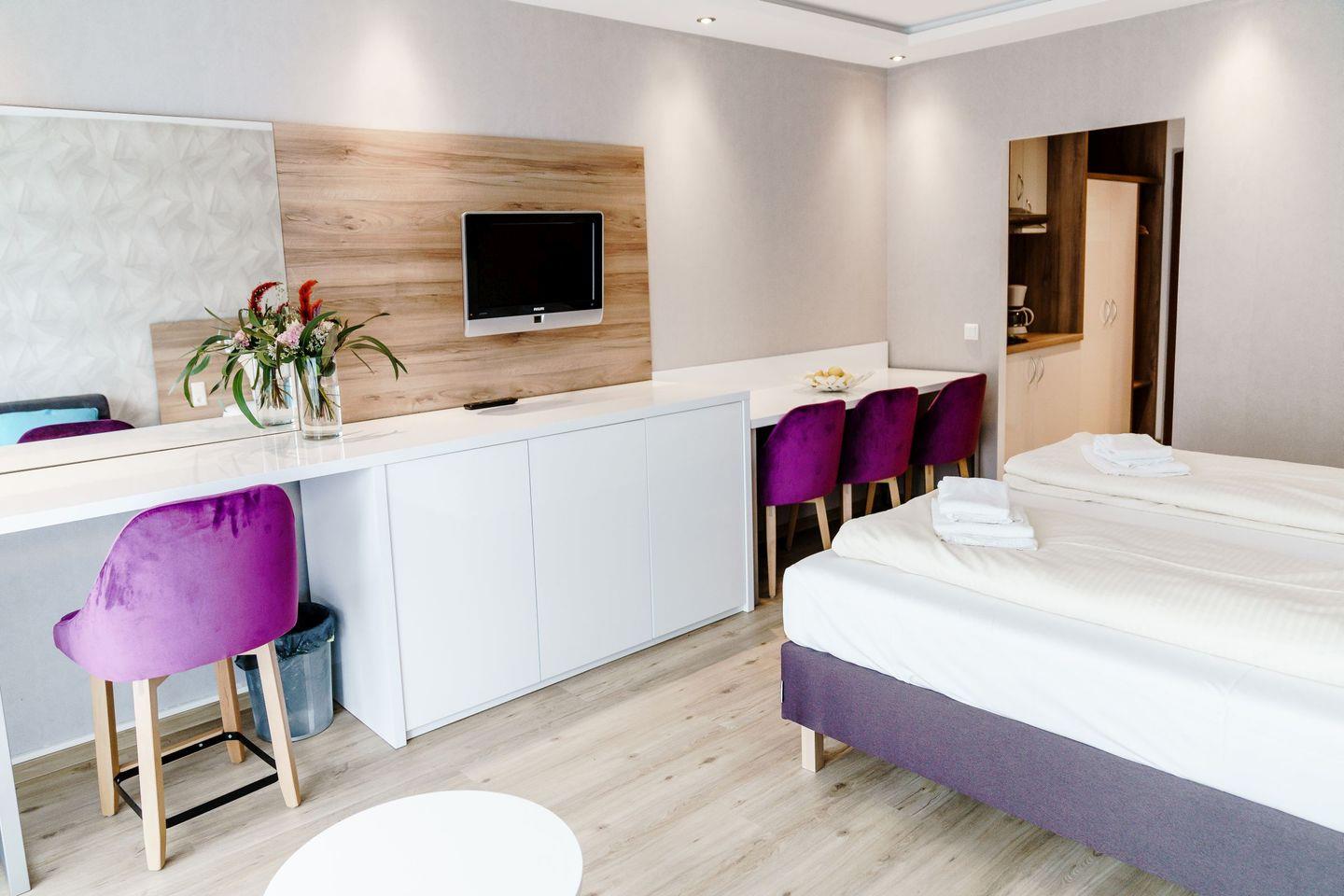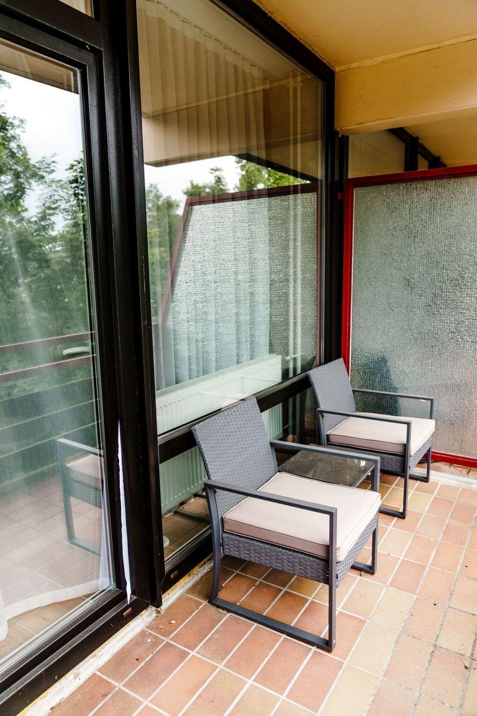Die voll ausgestatteten Ferienwohnungen sind geprägt von einer harmonischen Farbkombination in der Sie sich garantiert wohlfühlen werden und es Ihnen an nichts fehlen wird. Vom Balkon aus genießen Sie eine Panoramaaussicht, wahlweise auf den See oder den berühmten Bocksberg. Die bequemen Balkonmöbel laden zum Verweilen mit ihren Liebsten ein.