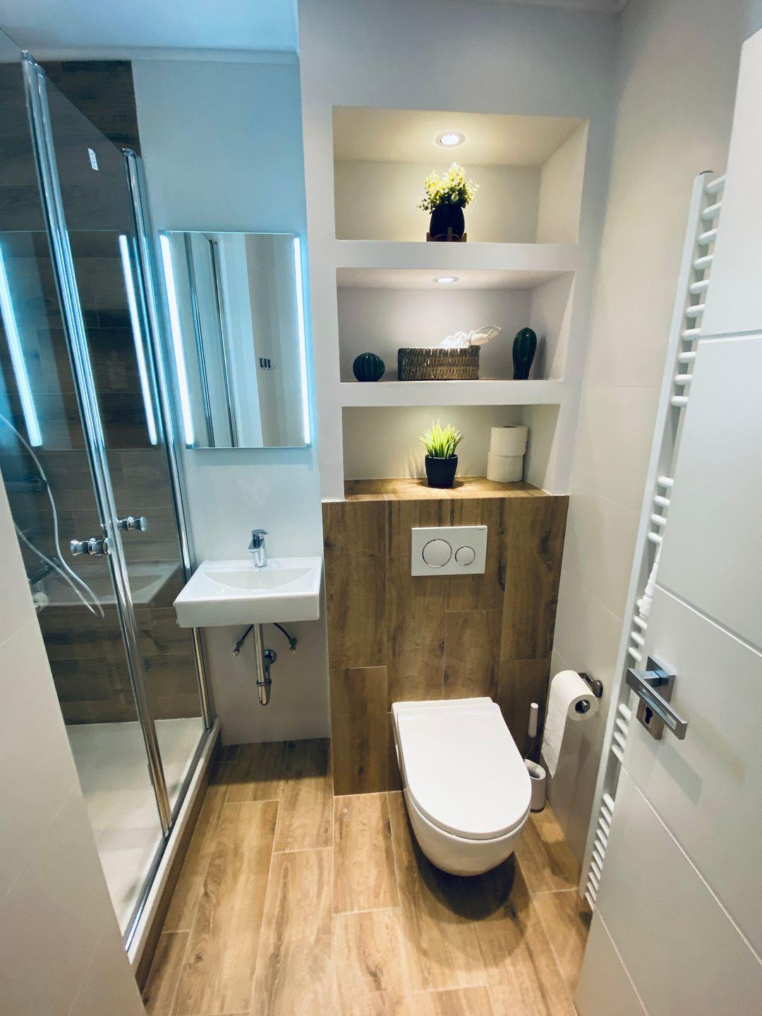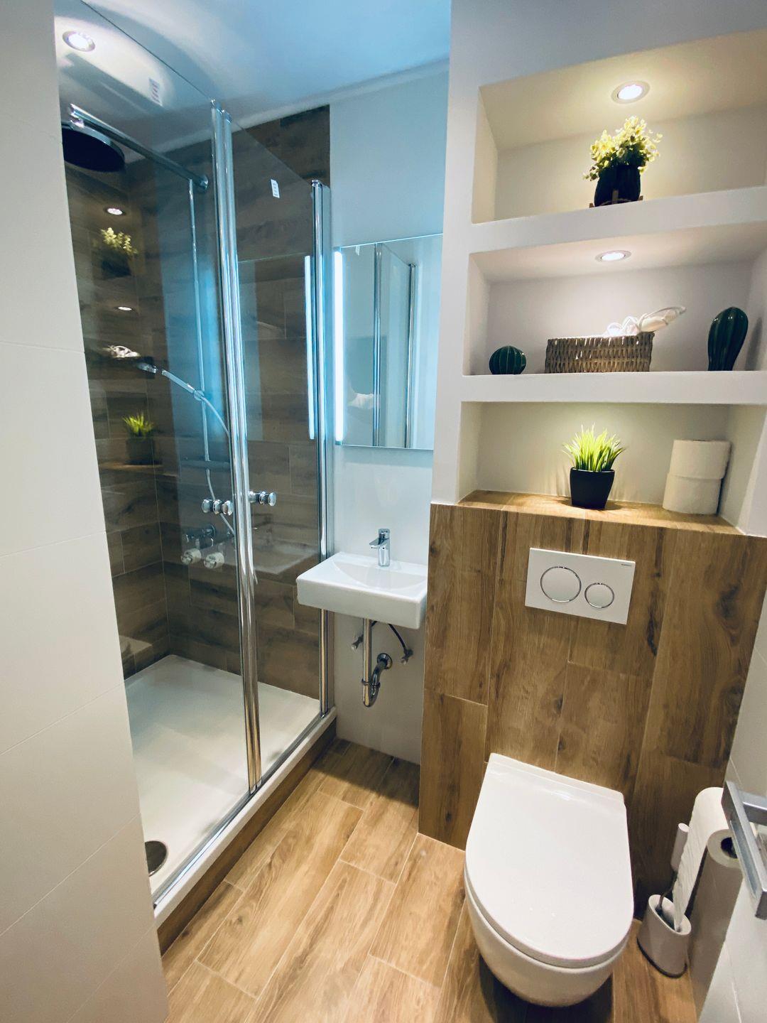 Das Badezimmer ist neben einer Dusche unter anderem auch mit einem Fön ausgestattet.