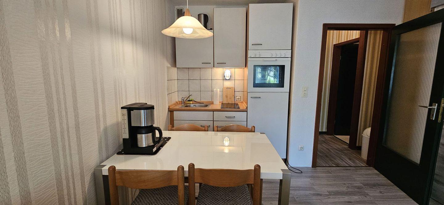 Zu der gemütlich eingerichteten Ferienwohnung gehören zwei Schlafzimmer, ein Badezimmer mit Dusche sowie ein Wohn-/ Essbereich mit einer offenen Küche die mit Kühlschrank, 2-Platten-Herd, Backofen, Kaffeemaschine, Wasserkocher und vielem mehr ausgestattet ist.
