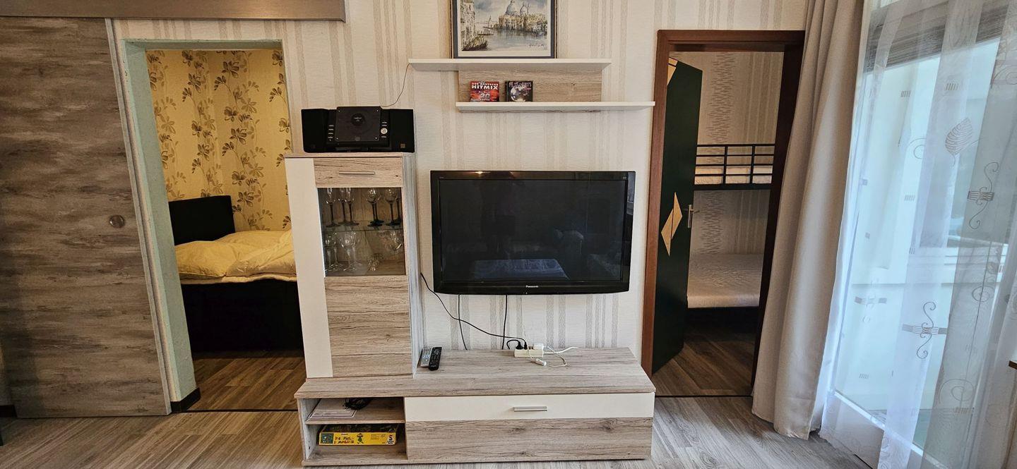 Die gemütliche Sitzecke mit Sofa und Flachbildfernseher lädt zum Entspannen ein.