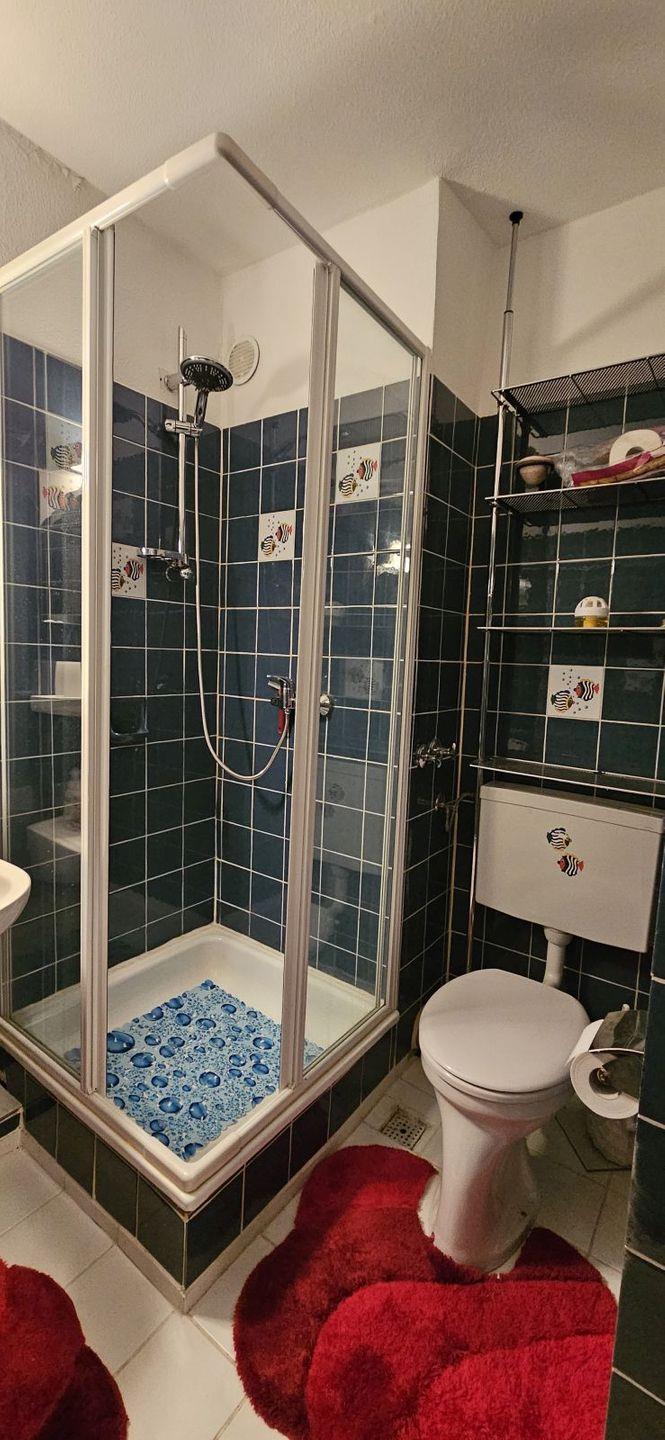 Das Badezimmer hat eine Dusche und einen Spiegelschrank.