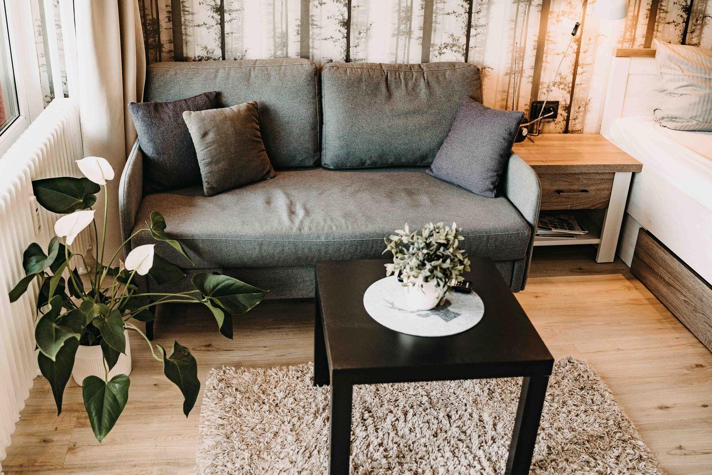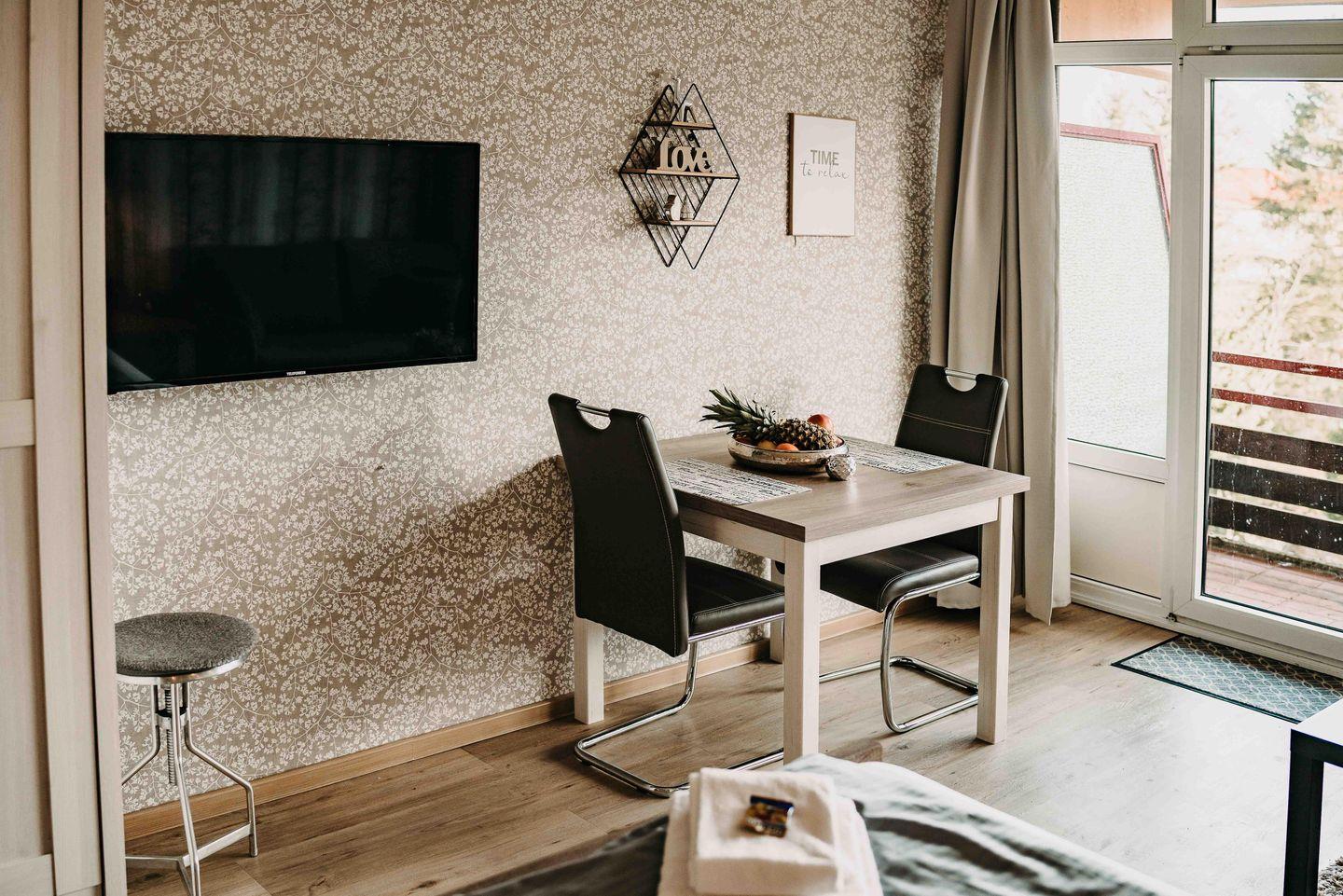 Das gemütliche Doppelbett sowie eine Schlafcouch sorgen für erholsame Nächte. Ein Fernseher steht zur Unterhaltung bereit. Die Pantryküche bietet alles um gemeinsame Mahlzeiten zuzubereiten. Genießen Sie von Ihrem Balkon aus den Blick auf den Bocksberg und lassen Sie den Tag ausklingen.