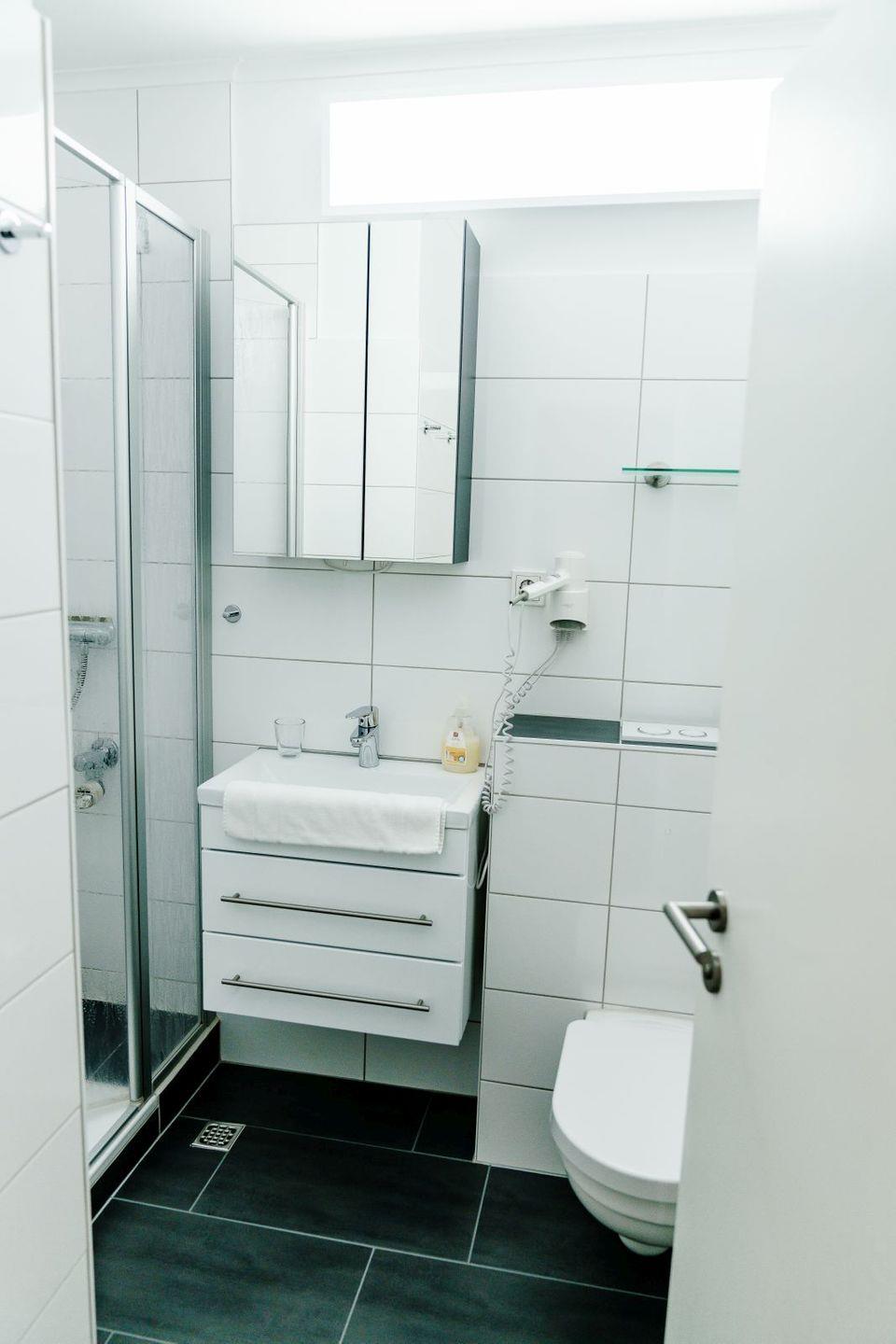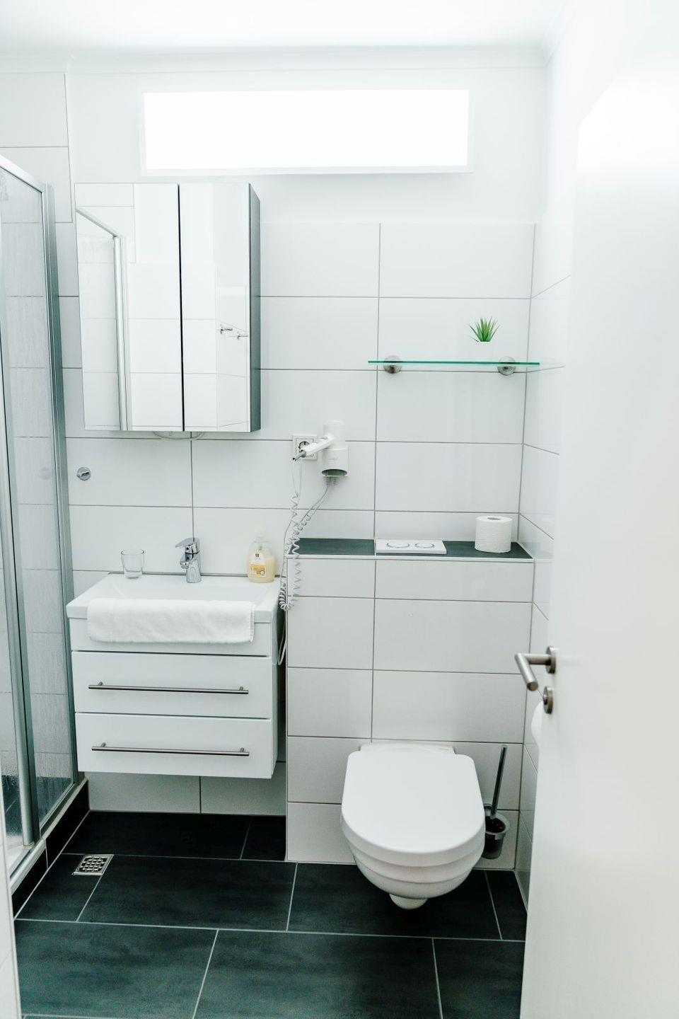 - Bad mit DU/WC, Fön, Kosmetikspiegel und Hygieneartikel