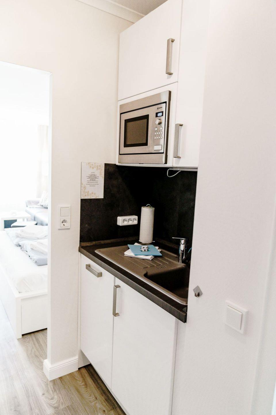 Die offene Küchenzeile ist mit Mikrowelle, 2-Platten-Ceran-Herd, Spülmaschine, Kühlschrank mit Gefrierfach, Kaffeemaschine, Wasserkocher und vielem mehr voll ausgestattet.