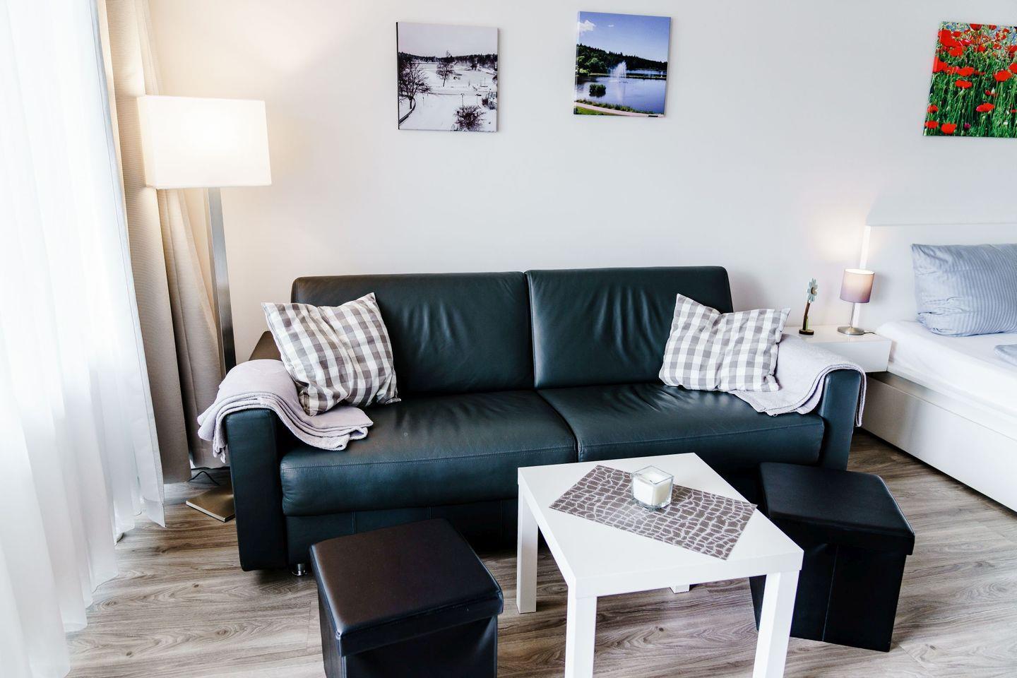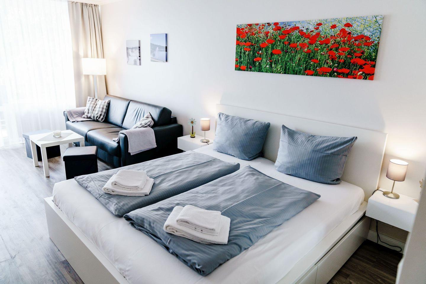 In dem modern eingerichteten Wohn-/Schlafbereich steht ein gemütliches Doppelbett sowie eine Schlafcouch für erholsame Nächte bereit.