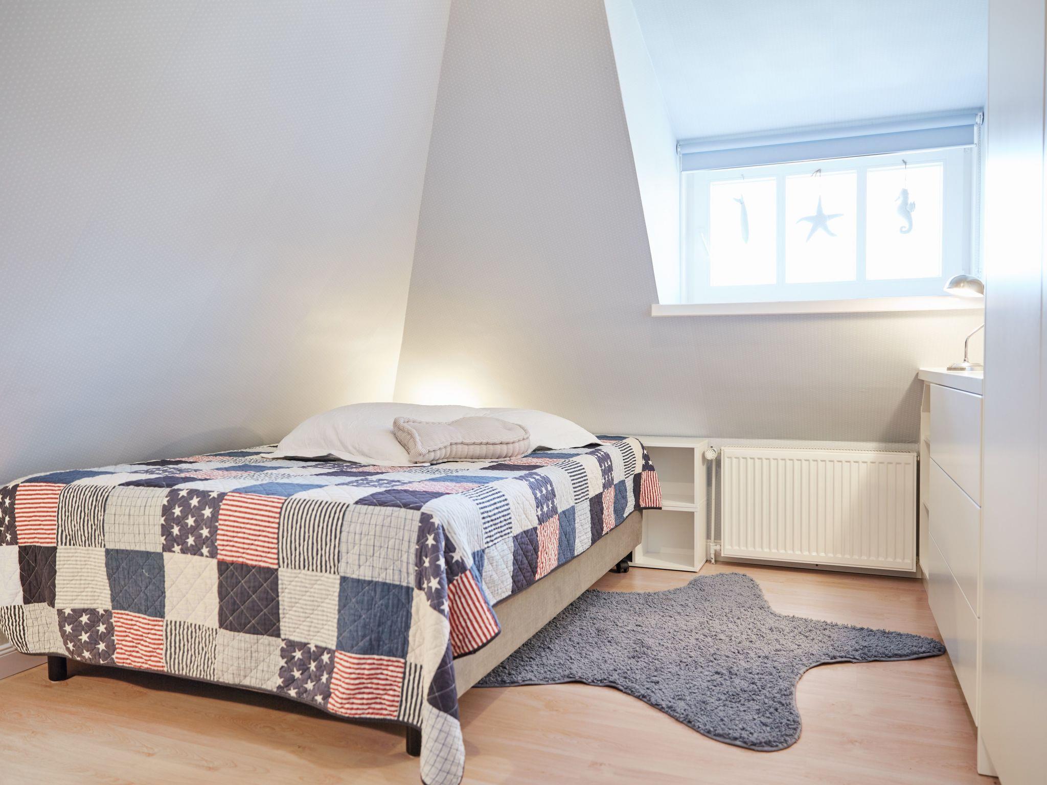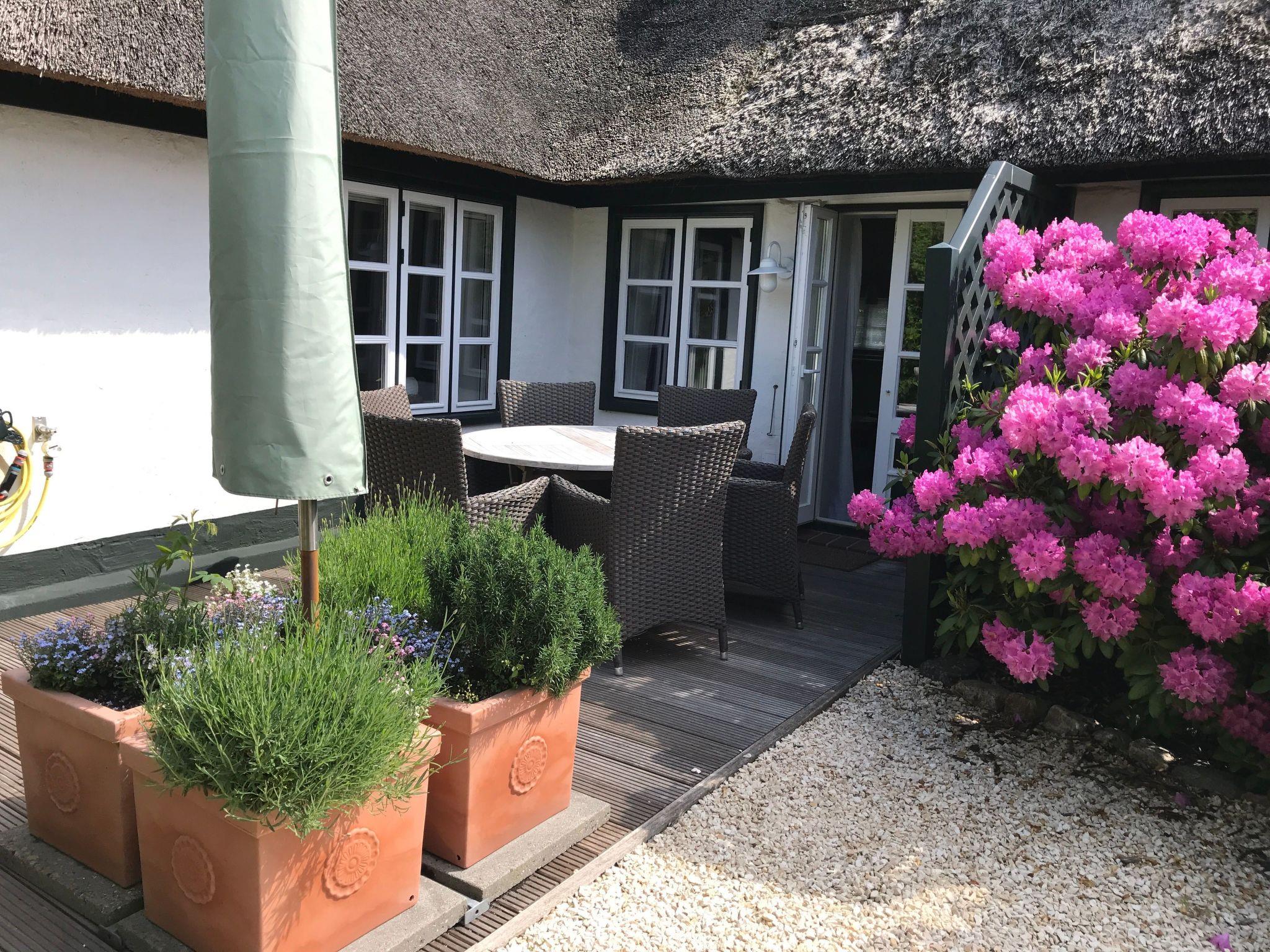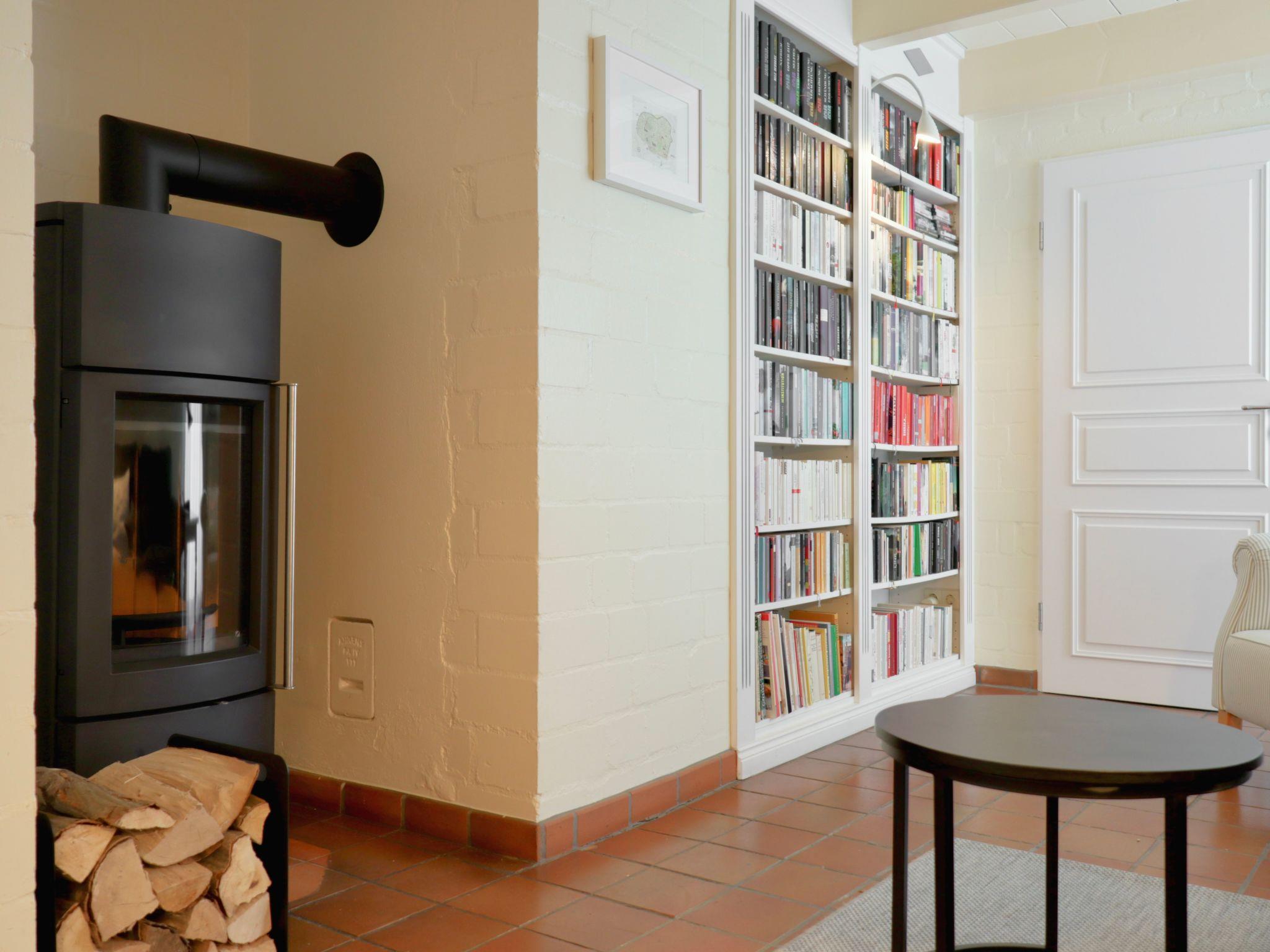 We have also furnished this house with great attention to detail: the living room is divided into a cosy sitting area and a library with a large selection of books and a cosy wood-burning stove. The large dining table adjoins the fully equipped kitchen. Couples or families with children like to holiday here, as there is one bedroom with a daylight bathroom on the ground floor and the other two bedrooms with daylight bathrooms on the upper floor. The unusual floor plan is the result of the optimal layout of the listed building. You can enter the adjoining private garden through the living room, where you have a terrace with seating and your own beach chair in a manageable space. There are also two deckchairs for relaxing in the garden.