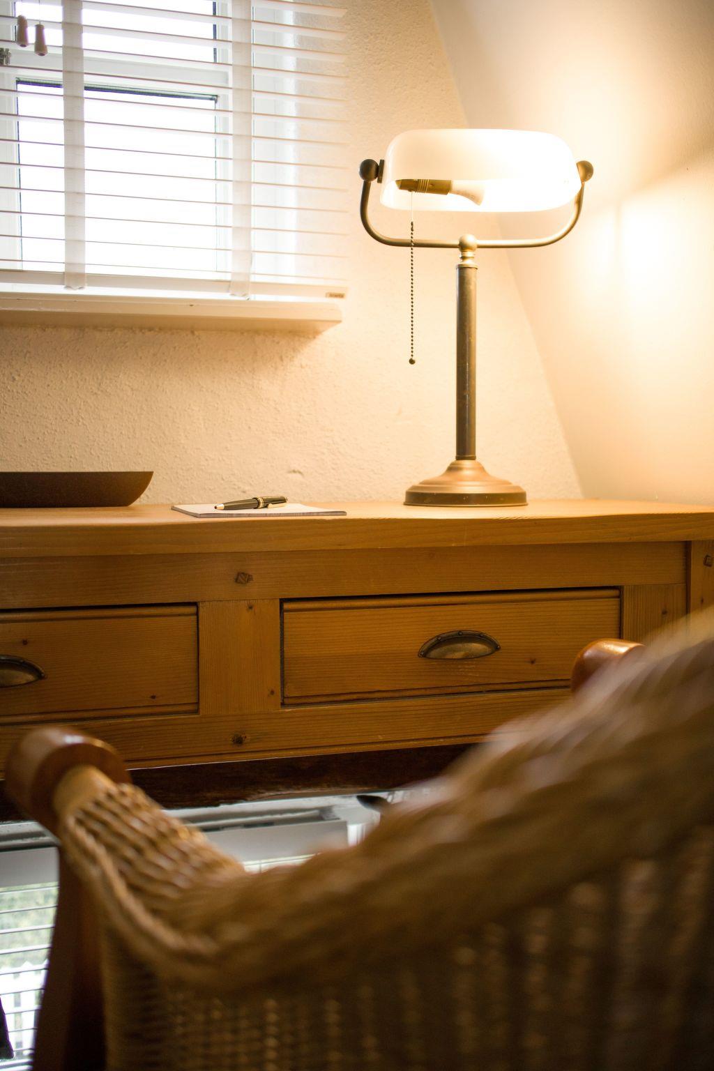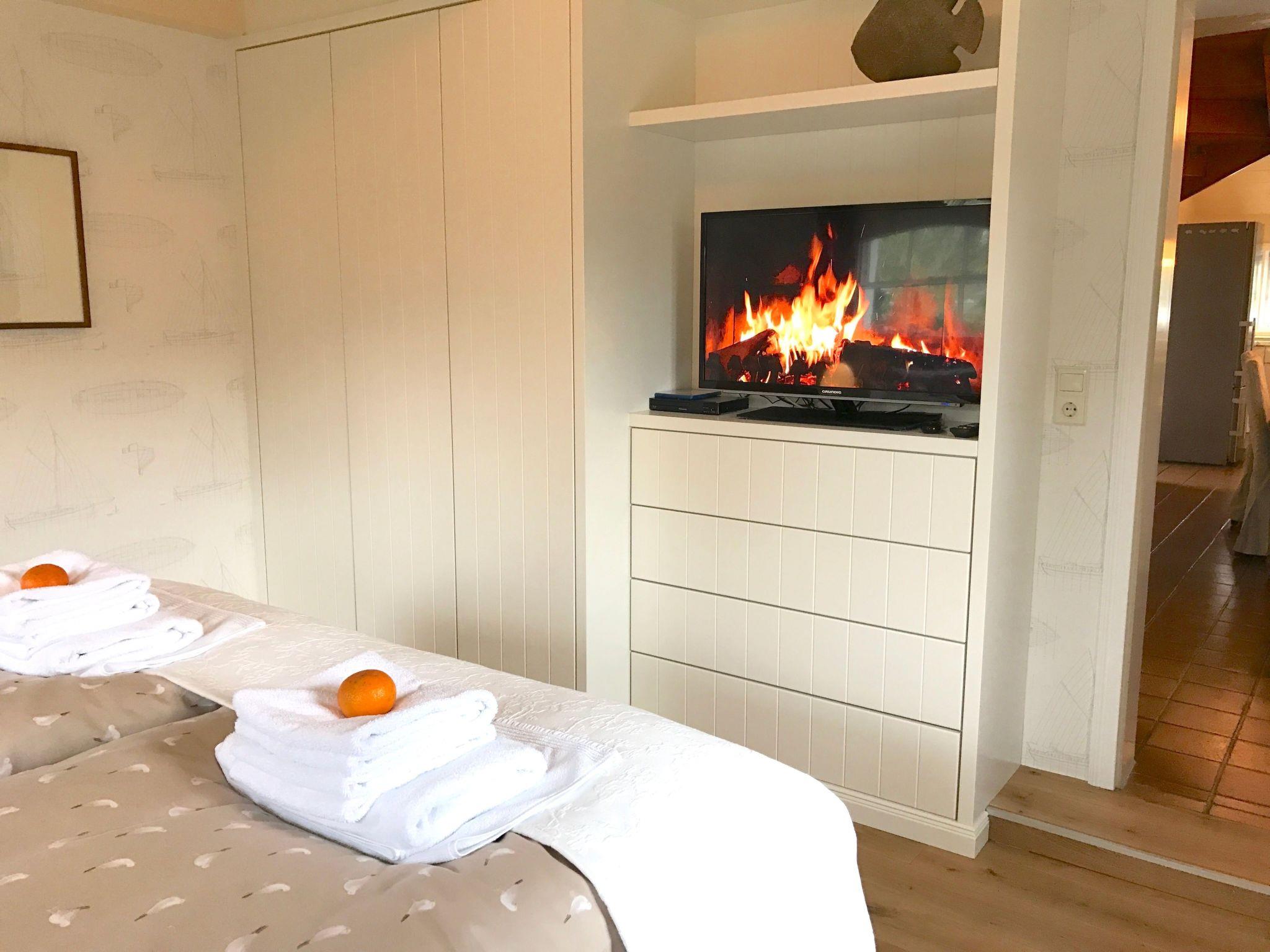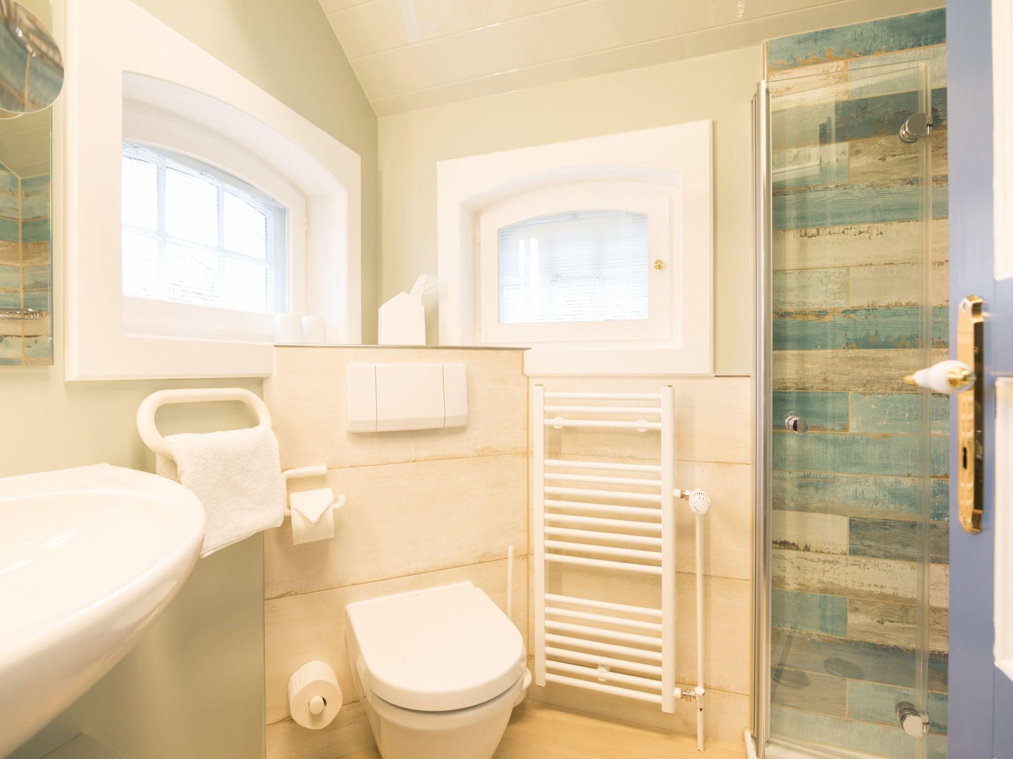 We have also furnished this house with great attention to detail: the living room is divided into a cosy sitting area and a library with a large selection of books and a cosy wood-burning stove. The large dining table adjoins the fully equipped kitchen. Couples or families with children like to holiday here, as there is one bedroom with a daylight bathroom on the ground floor and the other two bedrooms with daylight bathrooms on the upper floor. The unusual floor plan is the result of the optimal layout of the listed building. You can enter the adjoining private garden through the living room, where you have a terrace with seating and your own beach chair in a manageable space. There are also two deckchairs for relaxing in the garden.