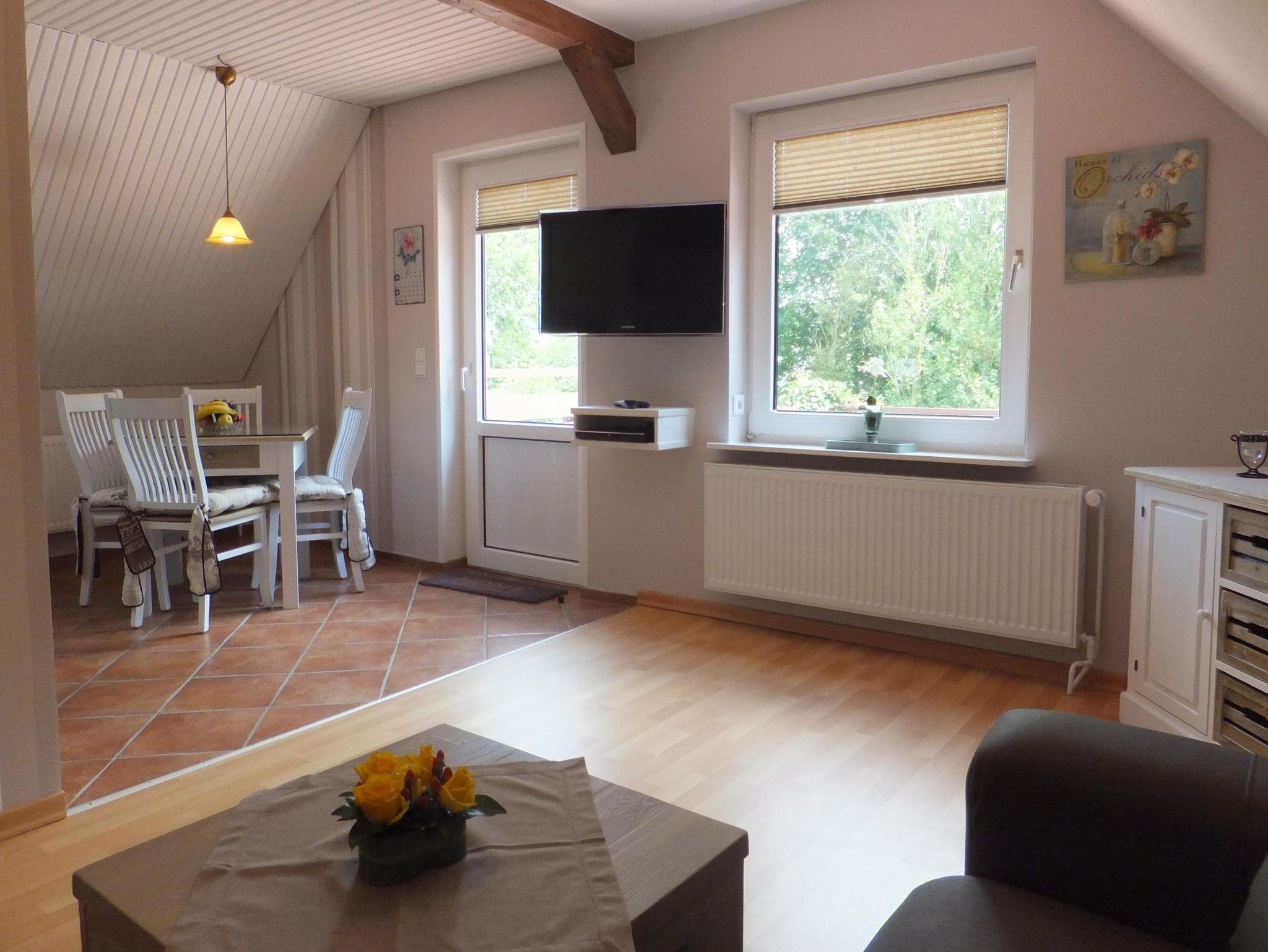 Unsere Wohnung Nr.3 ist im Obergeschoß des Hauses. Die Küche und das Wohnzimmer sind miteinander verbunden, der Flachbildschirm kann geschwenkt werden, so dass Sie von beiden Räumen aus TV sehen können. Ein Blu ray Player und die Hifi Anlage runden das Entertainment System ab. Bücher und Gesellschaftsspiele sind vorhanden. Unsere Küche ist sehr gut ausgestattet... Ein Cerankochfeld mit Backofen, Mikrowelle, Geschirrspüler, Kaffeemaschine, Wasserkocher und Toaster lassen es an nichs fehlen. Auf dem Balkon, der zur Ostseite gerichtet ist, können Sie bis zum Nachmittag die Sonne genießen. Ein neuer liege Srandkorb lädt zum träumen ein. Im Schlafzimmer ist ein 1.80m breites und 2m langes Bett mit offenem Fußende. Die Vorhänge dienen zur kompletten Verdunkellung des Raumes. Das Bad bietet Handtuchtrockner, Kosmetikspiegel und einen Fön. In der Abstellkammer finden sie Wäschständer, Bügelbrett und genügend Stauraum für Ihre Koffer.
