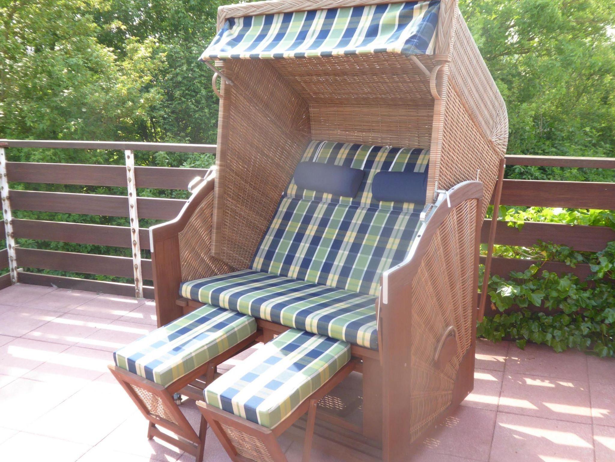 Außenbereich: Abstellmöglichk. f. Fahrräder, Balkon, Balkonmöbel, Gartenmöbel, Grillmöglichkeit, Strandkorb auf Balkon.