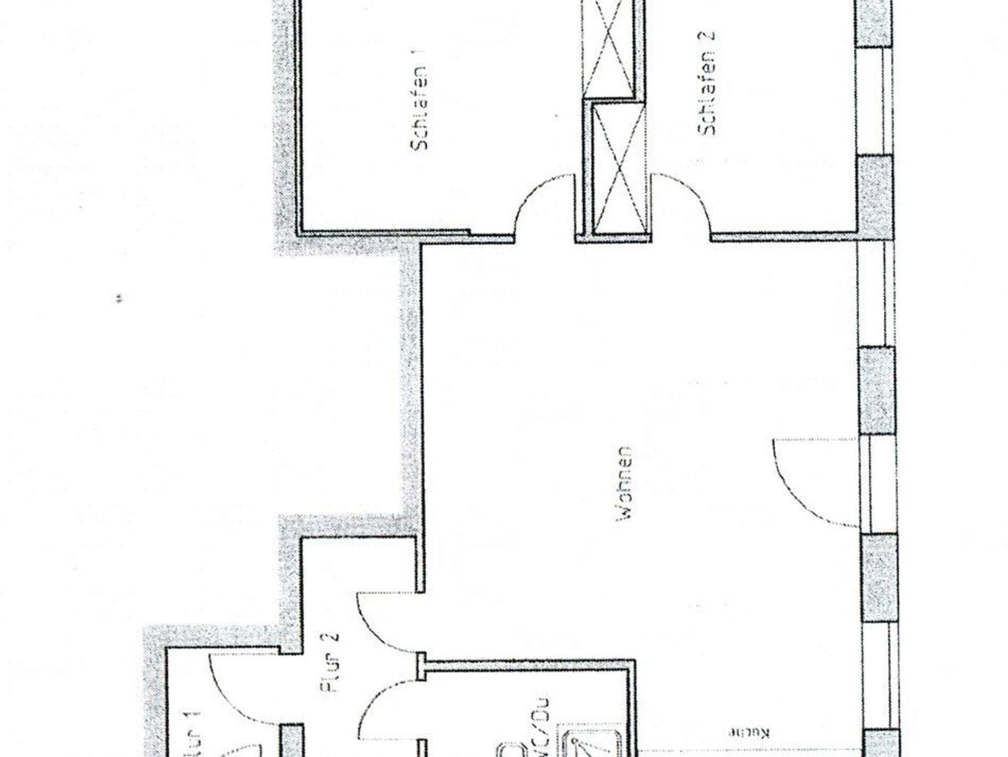 Raumaufteilung: 2 Schlafräume, 1 Wohnküche, 1 Badezimmer mit Dusche.