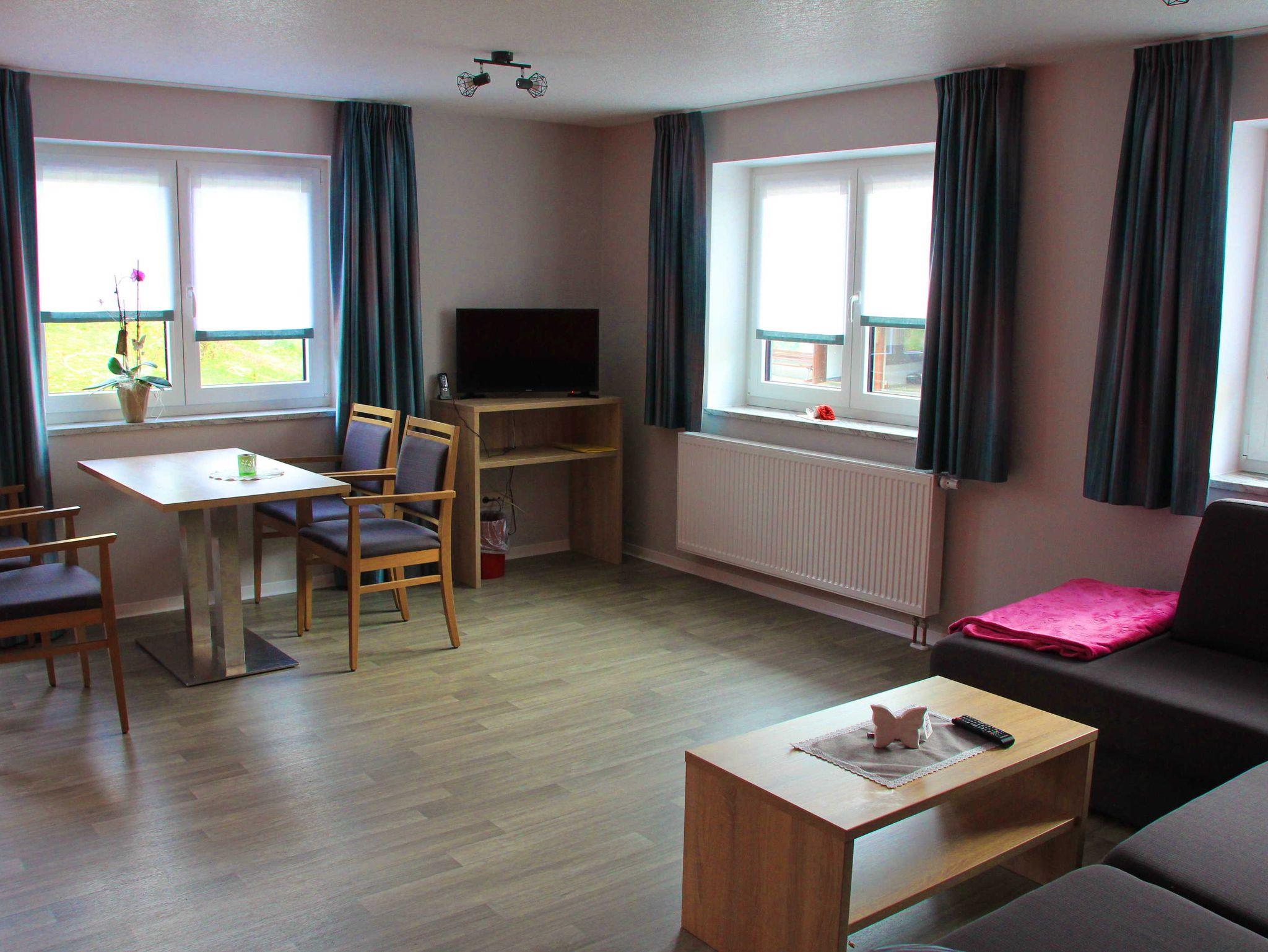 Wohnzimmer: Speisetisch mit Stühlen, Farbfernseher, Couchtisch, Schlafeckcouch, kl. Schreibtisch