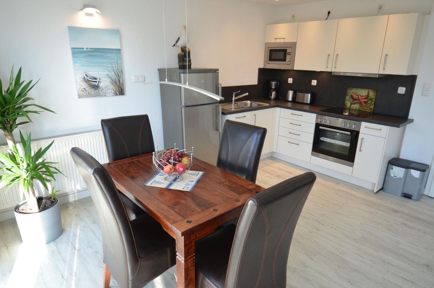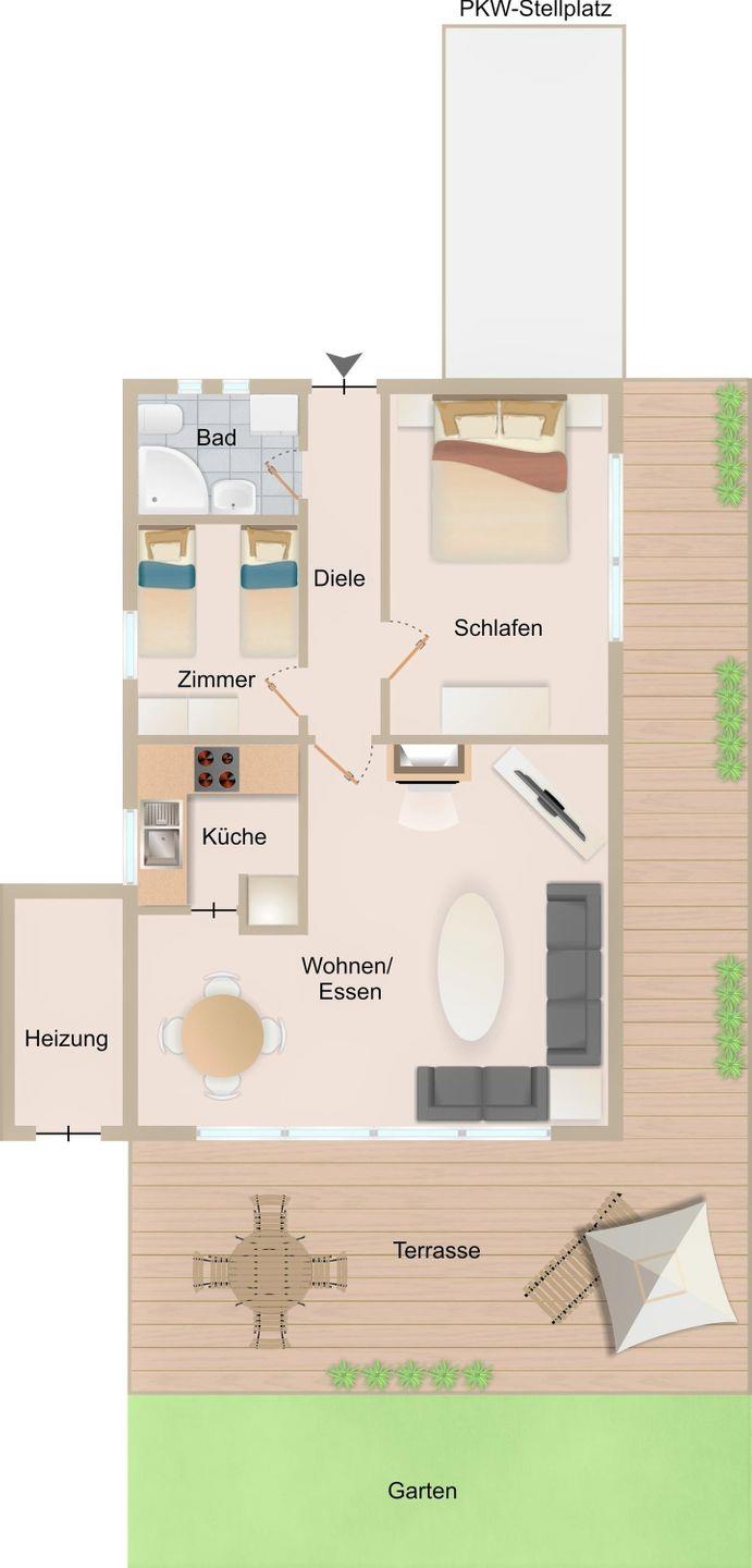 Das Feriendomizil verfügt über 1 komb. Wohn-/Essbereich, 1 Küche, 2 Schlafräume, 1 Duschbad sowie einen ca. 300 m² großen, komplett eingezäunten Garten.