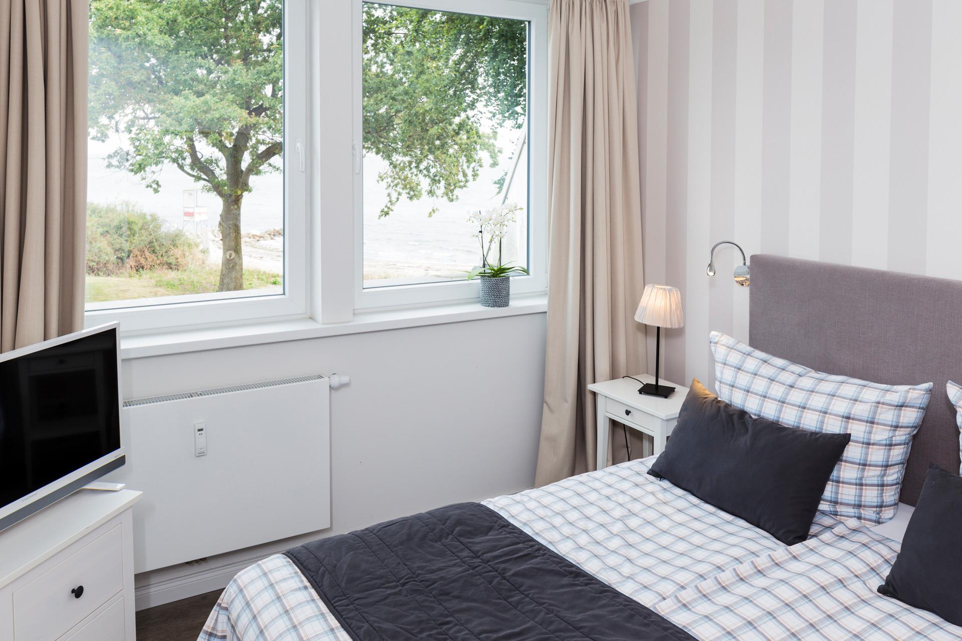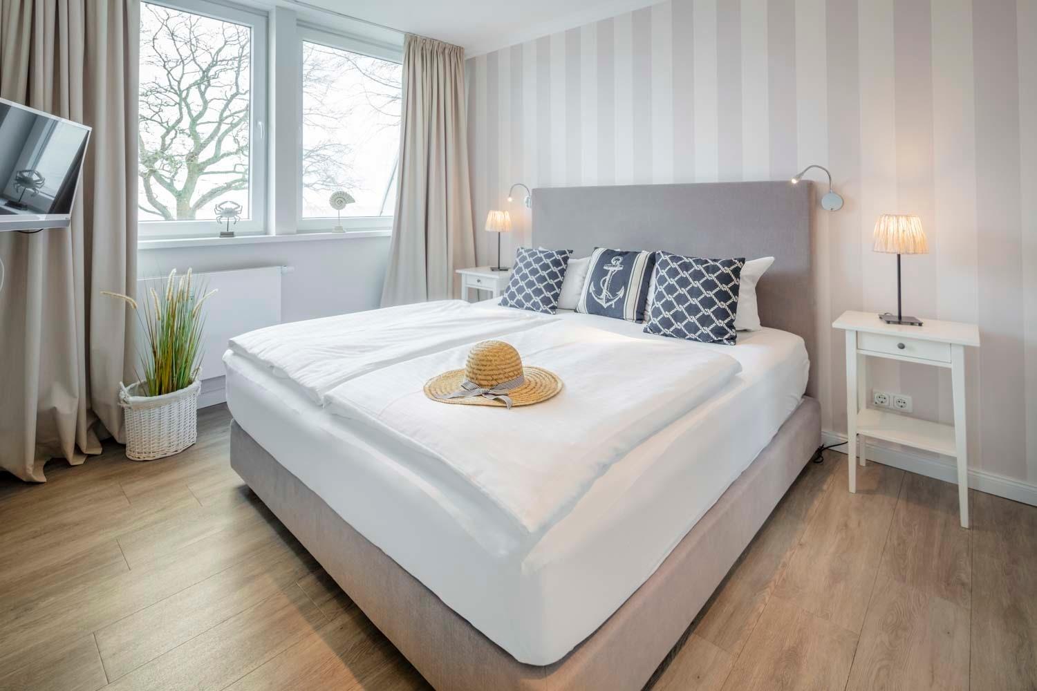 Doppelbett, Zimmer 3 mit Doppelbett und Meerblick. Die gemütlichen Boxspringbetten vereinen