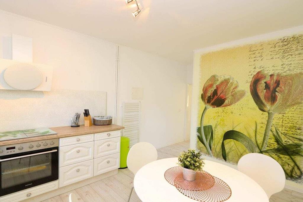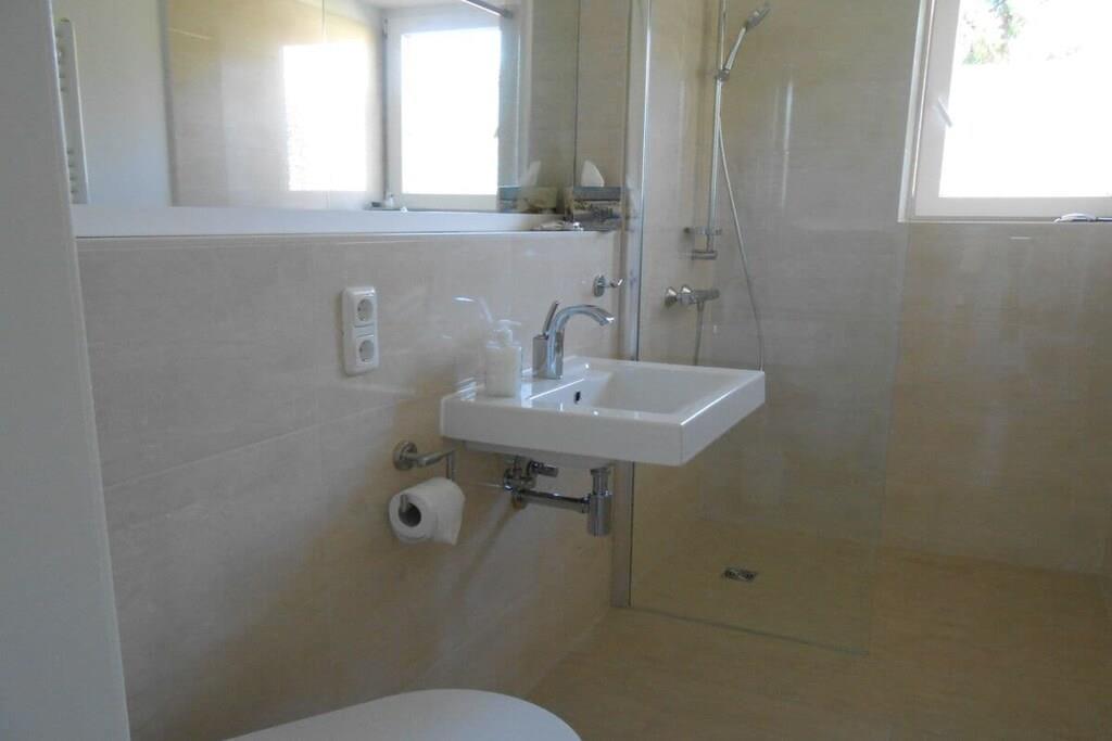Look forward to a very beautiful, modern holiday home, just 250 meters from the fine sandy Grömitz beach. In a quiet location, with beautiful views of the Baltic Sea, a private beach chair on the beach, and space for 1-4 people. This completely renovated and newly furnished holiday home covers a generous 100 square meters. On the ground floor is the fully equipped kitchen with a first dining table, large refrigerator, convection oven, ceramic hob, dishwasher, microwave, kettle, and much more. A new daylight bathroom with a first toilet, a 100x150cm walk-in shower, a large illuminated mirror, and a built-in radio. A tastefully furnished living and dining room with a second dining table, a large flat-screen satellite TV, access to the covered terrace with garden, private grill, and beautiful views of the Baltic Sea. On the first floor, there is a large bedroom with a 180x200cm box spring bed with two mattresses, a large sliding door wardrobe, and access to the balcony with a stunning sea view. The second bedroom has two single beds (90x200cm each), a wardrobe, and a walk-in closet. The second bathroom with natural light is equipped with a bathtub, sink, and a second toilet. A solid wood toddler bed and a highchair are available for our younger guests. Most of the windows have electric blinds. A washing machine is available. Wi-Fi, a beach chair on the beach, and a parking space in the yard are included. The house is located in a 30 km/h zone with a playground approximately 200 meters away.