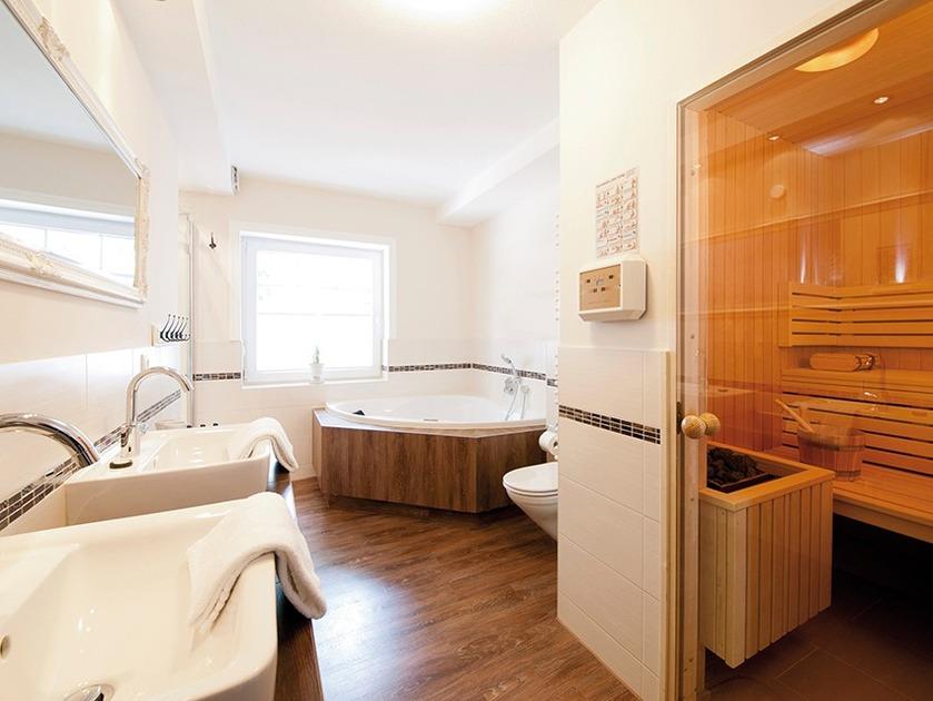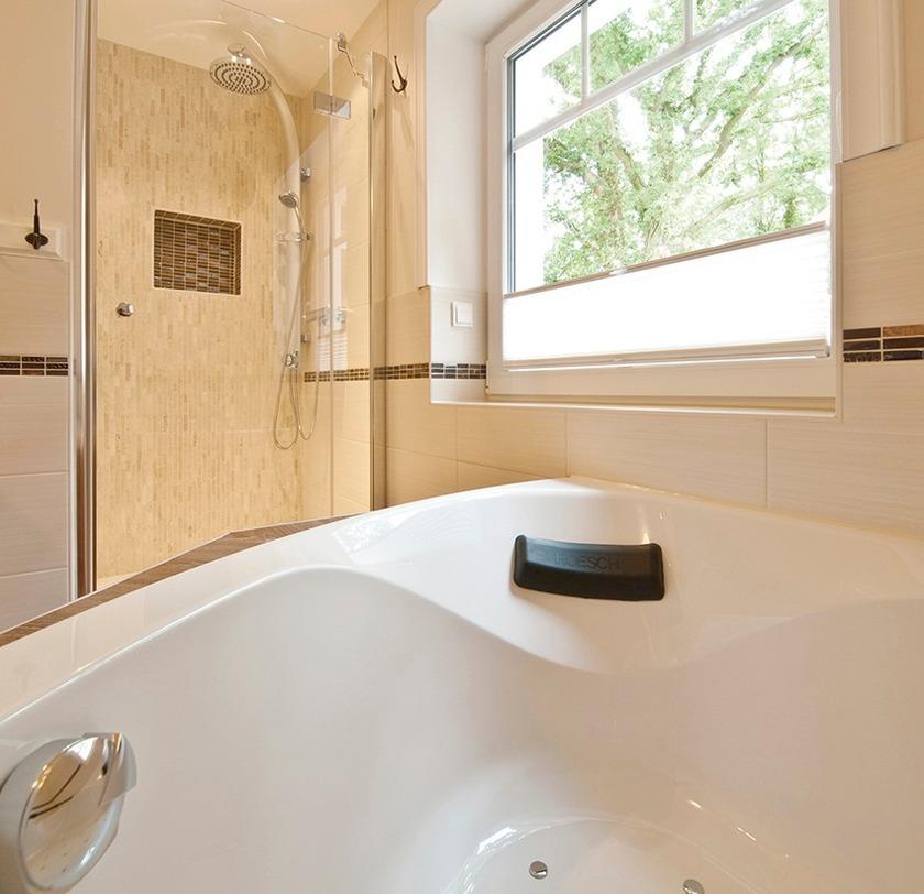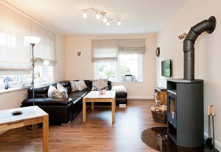 Zur Ausstattung gehören: Bad mit Sauna und Whirlwanne, Gäste-WC mit Dusche, Eltern-Schlafzimmer mit Doppelbett, Kinderzimmer mit 2 Einzelbetten, offene voll ausgestattete Wohnküche, Kamin inkl. Holz, Flat-TV, DVD, W-Lan, Fußbodenheizung, Südterrasse mit Ostseeblick und hochwertigen Gartenmöbeln, Parkplatz direkt am Haus.