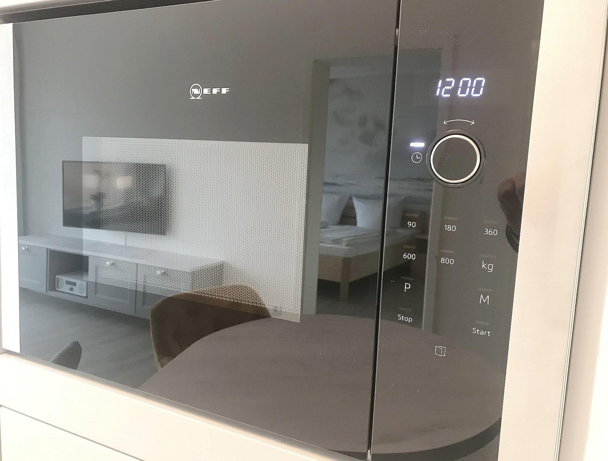 Pantryküche mit Ceranfeld-Herd, Kühlschrank, Mikrowelle und Geschirrspüler.
