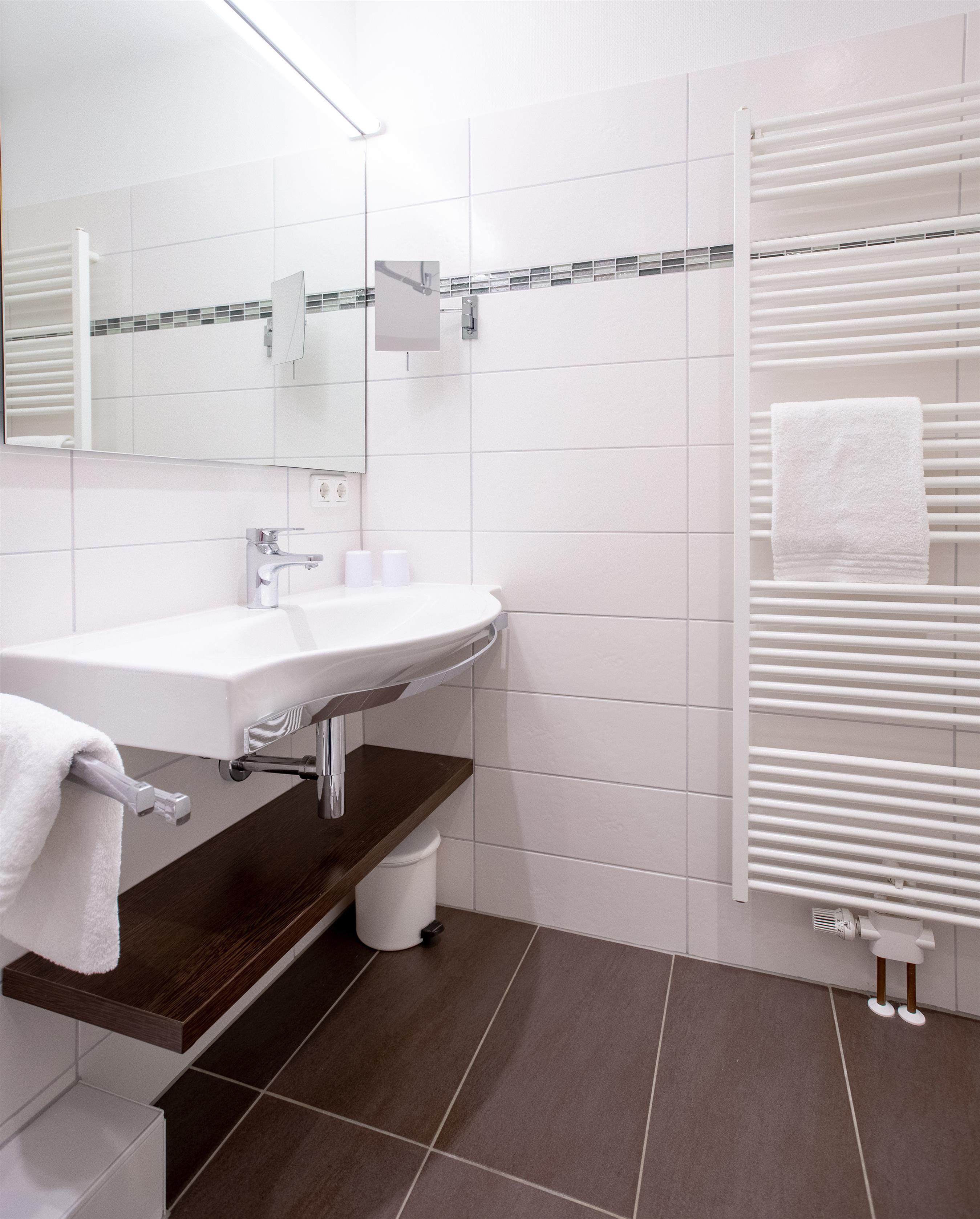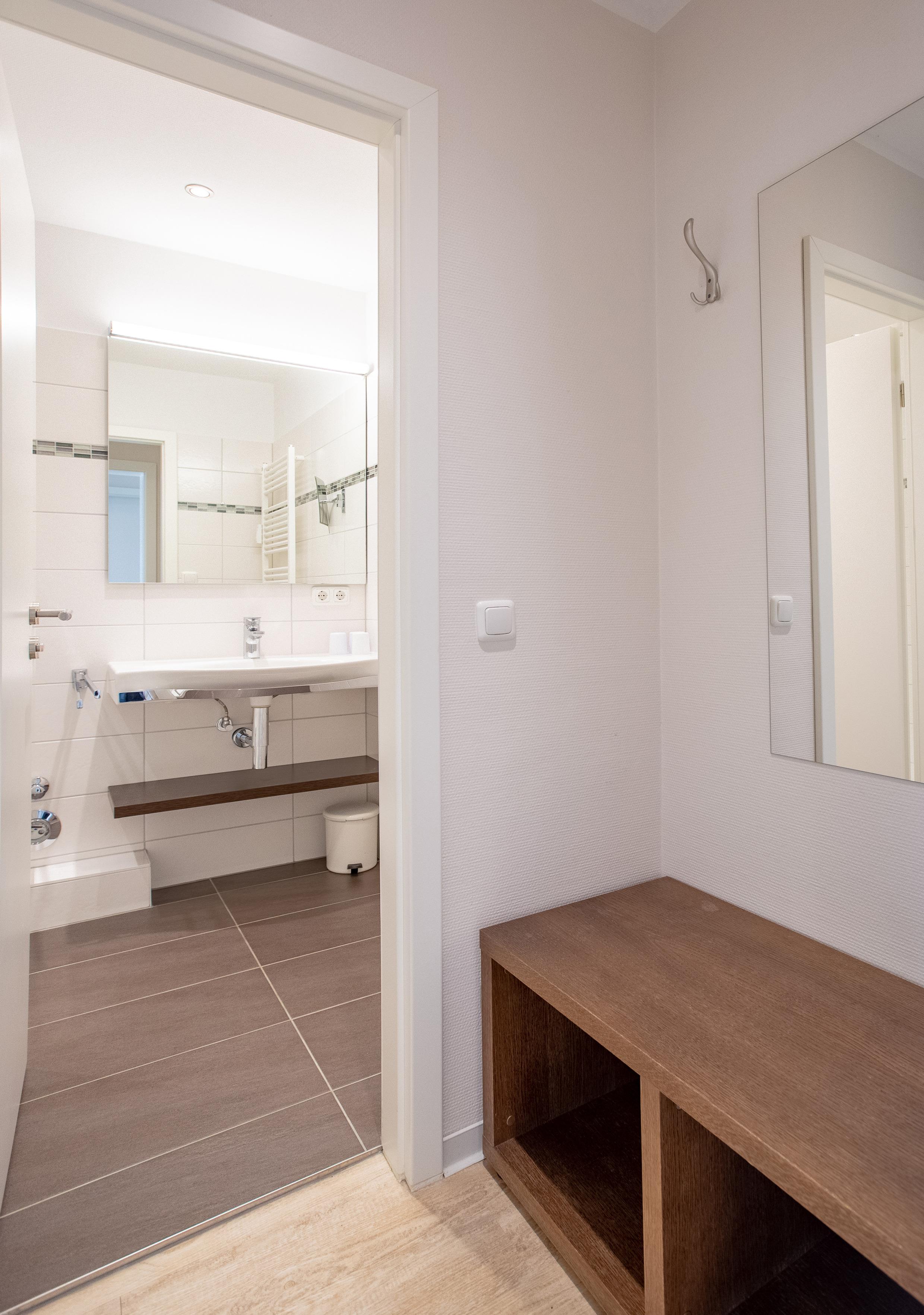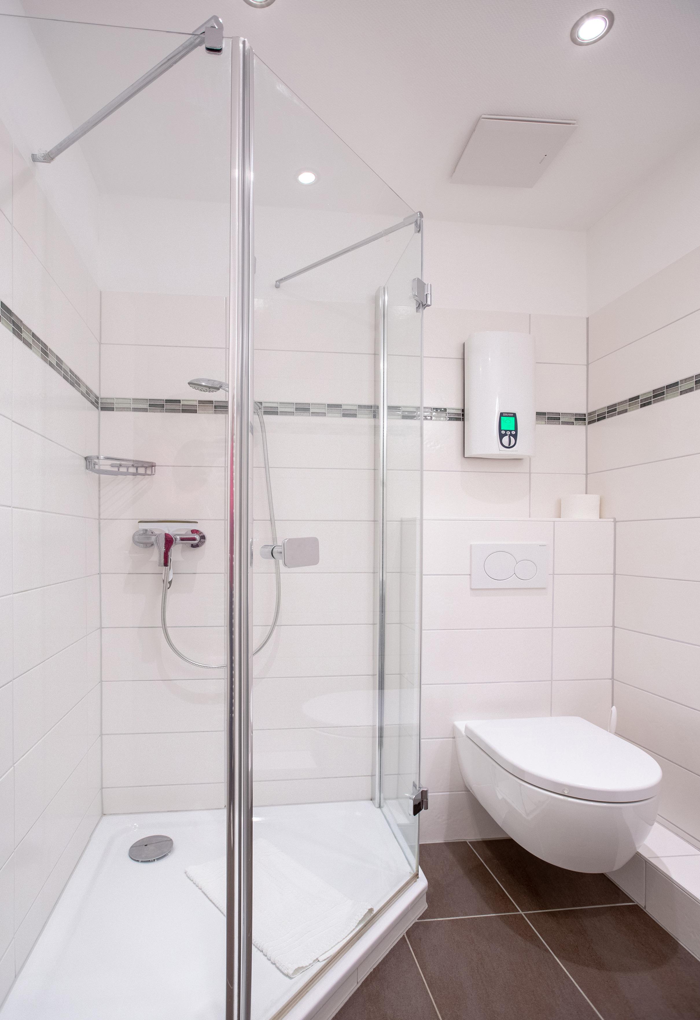 Sie hat jetzt ein größeres Bad mit Dusche. Die Dusche hat eine Einstiegshöhe von ca. 5 cm.