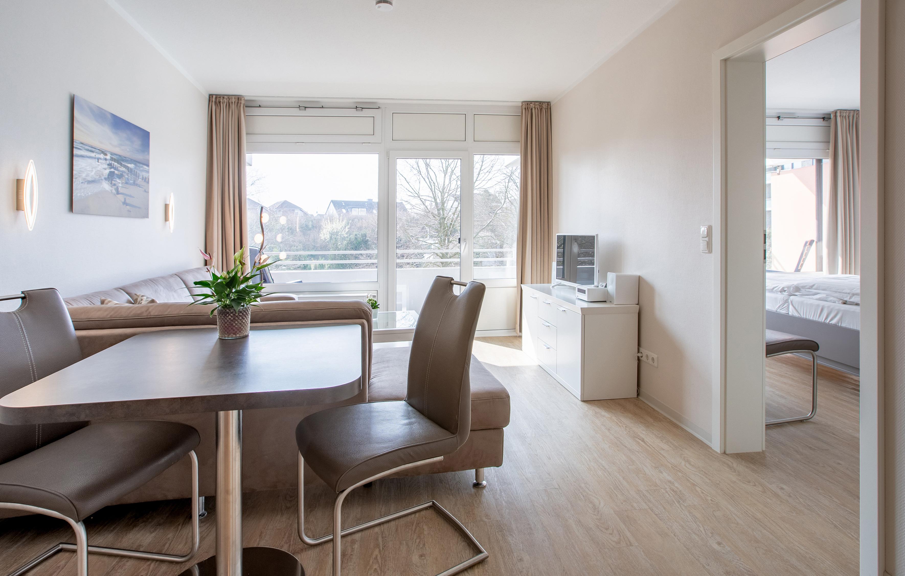 Dieses Nichtraucher Apartment vom Typ B4 liegt im 3. Geschoss. Die Wohnfläche beträgt 43 qm. Diese Wohnung ist für den Aufenthalt von bis 3 Personen geeignet.