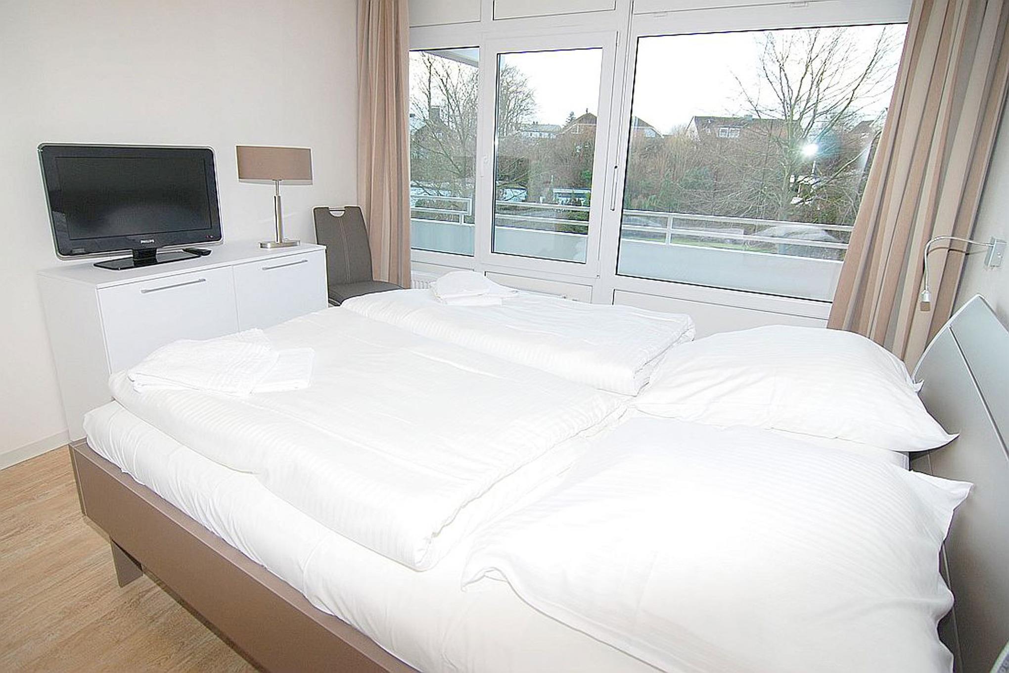 Die Wohnung verfügt über ein großzügiges Schlafzimmer mit Doppelbett, Kleiderschrank und zweitem TV.