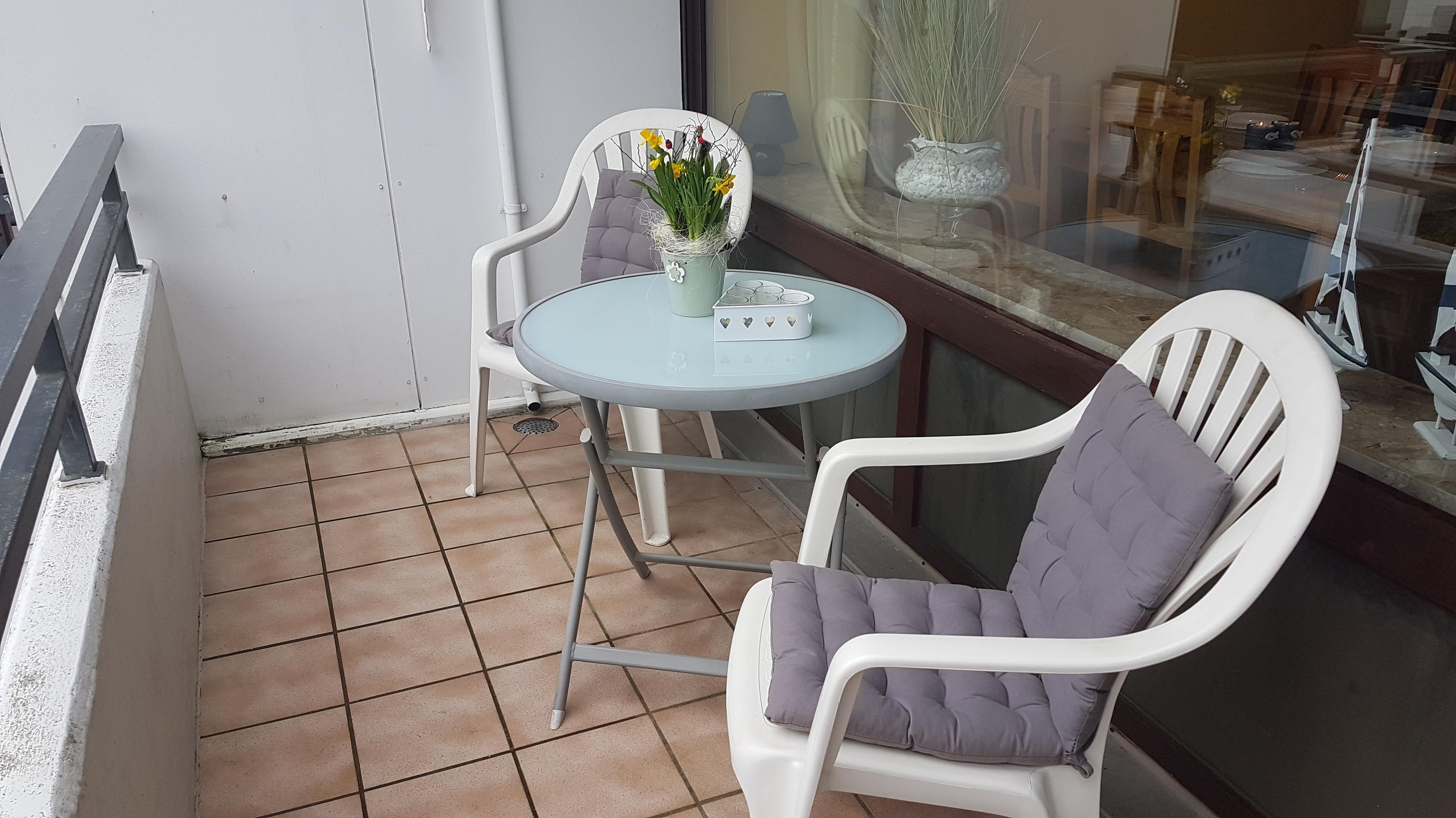 1a-Lage, 44qm Ferienwohnung im 1. Stock mit möbliertem Balkon. Stellplatz direkt am Haus. 3 Gehminuten vom Strand entfernt.