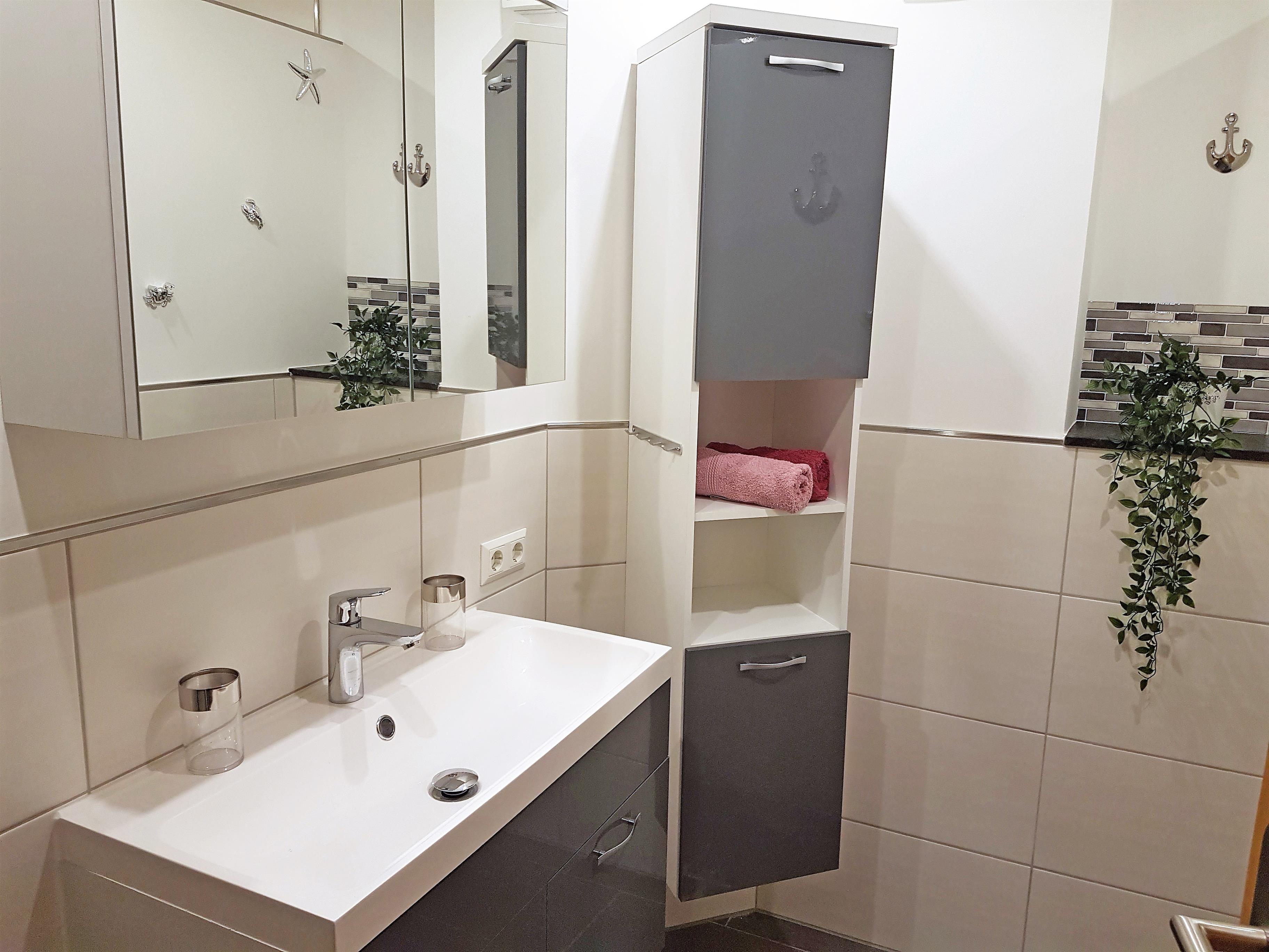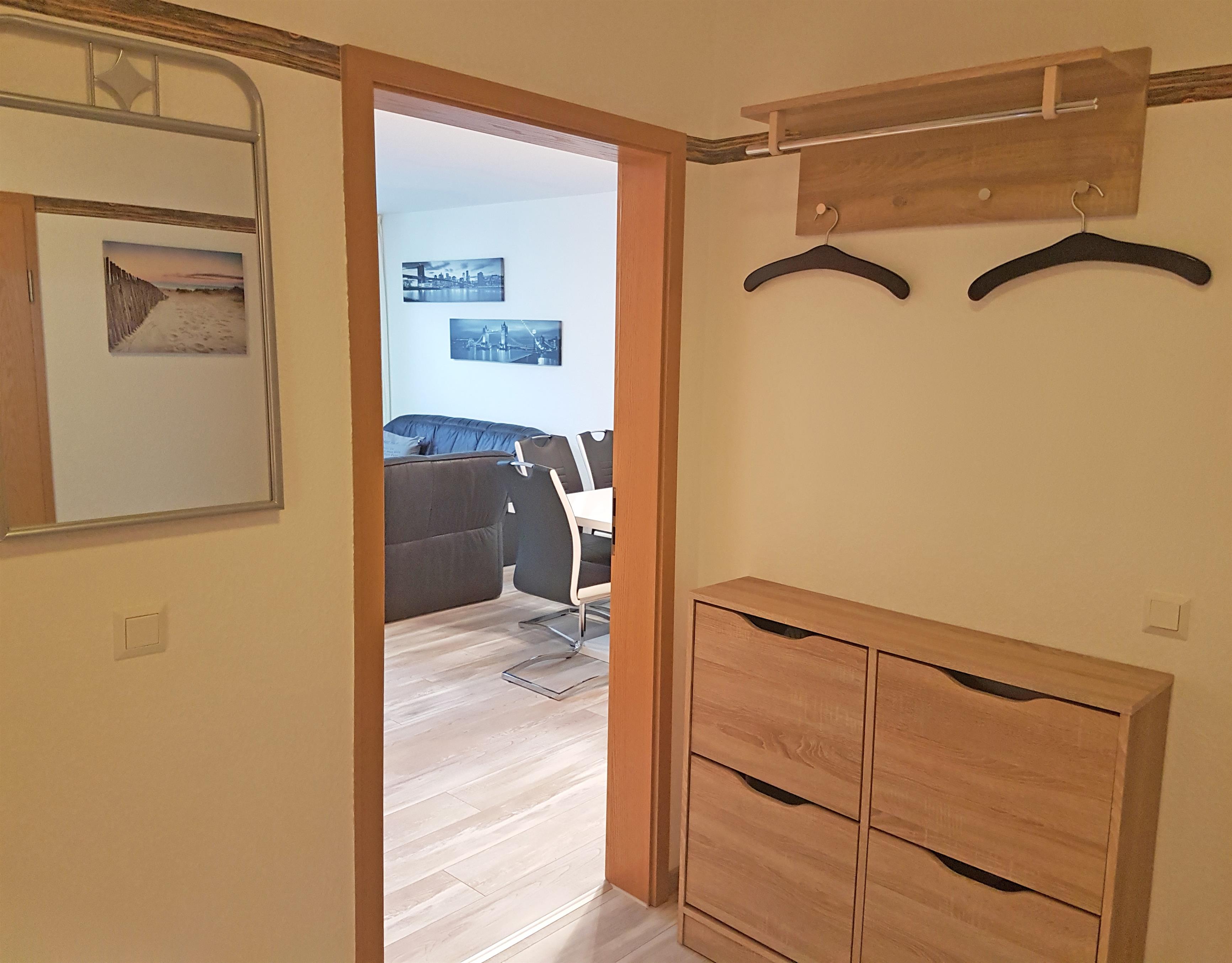 Im Wohnbereich befindet sich ein großer Flachbild-Fernseher, ein 3-Sitzer, 2-Sitzer-Sofa mit Sessel sowie ein Essplatz mit 4 Stühlen. Vom Wohnzimmer gelangen Sie auf den Balkon. Die offene Küche verfügt über ein 4er Ceranfeldherd, Mikrowelle sowie alle wichtigen Küchenutensilien. Das Schlafzimmer ist mit einem Doppelbett (Matratzen 90X200), großzügigem Kleiderschrank, Flachbild-TV (nicht alle Programme verfügbar), Plissees und Verdunkelungsvorhängen ausgestattet. Der Balkon ist ebenfalls vom Schlafzimmer her begehbar. Angrenzend an das Elternschlafzimmer befindet sich mit einer Glasschiebetür das Kinderzimmer. Hier steht ein 140X200 Bett. Das Badezimmer besteht aus einer extra großen, modernen Dusche, modernem Waschtisch sowie einem Hochschrank. Abgehend vom Flur finden Sie das frisch renovierte WC mit Waschtisch und Hochschrank. Die Wohnung verfügt über WLAN. Für Sie gibt es einen eigenen Pkw-Stellplatz sowie auch Fahrradstellplätze sind vorhanden. Den nächsten Supermarkt und Bäcker erreichen Sie in weniger als 5 Gehminuten; bis zum Strand sind es ca. 13 Gehminuten. Der beliebte Zoo Arche Noah befindet sich gegenüber und ein Golfplatz ist ca. 1 km von der Wohnung entfernt. Wir bitten um Verständnis, dass hier keine Haustiere erlaubt sind. Es handelt sich um eine Nichtraucherwohnung.
