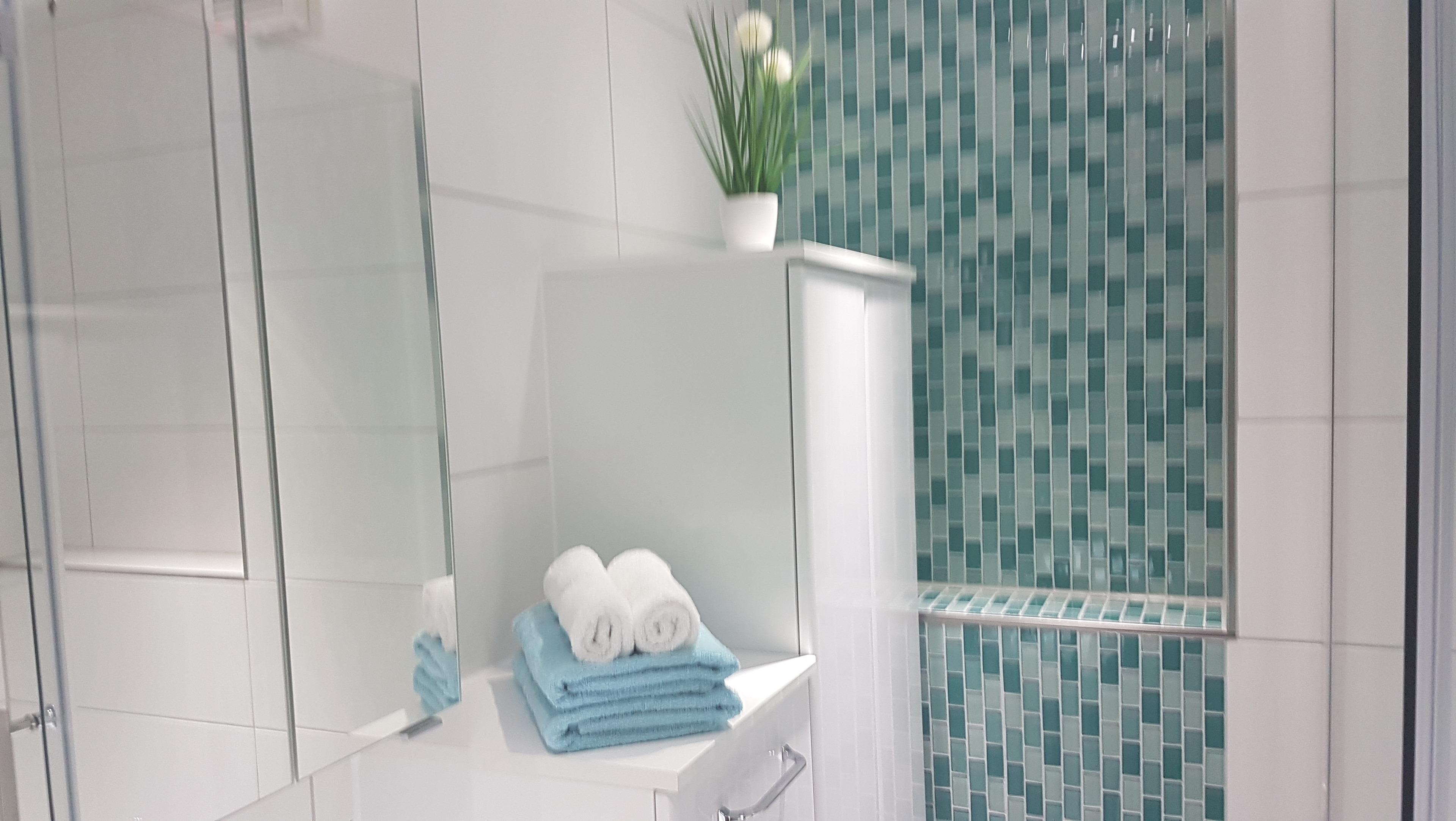 Das moderne, komplett neu renovierte Badezimmer ist mit einem Waschtisch, Spiegelschrank, einem zusätzlichen Schrank, WC, großzügiger Dusche und einem Handtuchheizkörper ausgestattet. Ein Föhn gehört ebenfalls zur Ausstattung. Ein besonderes Ausstattungsmerkmal dieser modernen Wohnung ist der am Wohnzimmer angrenzende Erker. Hier können Sie in aller Ruhe Ihren Kaffee genießen oder sich einfach nur an dem Grömitzer Sonnensymbol mit Beleuchtung erfreuen. In dieser geräumigen Wohnung heißt es einfach nur Ankommen und den Urlaub genießen. Ein Pkw-Stellplatz steht Ihnen direkt hinter der Wohnanlage zur Verfügung. Bitte haben Sie Verständnis, dass es sich bei diesem Ferienobjekt um ein Nichtraucherdomizil handelt. Hunde gerne auf Anfrage.