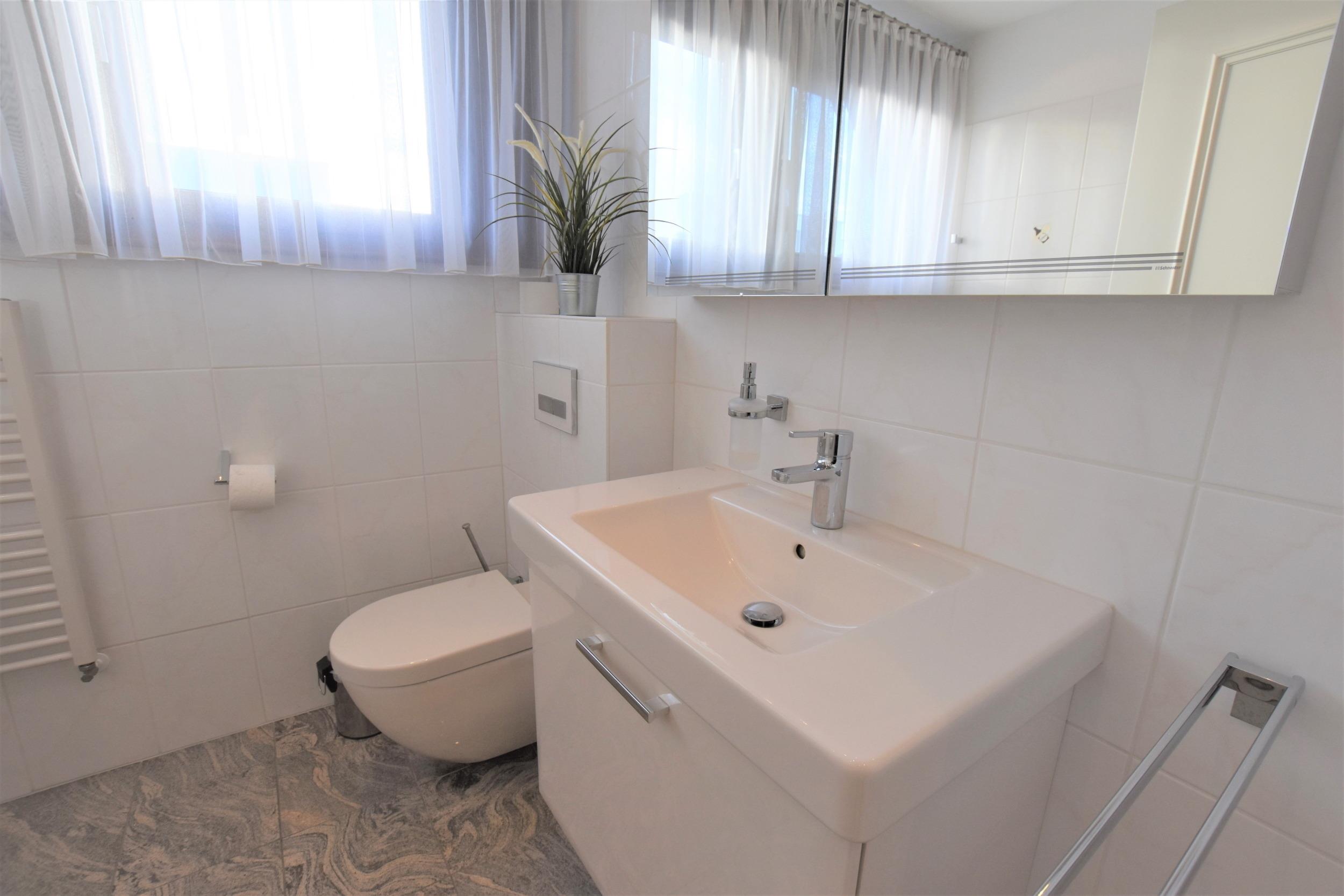 Das helle Duschbad ist mit einer Dusche, Waschbecken Fenster und WC ausgestattet.