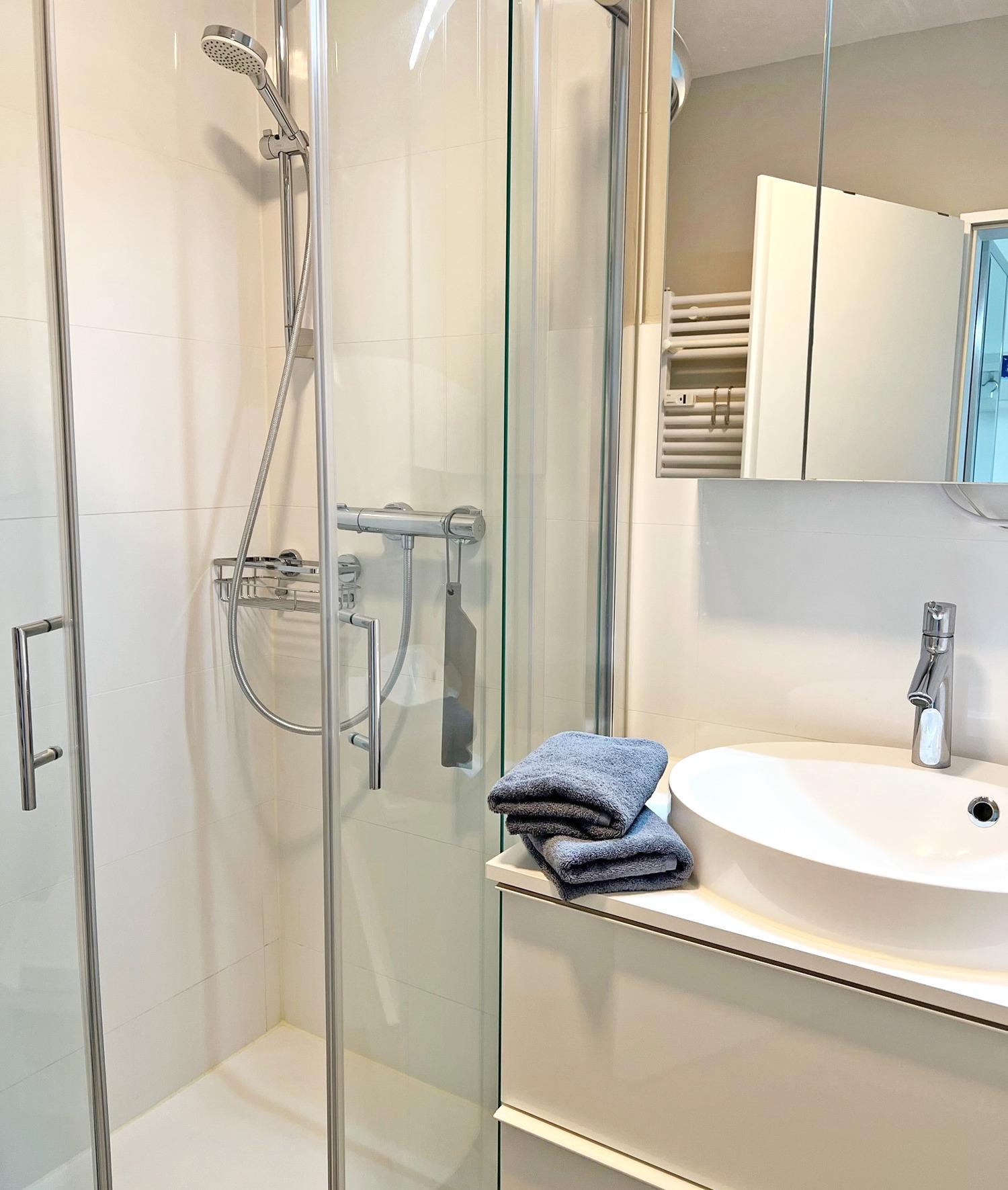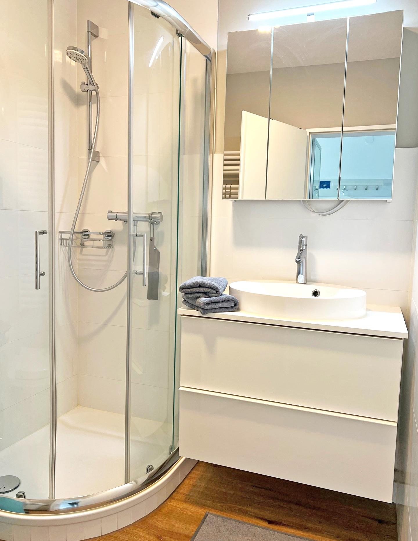 Das renovierte und moderne Duschbad ist mit einer Dusche, einem Waschtisch, WC und Haartrockner ausgestattet.
