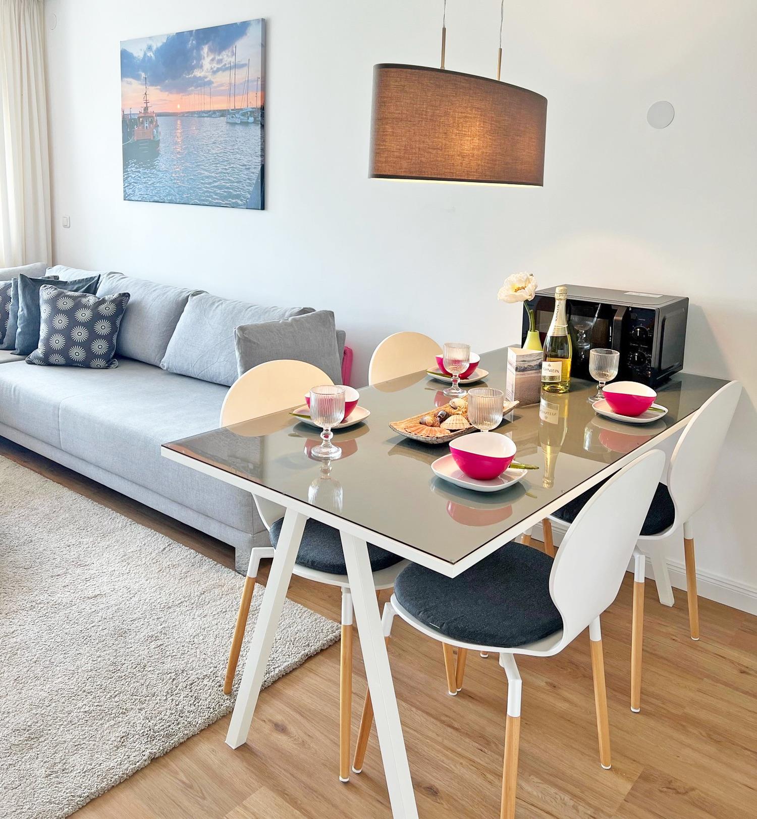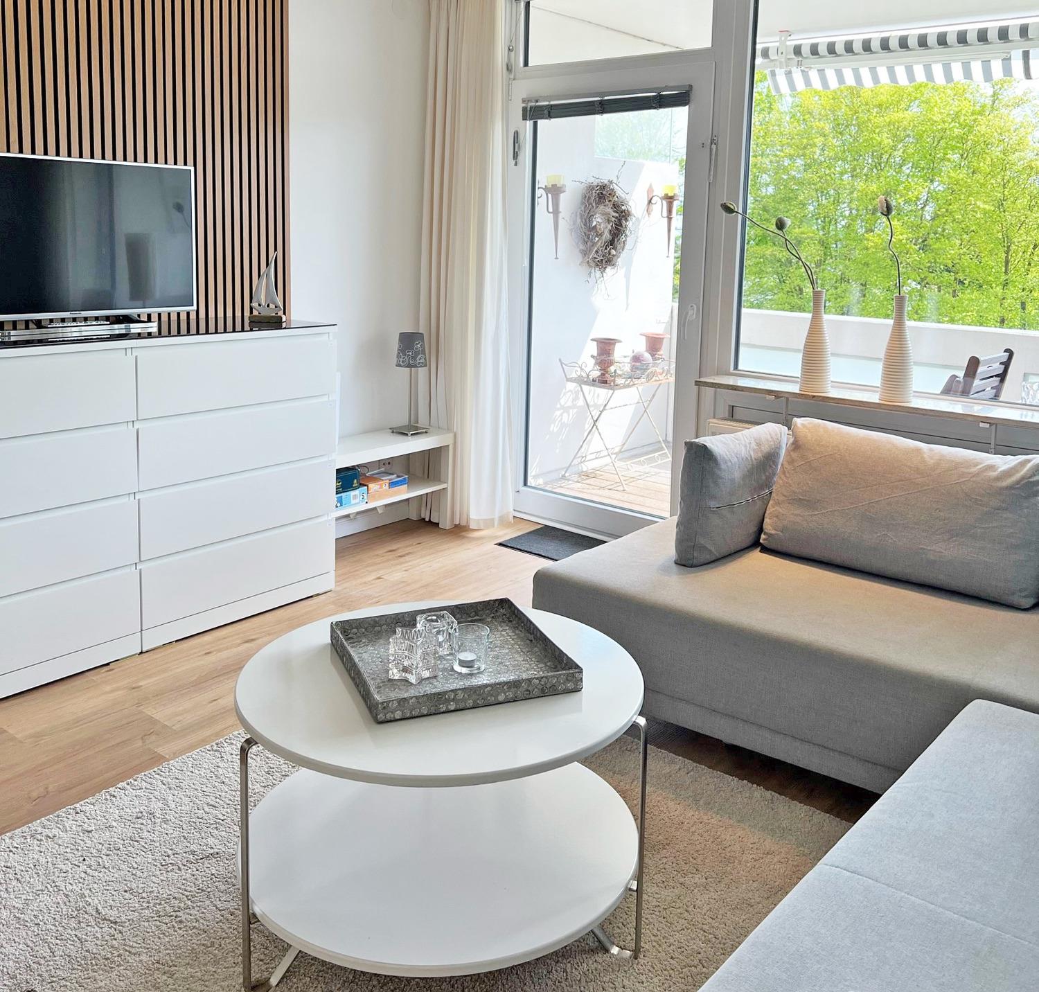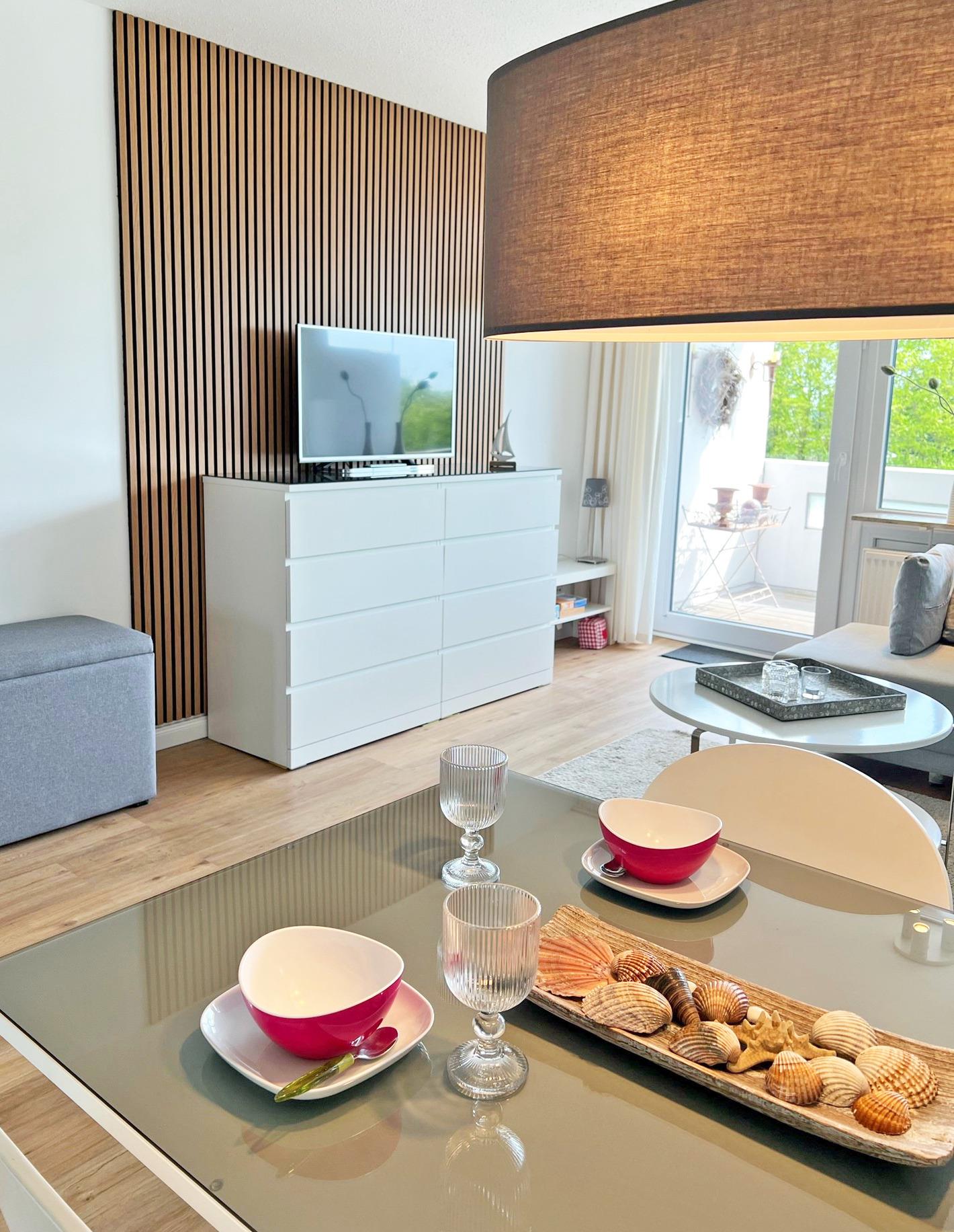 Vom Wohnbereich aus führt ein direkter Zugang auf den Balkon. Moderne Gartenmöbel laden zum Verweilen ein. Genießen Sie von hier aus gleich morgens Ihren Kaffee mit Panoramablick über die Dächer von Grömitz.