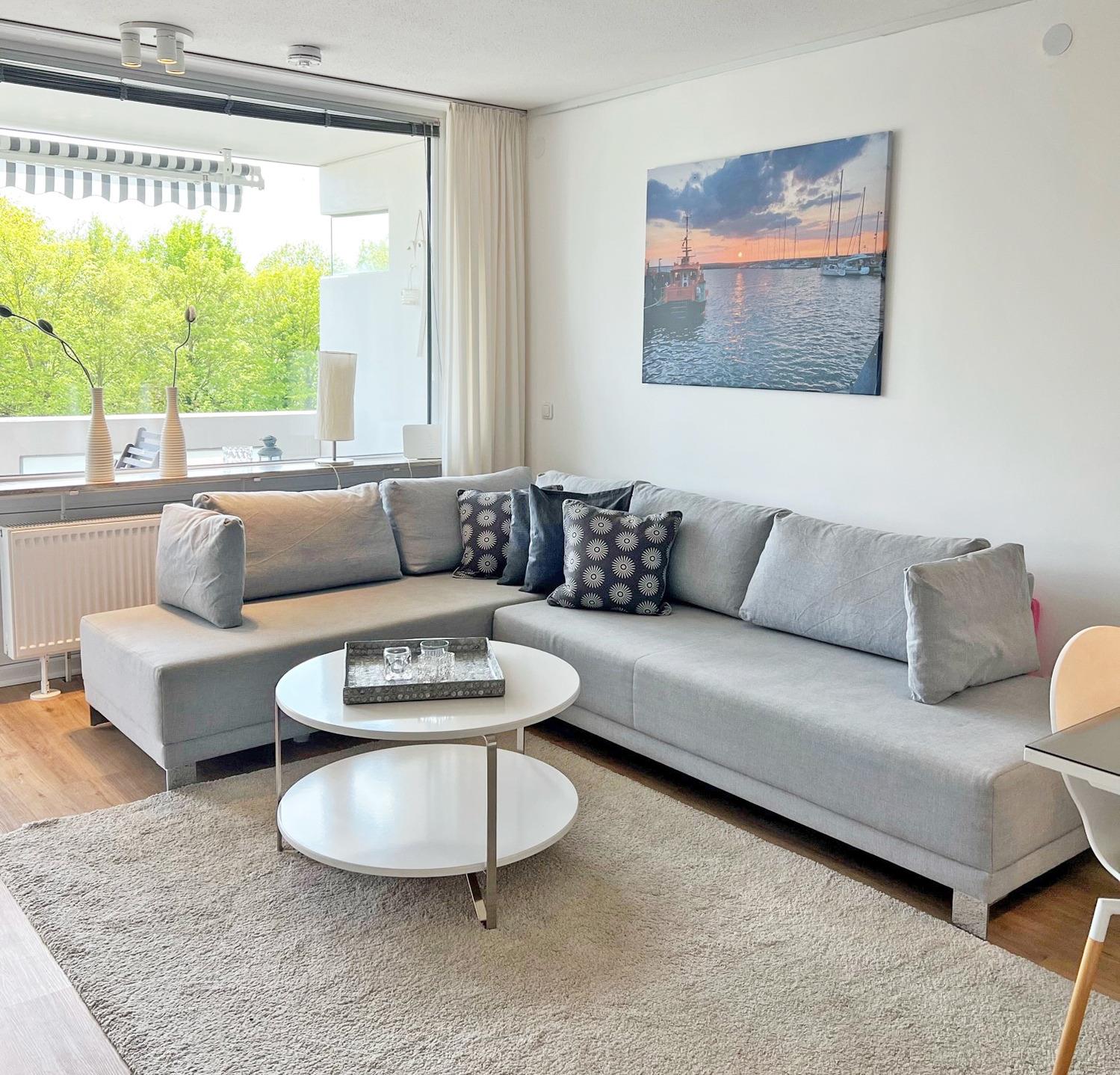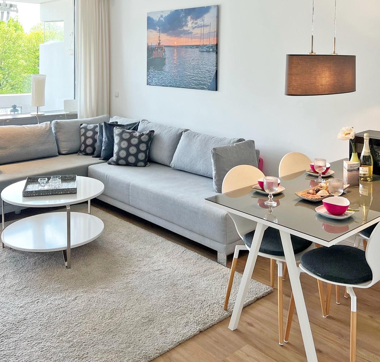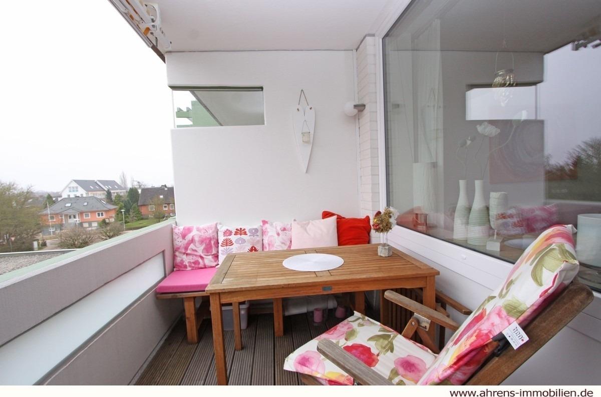 Vom Wohnbereich aus führt ein direkter Zugang auf den Balkon. Moderne Gartenmöbel laden zum Verweilen ein. Genießen Sie von hier aus gleich morgens Ihren Kaffee mit Panoramablick über die Dächer von Grömitz.