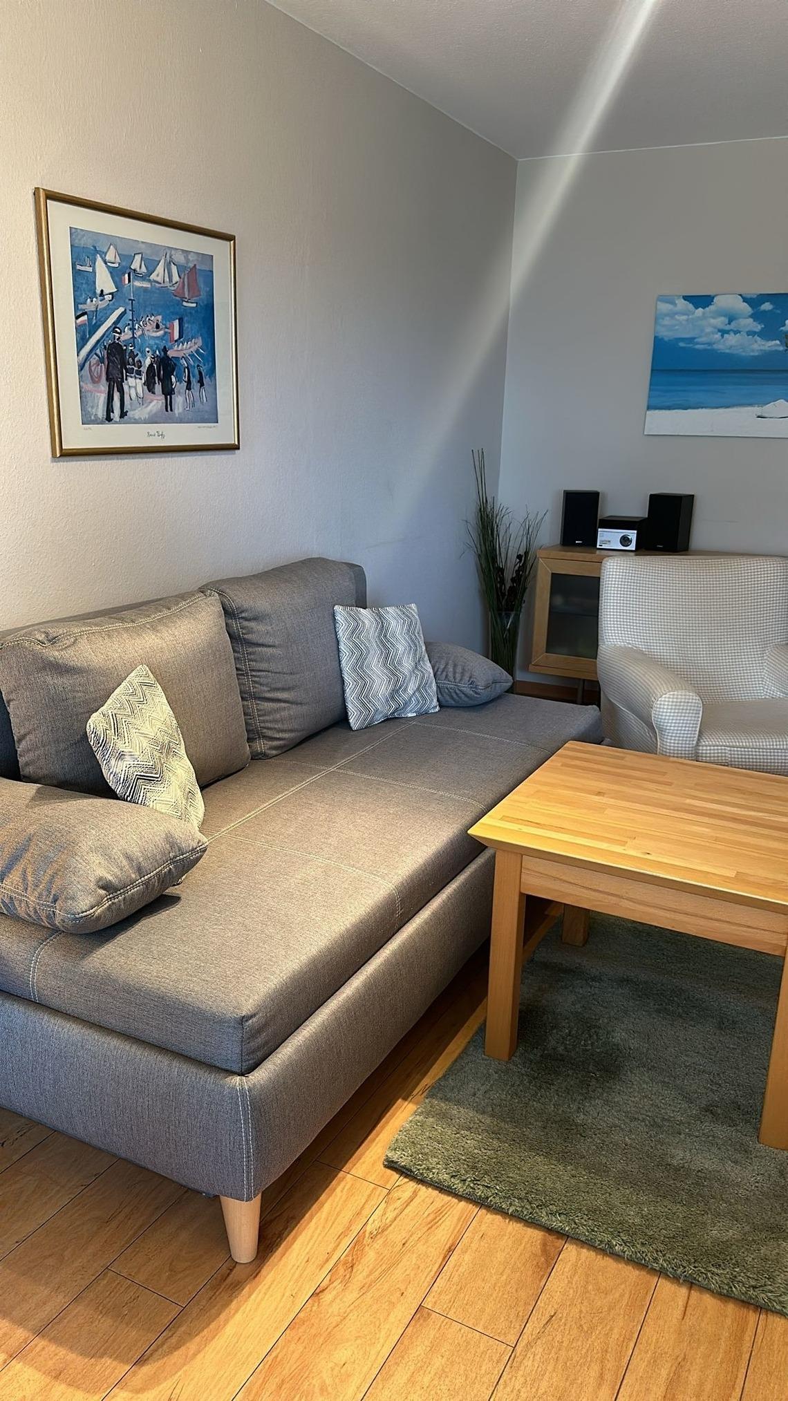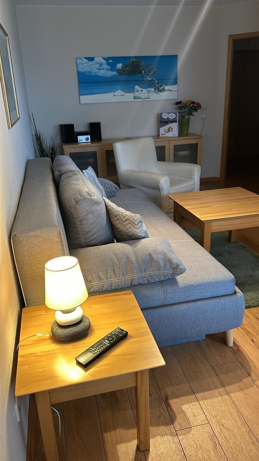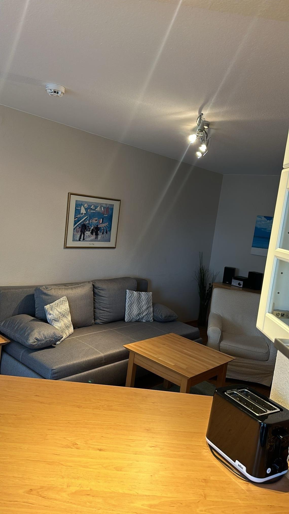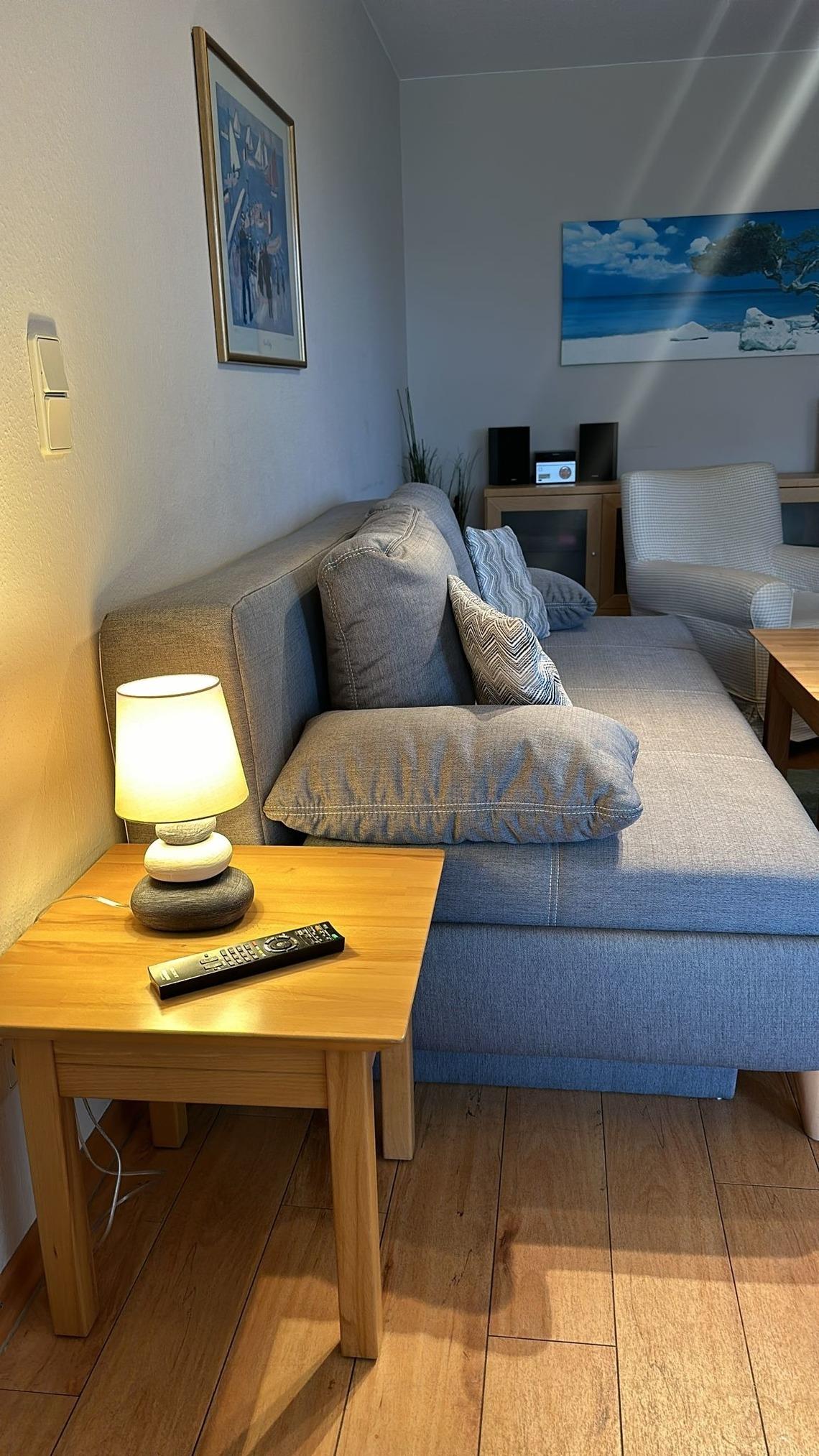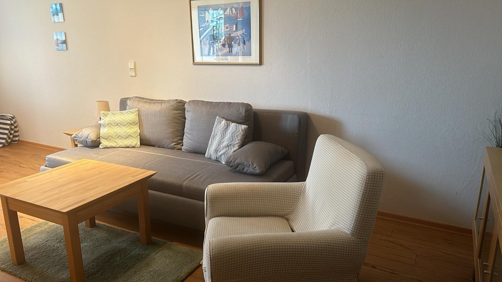 Das Appartement hat ein Wohnzimmer mit einer ausziehbaren Schlafcouch