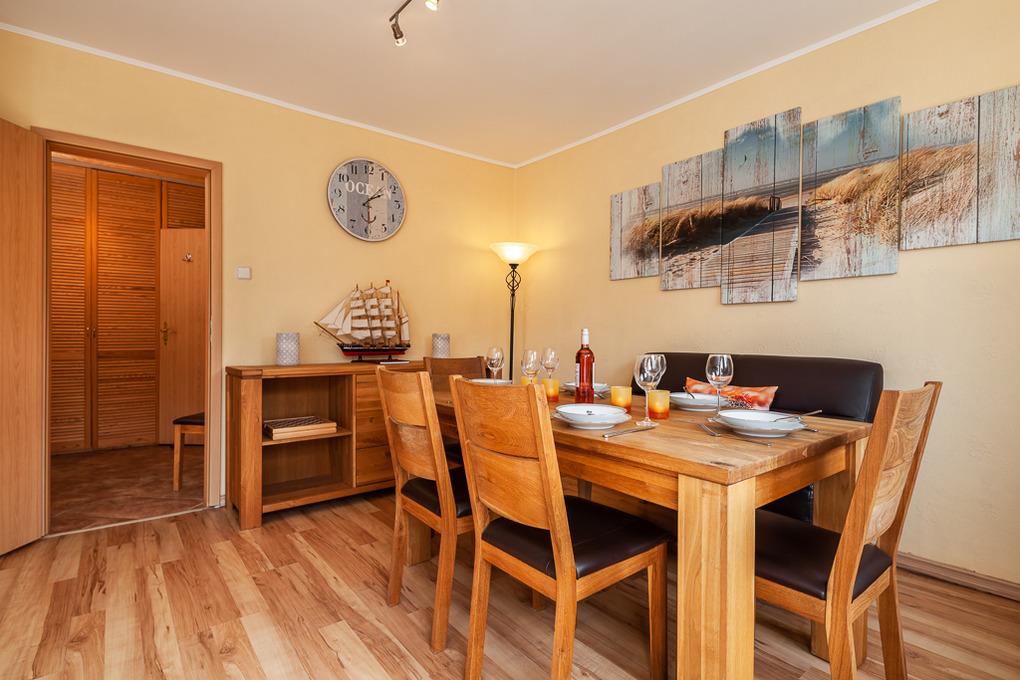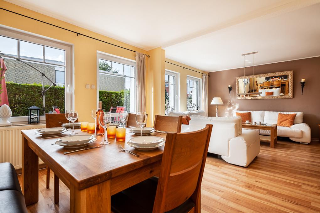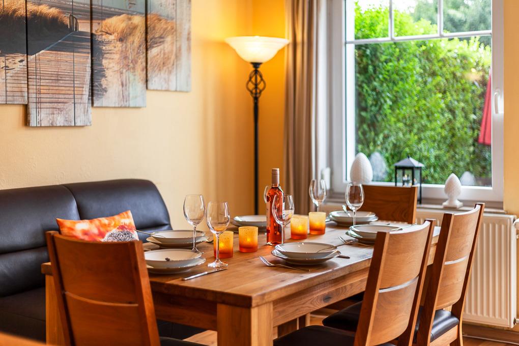 Im großen Wohnzimmer finden Sie eine gemütliche Leder-Couchgarnitur und den einladenden Essbereich für bis zu 5 Personen. Hier finden Sie außerdem einen Medienbereich mit Sat-TV, Radio, Leseecke und natürlich einen Internetanschluss. WLAN ist im gesamten Objekt und im Außenbereich kostenlos für Sie nutzbar.