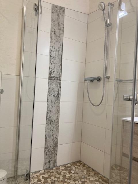 Ein modernes Badezimmer mit einer geräumigen ebenerdigen Dusche, beheizbarem Handtuchhalter und einem Föhn erwartet Sie.