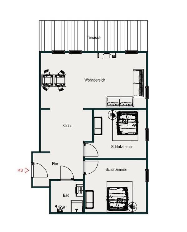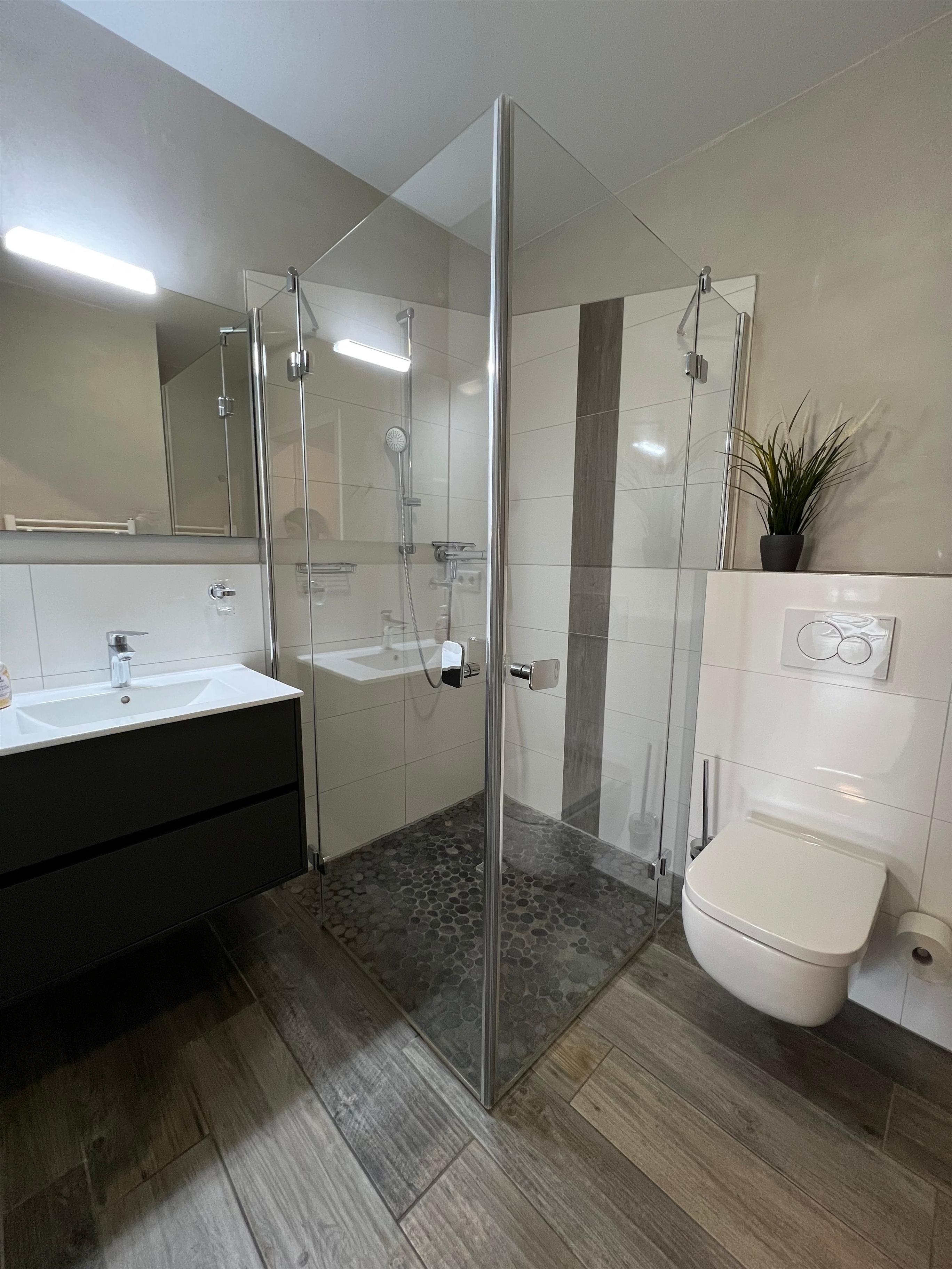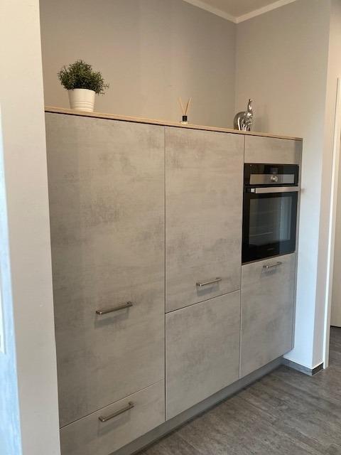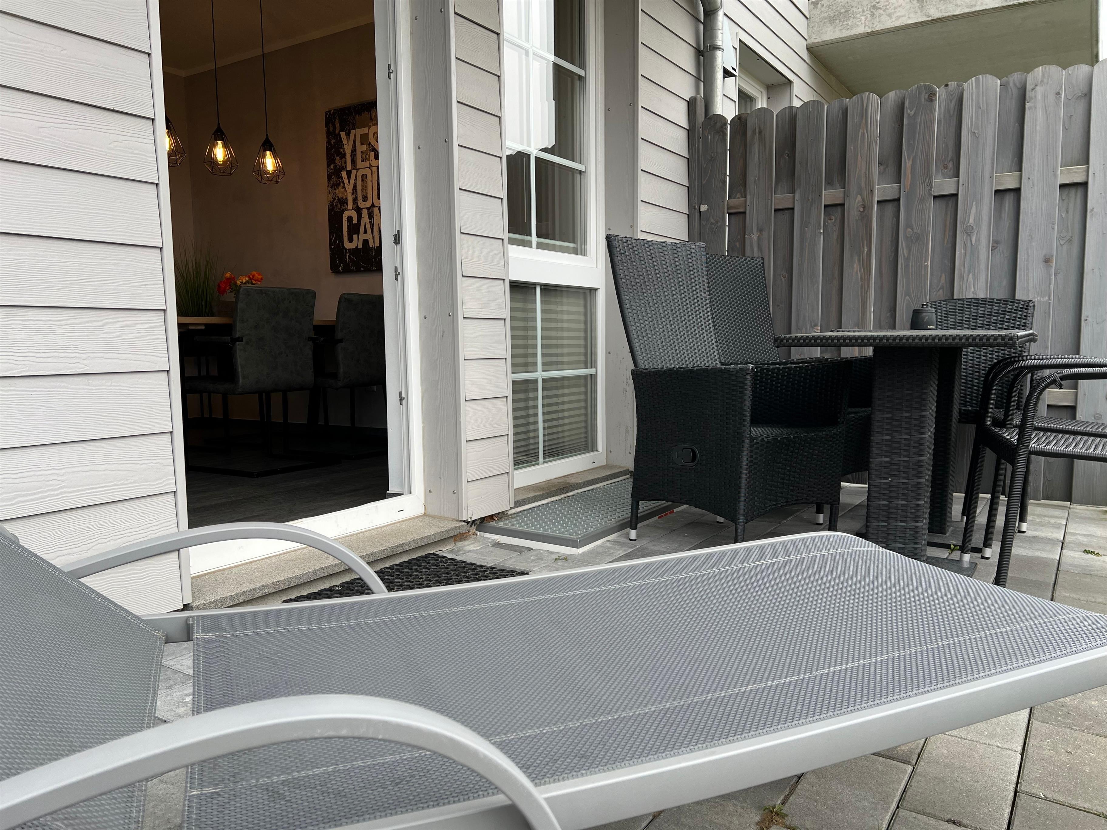 Die im Industrielook eingerichtete 71 qm große Ferienwohnung befindet sich im Erdgeschoss. Das Wohnzimmer ist mit einer hochwertigen Schlafcouch (160cm x 190cm) für weitere 2 Personen und mit einem großzügigen Esstisch mit sechs Stühlen ausgestattet und hat direktem Zugang zur Terrasse. Die offene Küche verfügt u.a. über einen Geschirrspüler, einen Herd mit Backofen auf Augenhöhe, einen Kühlschrank mit Gefrierfach, einen Wasserkocher, einen Kaffeeautomat und einen Toaster.