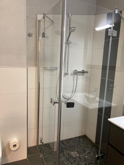 Das moderne Badezimmer bietet Ihnen eine geräumige ebenerdige Dusche, einen beheizbaren Handtuchhalter und einen Föhn.