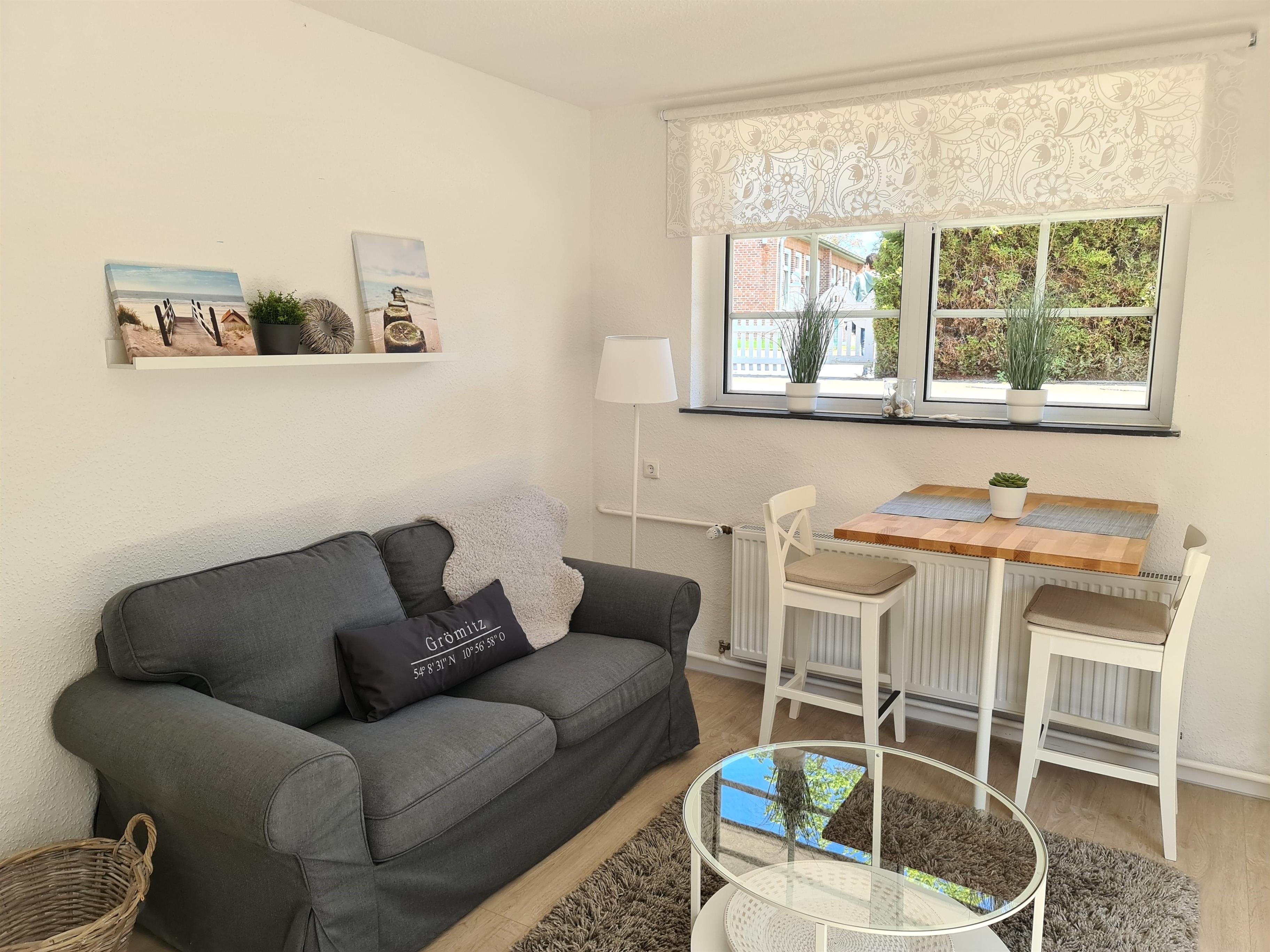 Im Wohnzimmer gibt es einen Esstisch für 2 Personen. Außerdem steht Ihnen neben einer gemütlichen Couch zum Verweilen auch ein Smart-TV zur Verfügung. Angrenzend an den offenen Wohnbereich befindet sich die neue, voll ausgestattete Küchenzeile mit Geschirrspüler und allen Annehmlichkeiten.