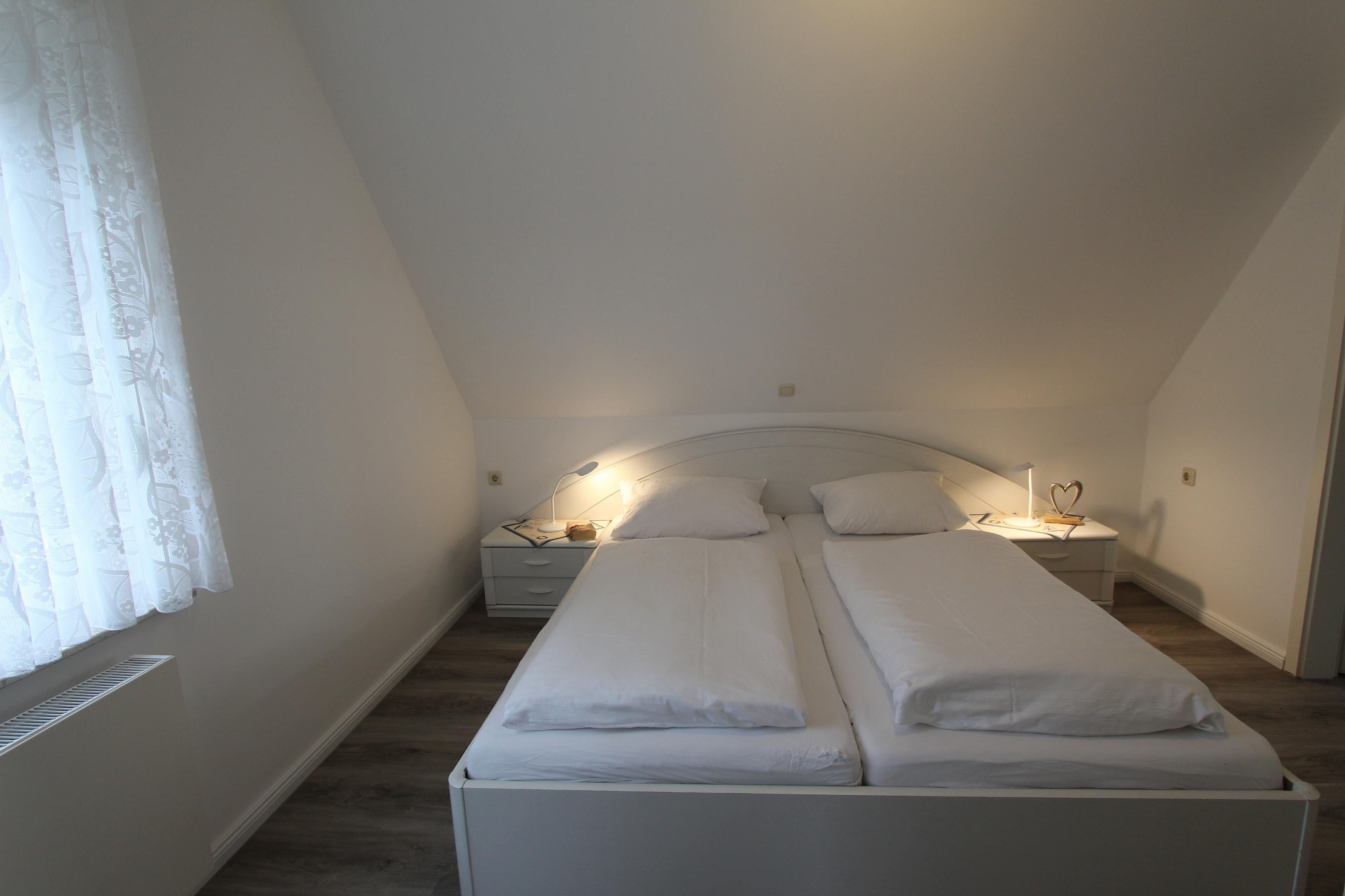 Im Schlafzimmer steht ein Doppelbett (190 x 200 cm) und ein Kleiderschrank.