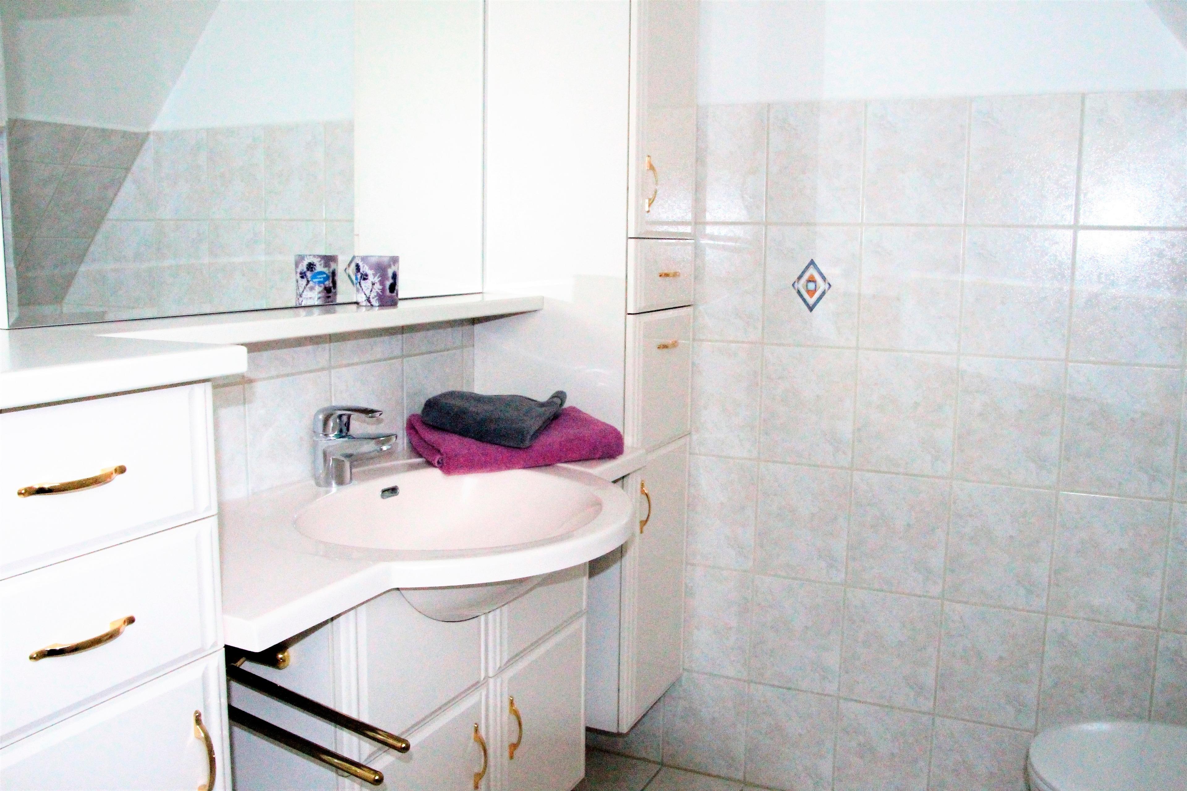 Das geräumige, geflieste Duschbad mit Spiegelschrank bietet genügend Stauraum.