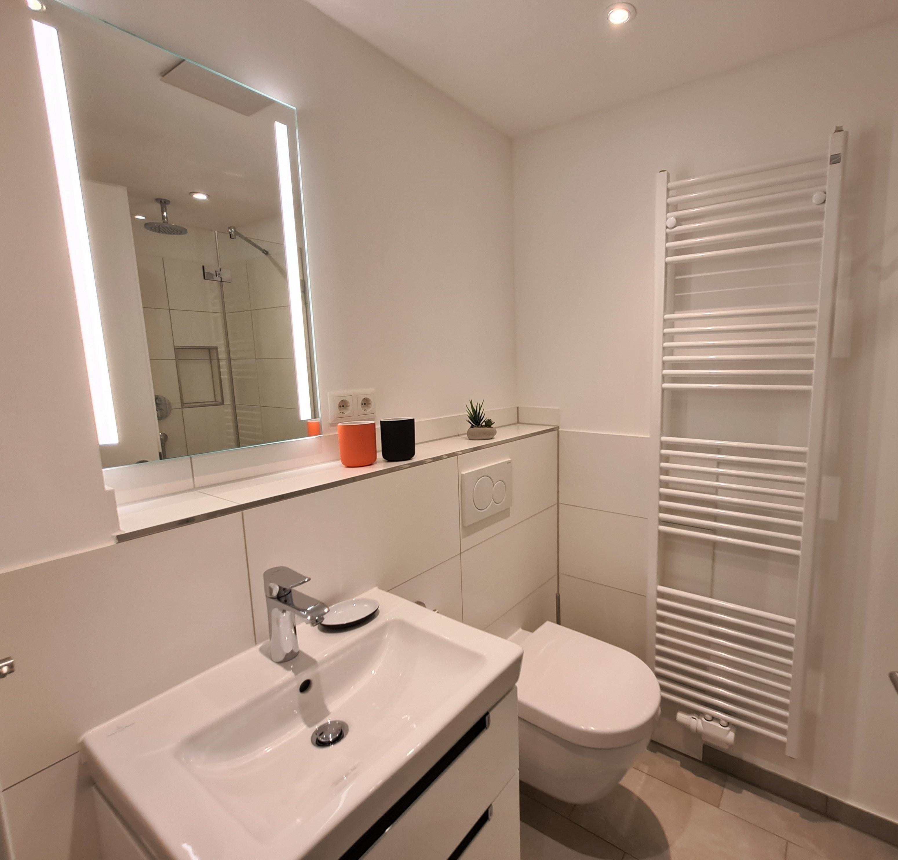 Im Badezimmer befindet sich eine ebenerdige Walk-in-Dusche, ein Waschbecken,ein Handtuchheizkörper, ein WC, ein Spiegel und ein Haartrockner.