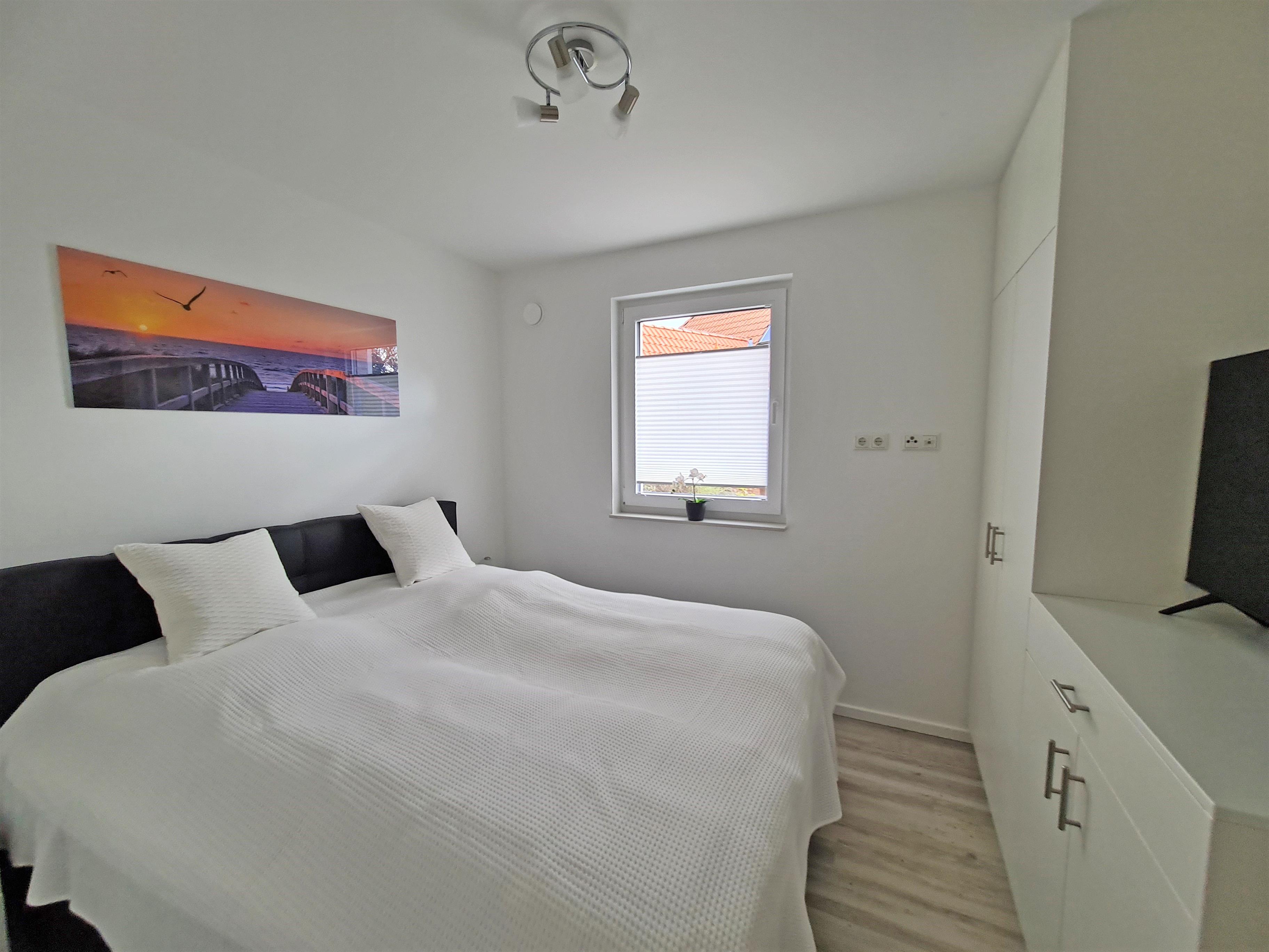 Im Schlafzimmer befindet sich ein 180x200 cm großes Doppelbett, Nachtschränke, eine Kommode sowie ein geräumiger Kleiderschrank. Außerdem steht Ihnen hier ein weiteres Smart-TV-Gerät zur Verfügung.