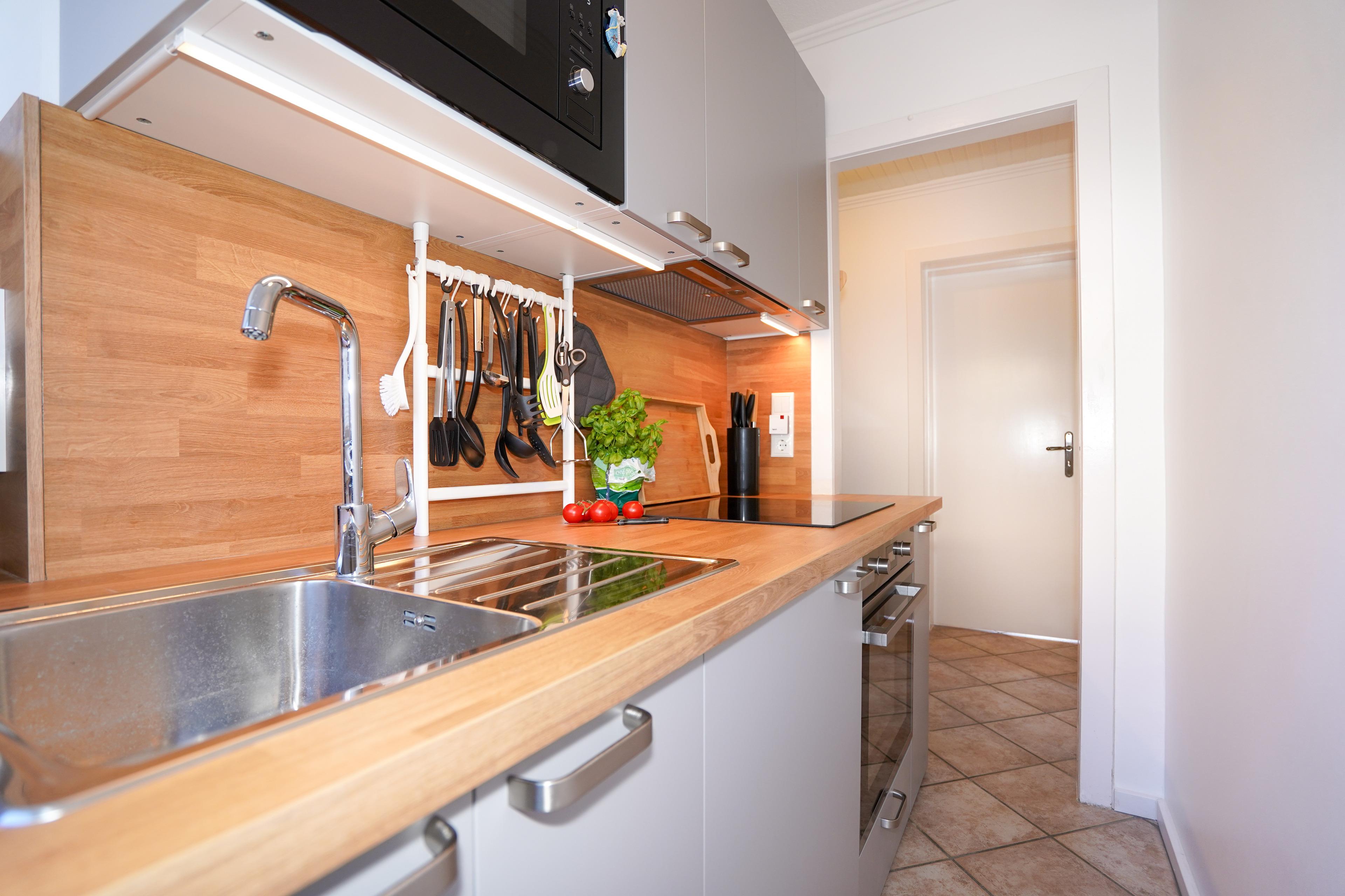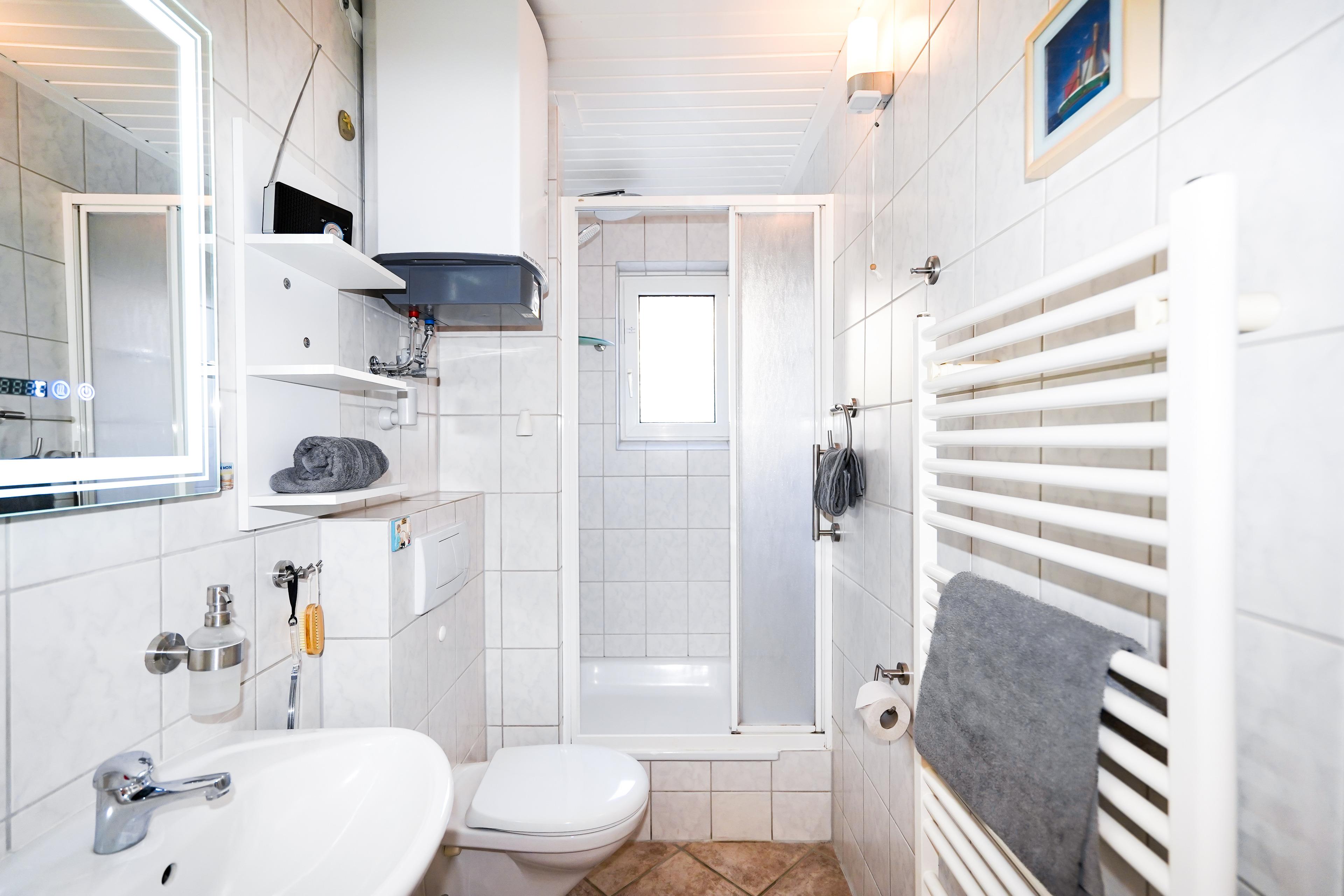 Die gut ausgestatte und im Frühjahr 2025 renovierte Unterkunft ist ca. 43 m² groß. Das Bad verfügt über eine Dusche, WC und einem modernen LED-Spiegel mit Uhr-, Temperaturanzeige und Antibeschlagfunktion. Das Schlafzimmer ist mit einem Doppelbett (2x90x200) und einem Kleiderschrank ausgestattet. An den Nachtschränkchen gibt es Ladestecker für USB A und USB C-Stecker. Außerdem können Sie Ihre Wertsachen in einem Tresor (im Wohnzimmer) mit Hotelstandard (eigener Code) deponieren. Die voll ausgestattete Küche ist neu und bietet Ihnen die Möglichkeit sich während Ihres Aufenthaltes gut zu versorgen. Im Wohnzimmer erwartet Sie eine bequeme Couch mit Schlafgelegenheit. Von hier aus gelangen Sie auf die Süd-West-Terrasse. Hier gibt es 3 Steckdosen für die E-Bike-Aufladung.