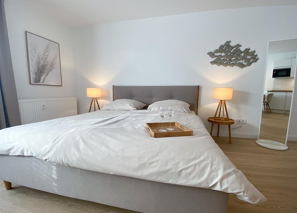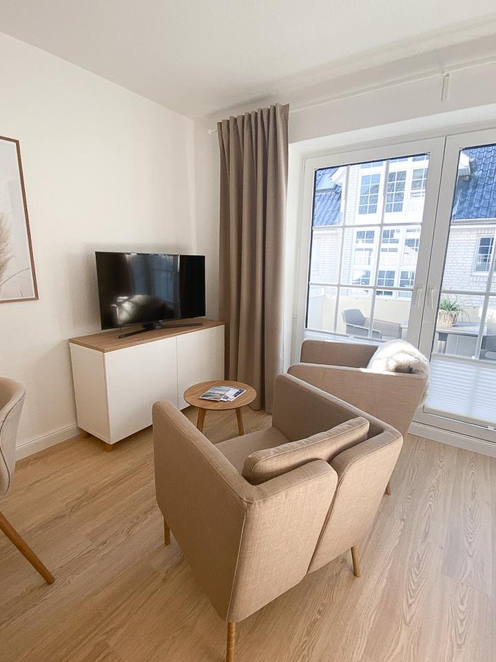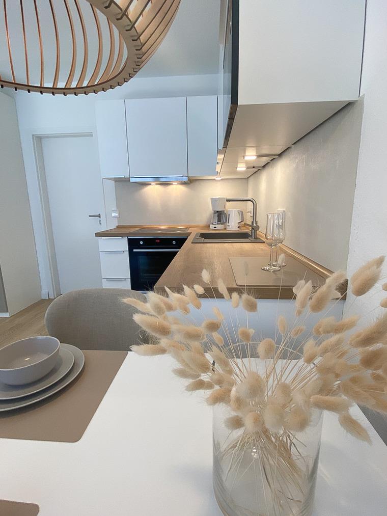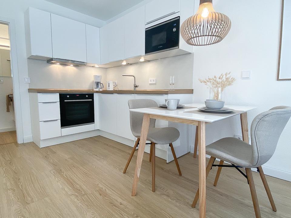 Die Wohnfläche der ca. 34qm großen Ferienwohnung verteilt sich auf einen Wohn/Schlafbereich mit integrierter offener und hochwertigen Einbauküche, über ein modernes Duschbad mit WC sowie ein möblierten Balkon mit Südwestlage.