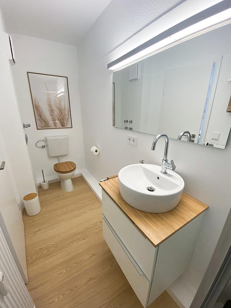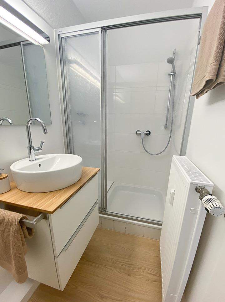 Das Badezimmer verfügt über ein WC, Dusche und einen Waschtischschrank mit viel Stauraum.