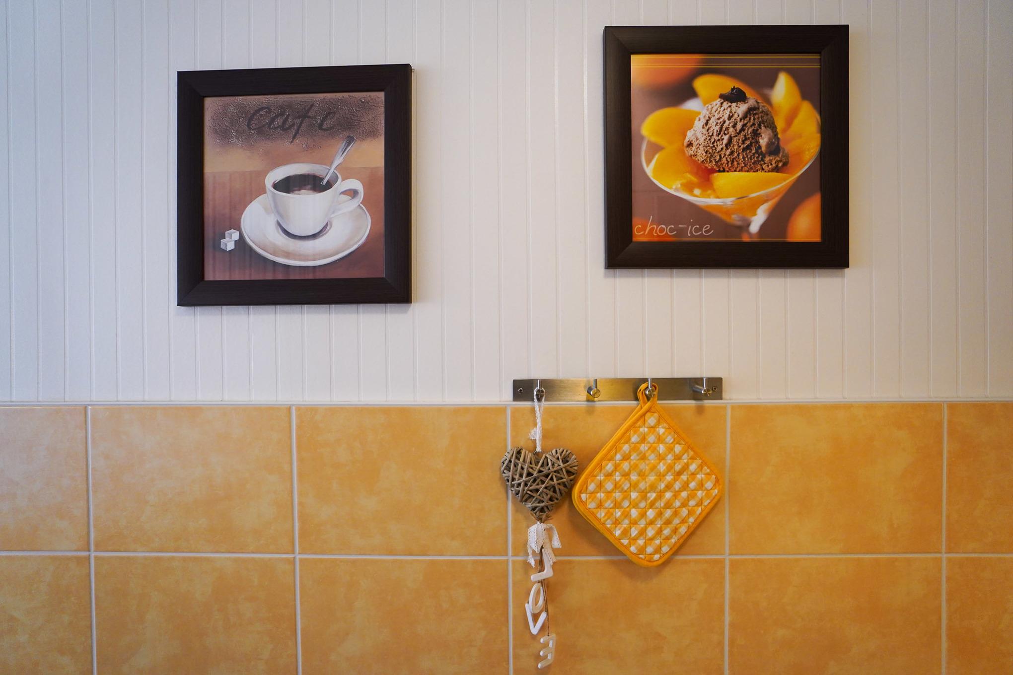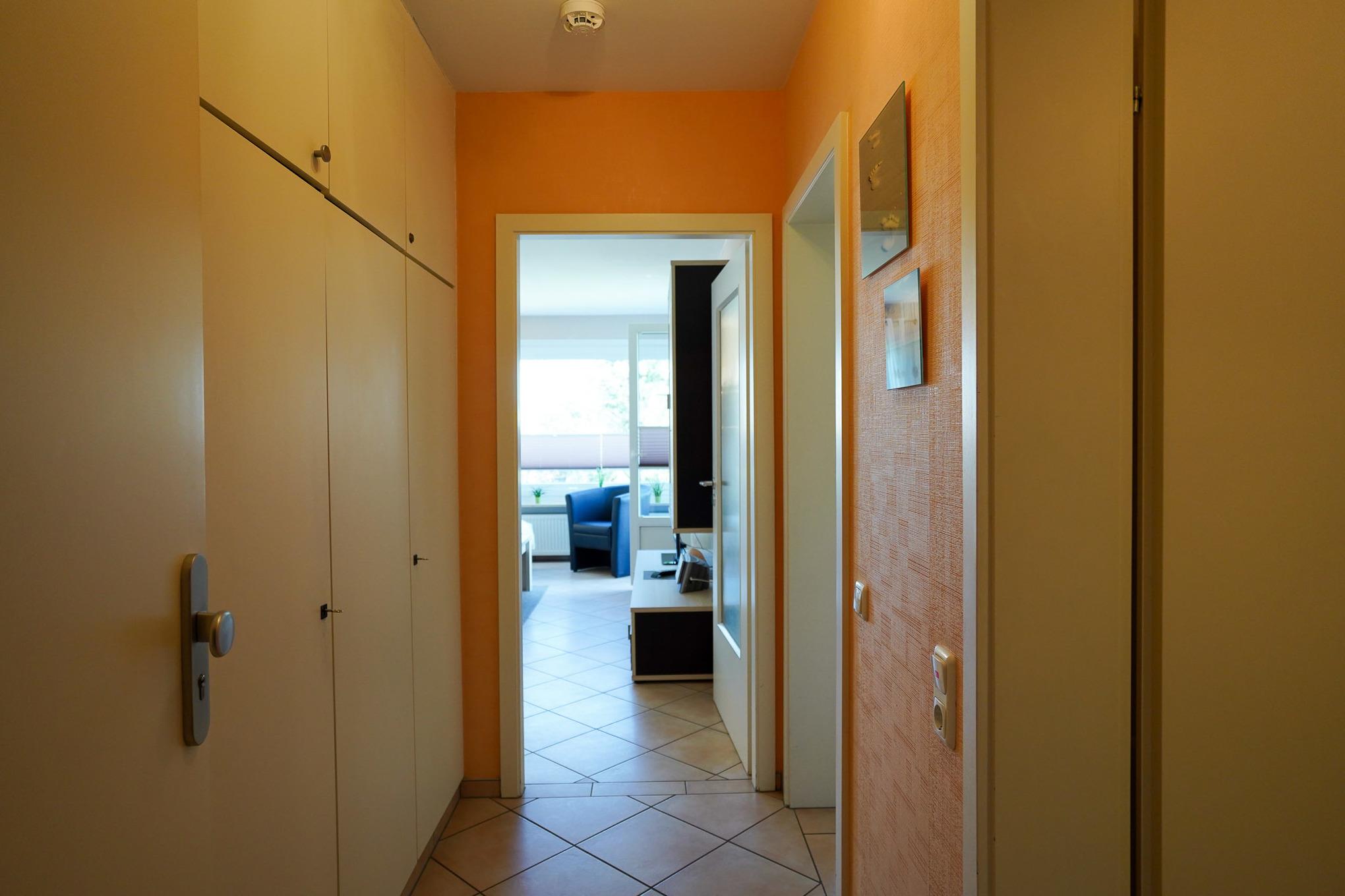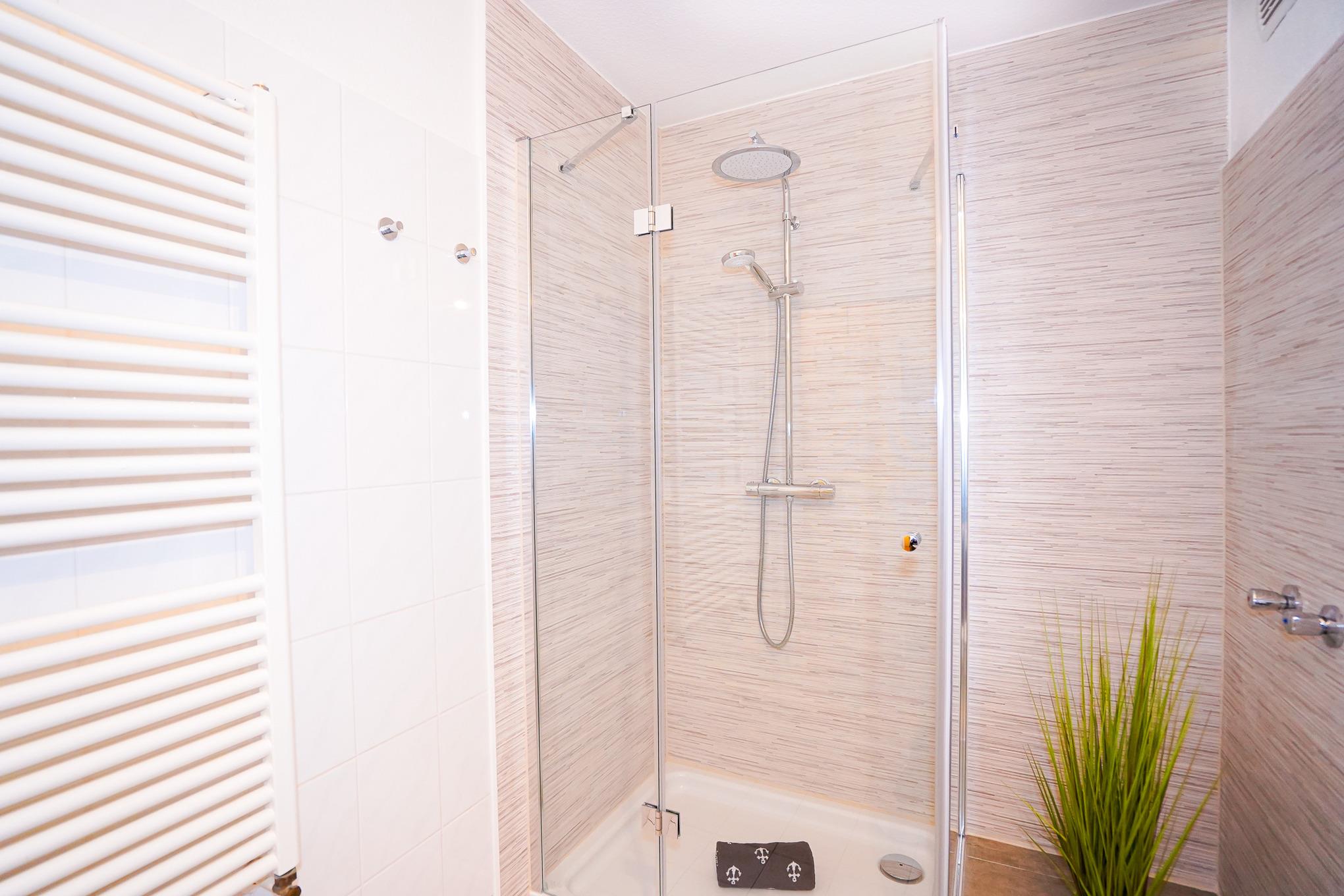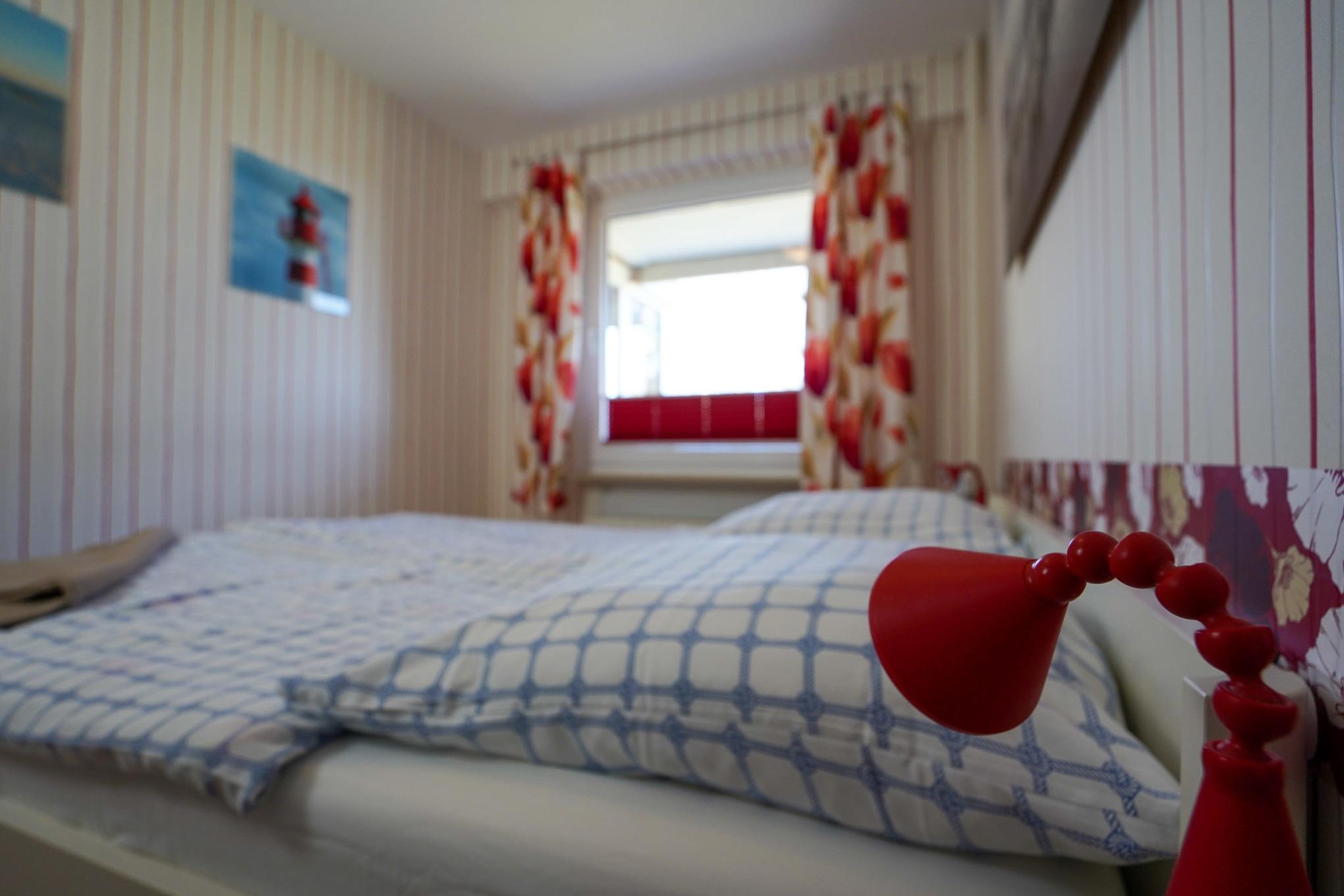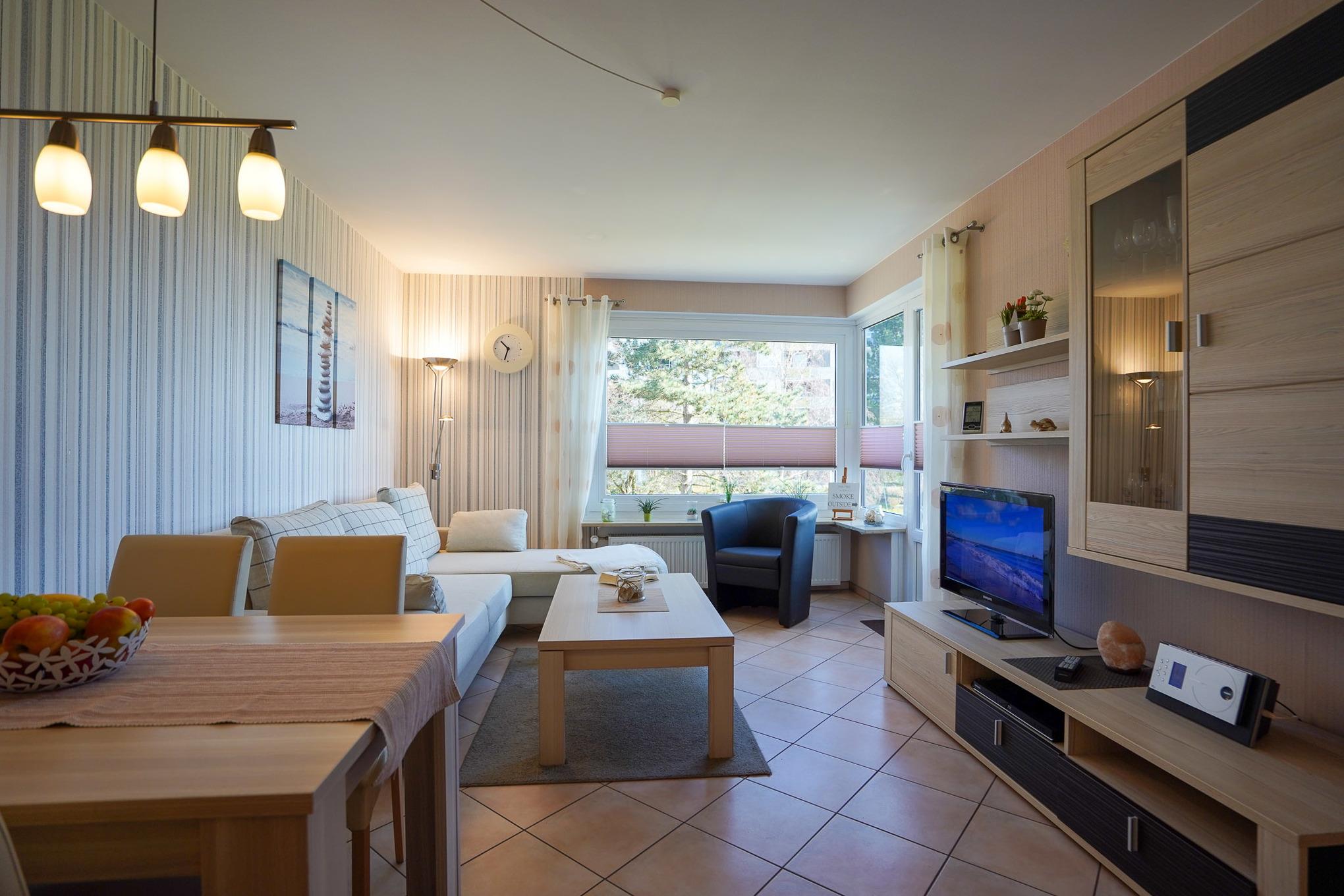 Zur Wohnung gelangen Sie über eine Treppe oder mit dem Fahrstuhl. In der Wohnung angekommen, erwartet Sie ein freundlicher und maritimer Eingangsbereich. Ein Schrank mit ausreichend Stauraum ist hier vorhanden. Gleich rechts kommen Sie in das Badezimmer mit WC, Waschbecken und Dusche. Weiter finden Sie das Schlafzimmer mit Doppelbett, Kleiderschrank und Kommode. Zurück auf den Flur geht es in den Wohnbereich. Die halb offen gestaltete Küche ist voll ausgestattet und bietet unter anderem ein Cerankochfeld, Backofen, Kühlschrank mit Gefrierfach, Mikrowelle und weitere kleine Küchenhelfer wie Kaffeemaschine, Wasserkocher und Toaster.