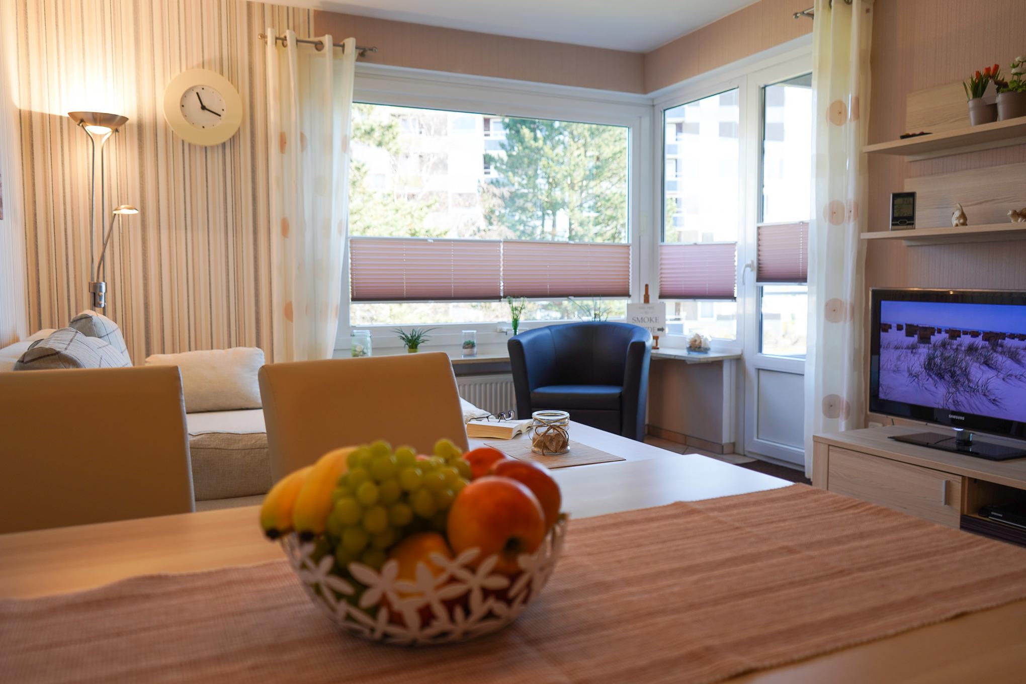 Das im Grömitz Flair eingerichtete Wohnzimmer bietet Ihnen eine hochwertige Schlafcouch zum ausklappen, einen großen Tisch mit 4 Stühlen und einen SAT-Flat-TV, der zu entspannten Abenden einlädt. Kostenloses WLAN ist in dieser Wohnung selbstverständlich vorhanden. Erholen Sie sich nach einem aufregenden Urlaubstag auf dem eigenen Balkon mit Blick auf die Ostsee. Verdunklungsmöglichkeiten sind in der Wohnung vorhanden.