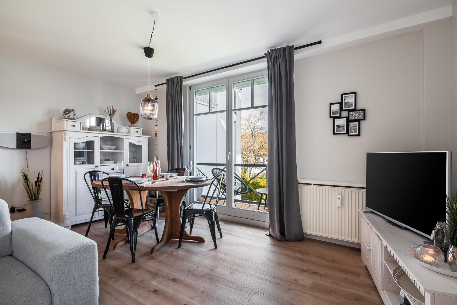 Der komfortable und helle Wohn- und Essbereich, mit direktem Zugang zu einem der zwei Balkone, ist mit einer gemütlichen Eck-Schlafcouch, Couchtisch, Leselampe, einem großen Esstisch mit 4 Stühlen sowie einem Hochstuhl für den kleinsten Gast ausgestattet. Um die eigene Musik abzuspielen, zum Beispiel vom Smartphone, ergänzt eine Stereoanlage mit Bluetooth die Einrichtung. Der große internetfähige Fernseher mit Blu Ray Player, die Spielekonsole und das kostenlose WLAN sorgen für Unterhaltung bei Groß und Klein.