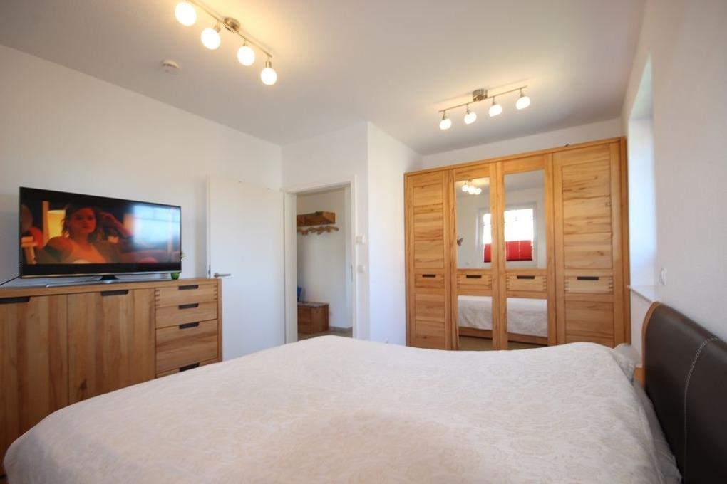Das Schlafzimmer verfügt über ein komfortables Ehebett & Kleiderschrank sowie TV-Gerät.