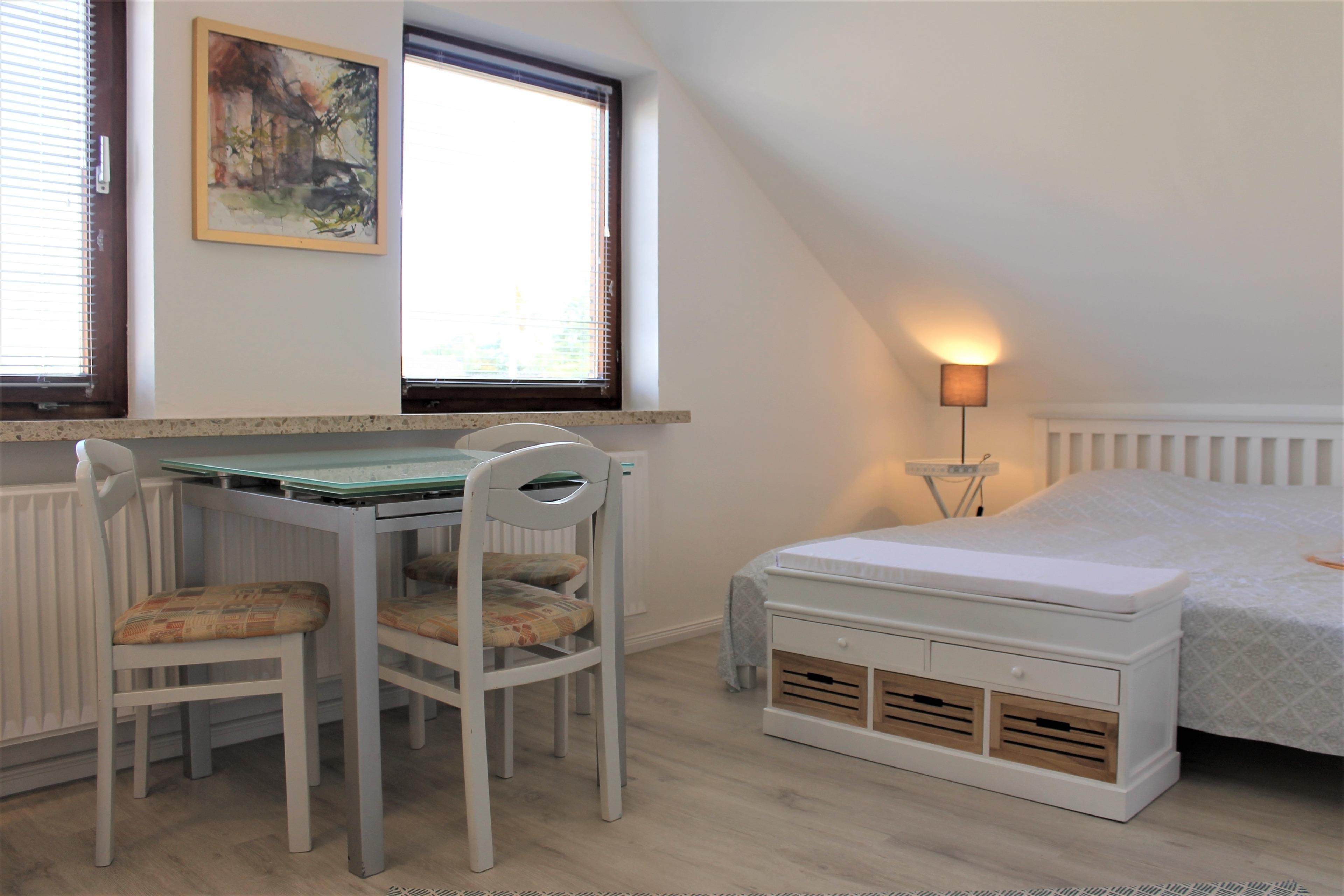 Die Ferienwohnung besitzt 1 Wohnschlafzimmer und ist ausgestattet mit Doppelbetten. Sie haben ein Auto dabei? Ein PKW - Stellplatz gehört zu der Ferienwohnung.