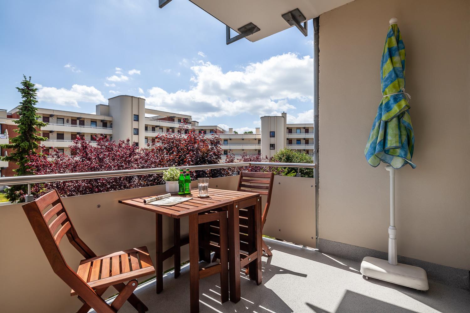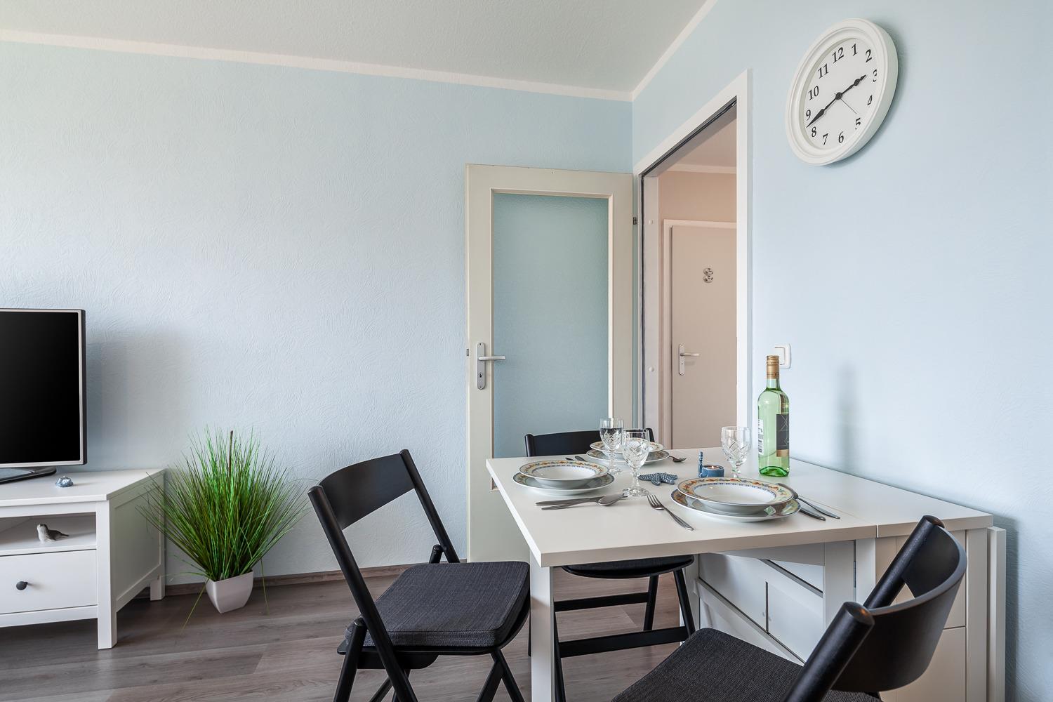 Das Wohnzimmer ist mit einer neuwertigen Schlafcouch, einem Esstisch und einem großen Fernseher ausgestattet. Auf dem Balkon, welcher über einen Tisch mit Stühlen verfügt, können Sie die Sonne genießen. Ein teilweiser Seeblick ist hier inbegriffen. Die kleine separate Küche beinhaltet alle notwendigen Küchengeräte.